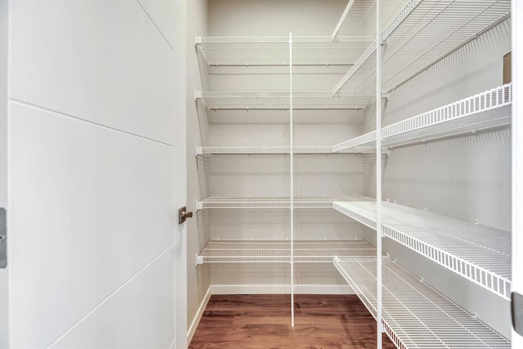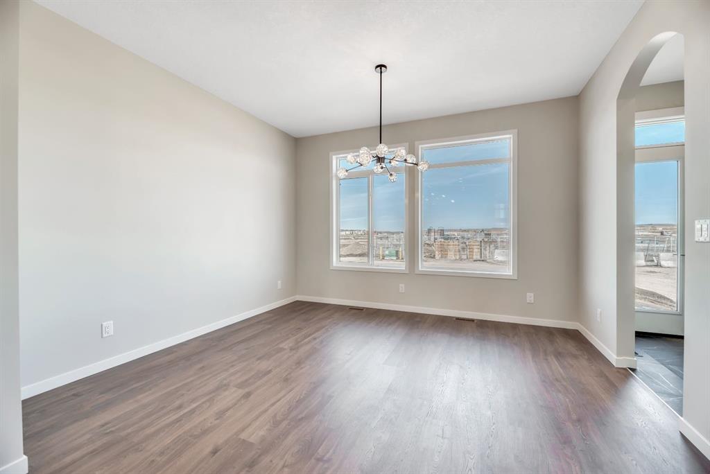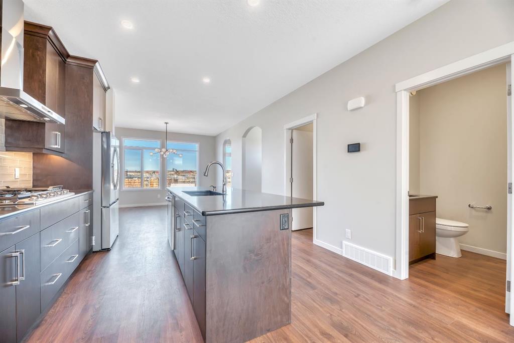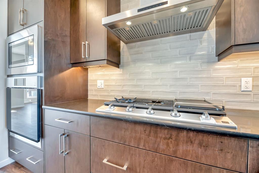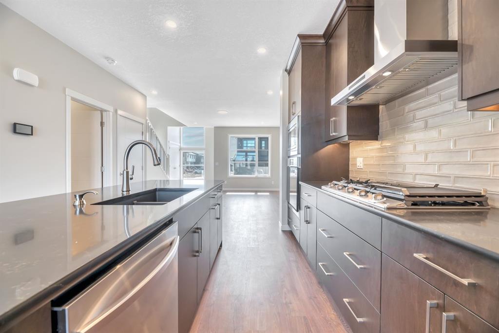 Step inside to a bright, open-concept main floor where walnut-toned luxury vinyl plank flooring flows seamlessly throughout. The spacious great room is anchored by a sleek electric fireplace, creating a warm and inviting atmosphere. At the heart of the home, the stunning central kitchen is designed to impress with a large island, upgraded quartz countertops, tile backsplash, flat-panel wood grain cabinetry, and premium appliance package including a 5-burner gas cooktop, built-in wall oven, and microwave. Thoughtful upgrades such as under-cabinet lighting, pots and pan drawers, and garburator enhance both style and functionality.