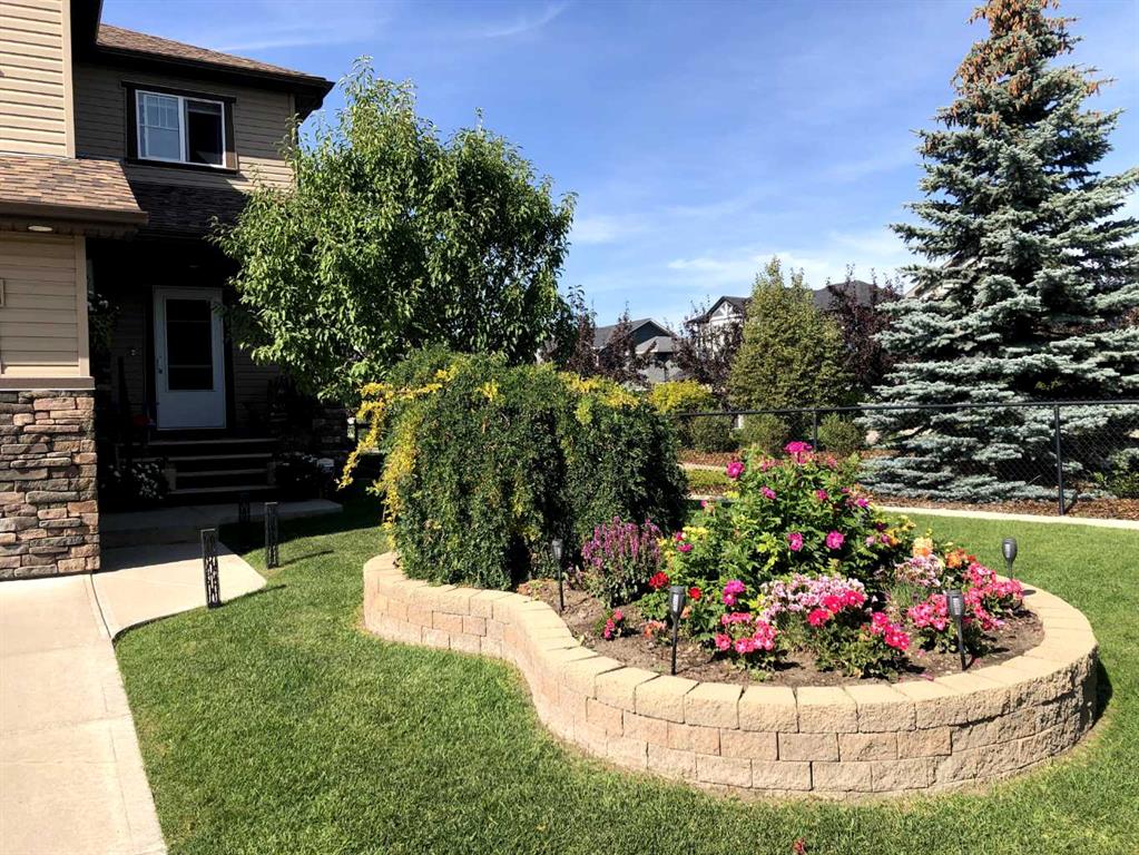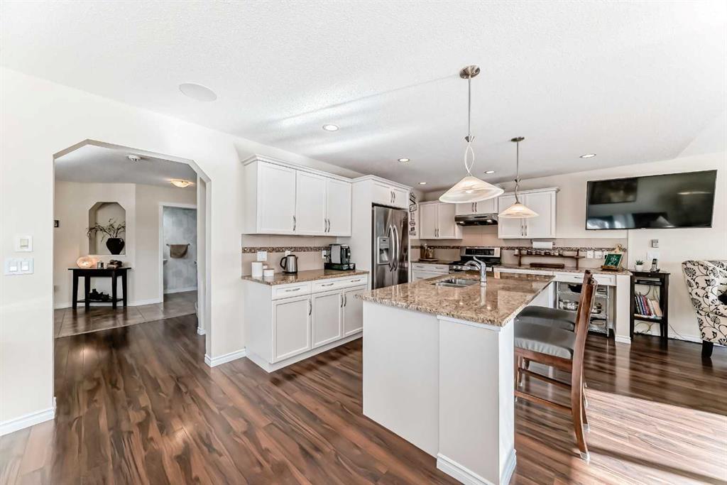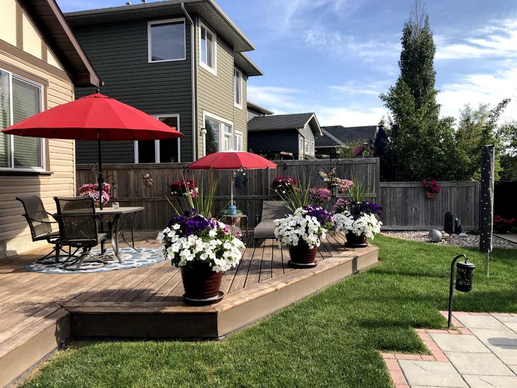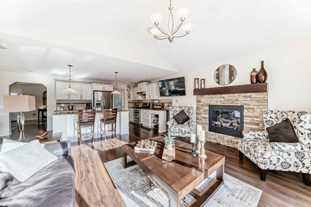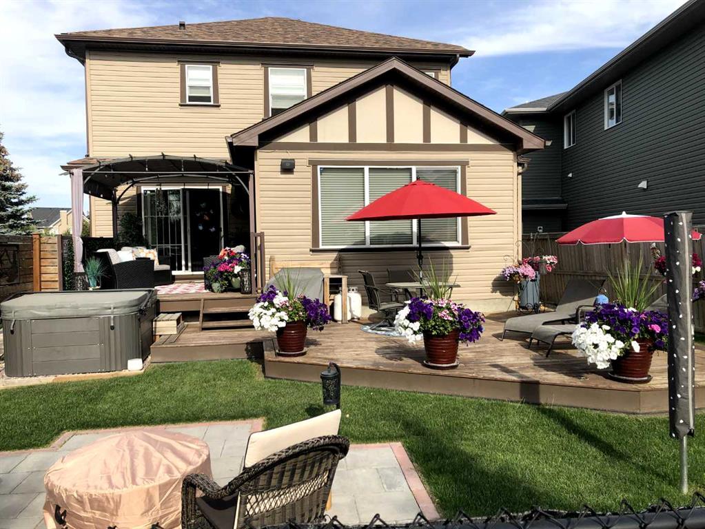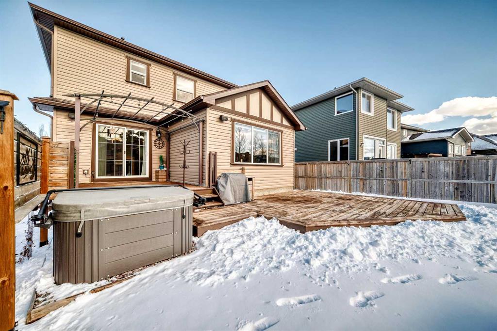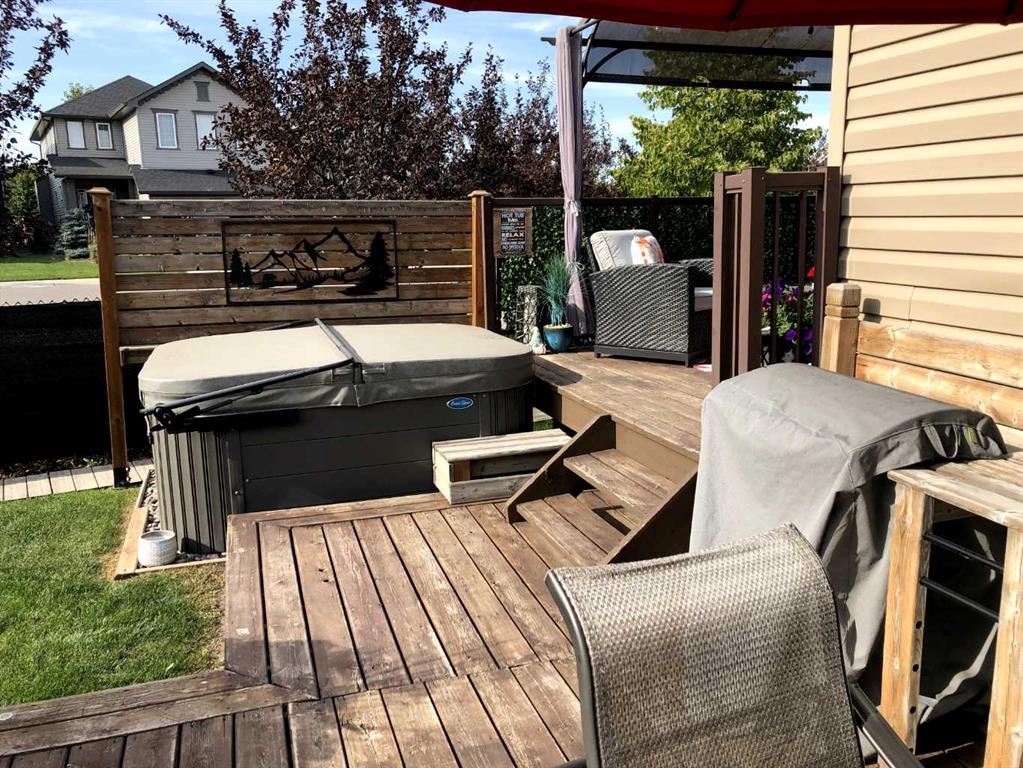 Welcome to this 4 bdrm, 3.5 bath, fully finished, immaculate one-owner home, built by Mckee Homes, in the beautiful, family-friendly, sought-after community of Ravenswood Airdrie. Situated with city greenspace to the north (no shovelling), walking paths behind, with a large sun-catching south/west-facing yard and a 2-tiered deck. With over 2,900 sq ft of finished living space and the flex/poss 5th bdrm in the basement, there is room here for a growing family. Walking in, you will love the open concept, which includes a 2-piece bath to the left, a door to the mudroom that connects to the laundry room, pantry and kitchen, and the garage entrance. Ahead is an office space, then into the open kitchen, dining and living room area. Large south/west windows fill the rooms with an abundance of natural light. The kitchen is for someone who loves to cook and entertain with modern white cabinetry, granite counters with ample counter space and an island. SS appliances, a 5-burner gas stove, a DBL Door refrigerator w water and ice maker and a large pantry make this plan ideal. The living room is vaulted and has a cozy gas fireplace with a fan and a stone front, and the dining area will fit a large table for family meals. Then through the sliding patio doors onto an extra-large 2-tiered deck w a hot tub, paved patio area with a firepit, privacy screen, extra power outlets, and a huge backyard for gardening and entertaining. Upstairs is a vaulted, bright bonus room, perfect for an extra TV room or play area for the kids. 3 bedrooms and 2 bathrooms. All the rooms are a good size, with the primary large enough to fit not only a king-size bed but also all your large bedroom furniture and your extensive wardrobe in the walk-in closet. The ensuite is very spacious with dual vanities on a long counter, a large separate