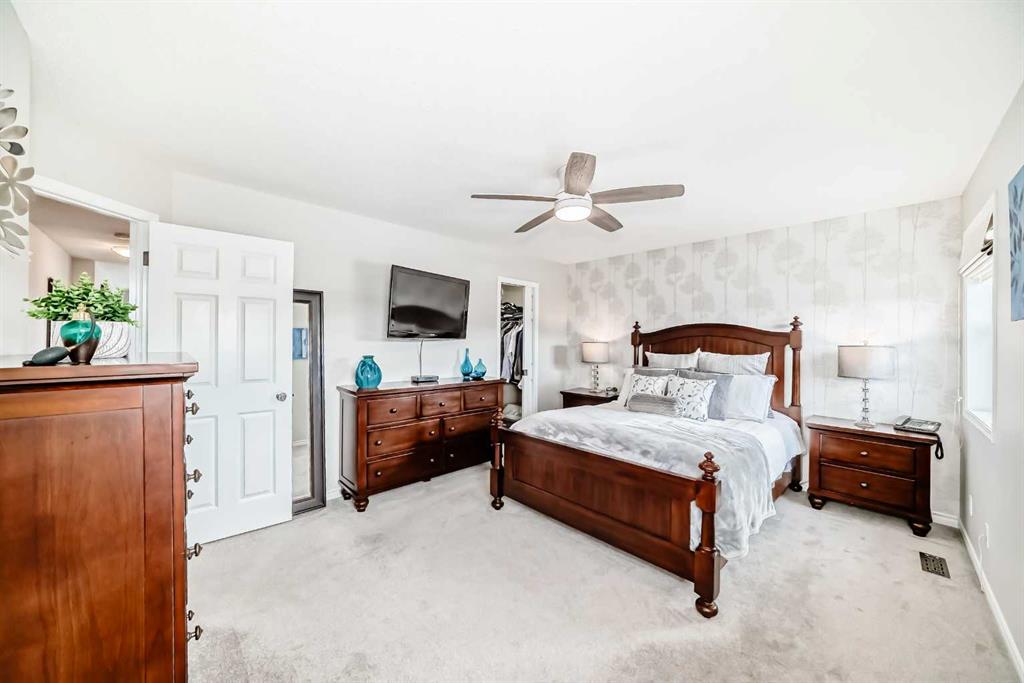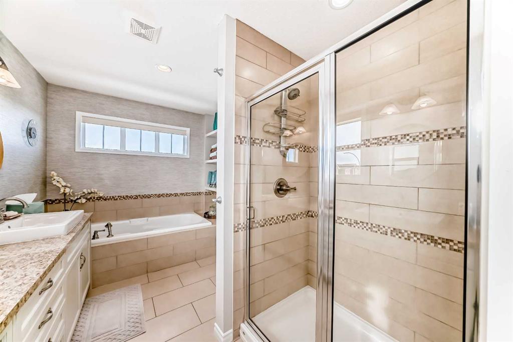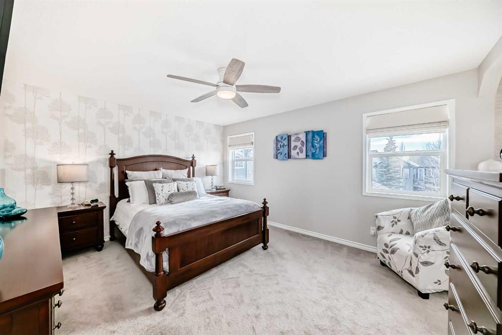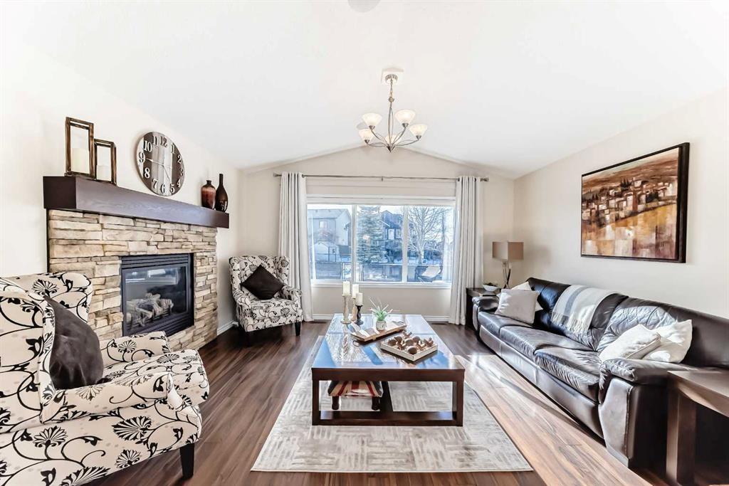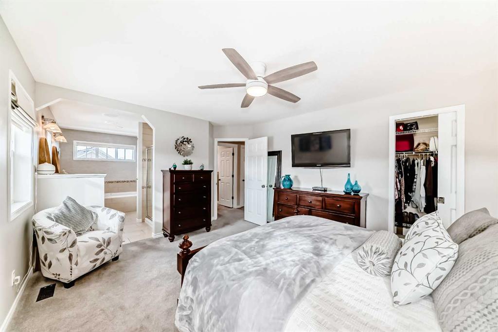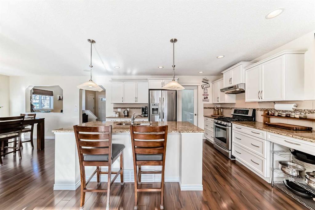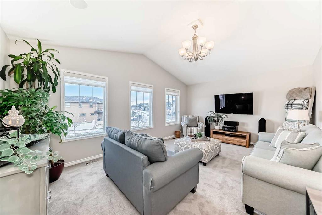 Welcome to this 4 bdrm, 3.5 bath, fully finished, immaculate one-owner home, built by Mckee Homes, in the beautiful, family-friendly, sought-after community of Ravenswood Airdrie. Situated with city greenspace to the north (no shovelling), walking paths behind, with a large sun-catching south/west-facing yard and a 2-tiered deck. With over 2,900 sq ft of finished living space and the flex/poss 5th bdrm in the basement, there is room here for a growing family. Walking in, you will love the open concept, which includes a 2-piece bath to the left, a door to the mudroom that connects to the laundry room, pantry and kitchen, and the garage entrance. Ahead is an office space, then into the open kitchen, dining and living room area. Large south/west windows fill the rooms with an abundance of natural light. The kitchen is for someone who loves to cook and entertain with modern white cabinetry, granite counters with ample counter space and an island. SS appliances, a 5-burner gas stove, a DBL Door refrigerator w water and ice maker and a large pantry make this plan ideal. The living room is vaulted and has a cozy gas fireplace with a fan and a stone front, and the dining area will fit a large table for family meals. Then through the sliding patio doors onto an extra-large 2-tiered deck w a hot tub, paved patio area with a firepit, privacy screen, extra power outlets, and a huge backyard for gardening and entertaining. Upstairs is a vaulted, bright bonus room, perfect for an extra TV room or play area for the kids. 3 bedrooms and 2 bathrooms. All the rooms are a good size, with the primary large enough to fit not only a king-size bed but also all your large bedroom furniture and your extensive wardrobe in the walk-in closet. The ensuite is very spacious with dual vanities on a long counter, a large separate