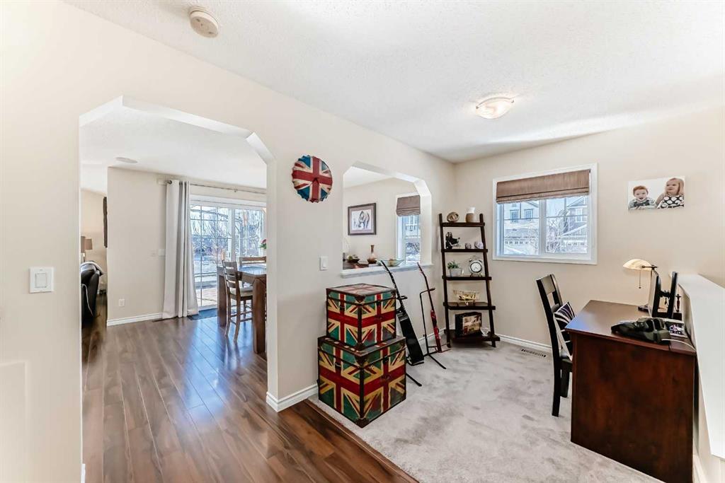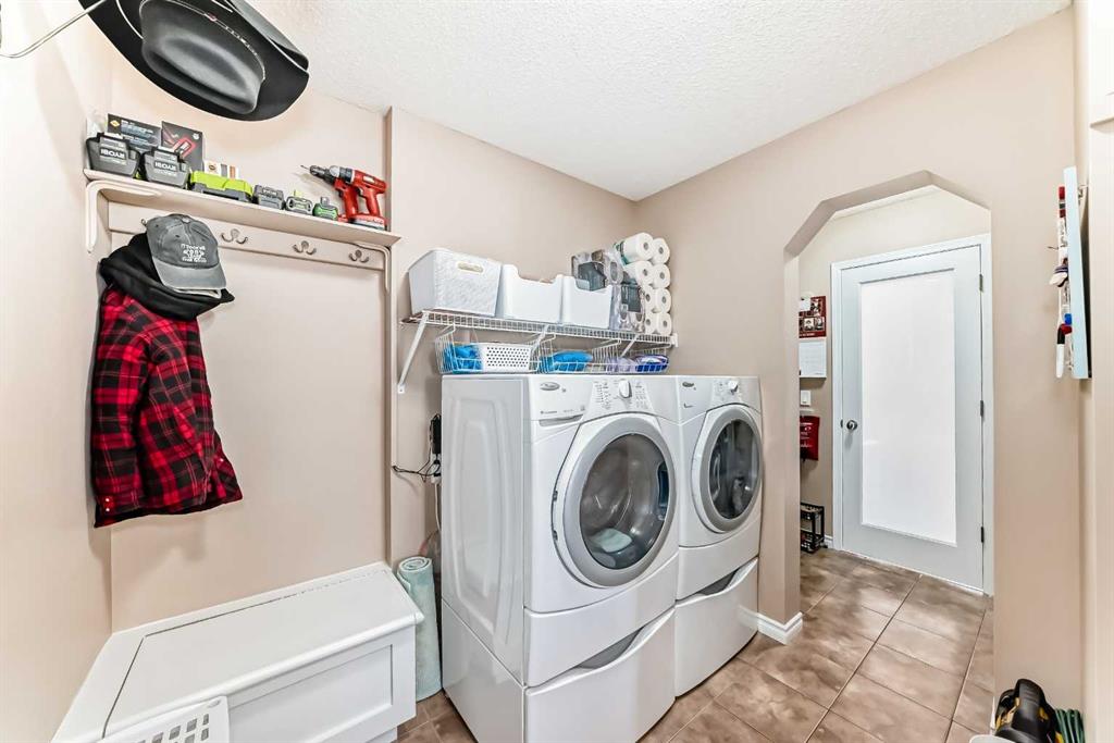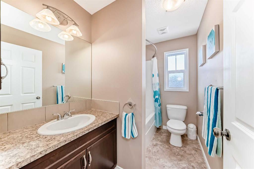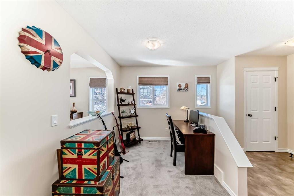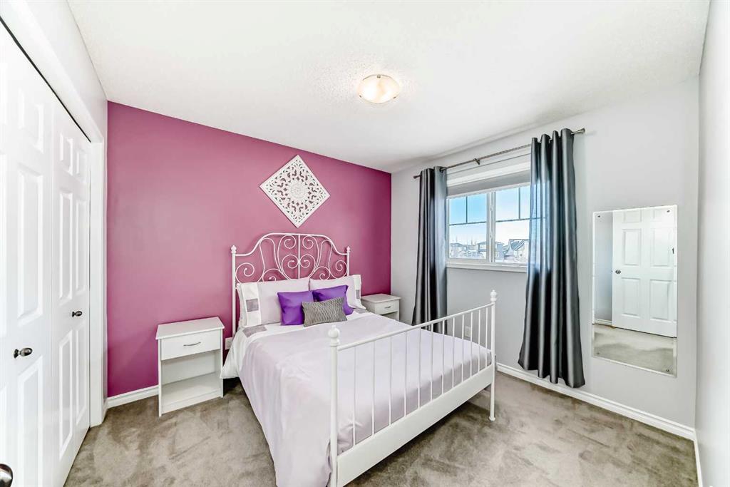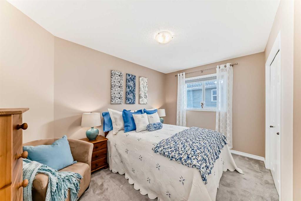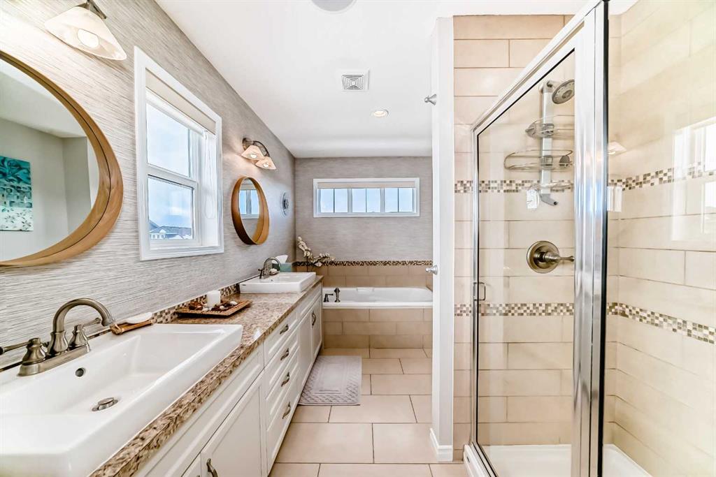 Welcome to this 4 bdrm, 3.5 bath, fully finished, immaculate one-owner home, built by Mckee Homes, in the beautiful, family-friendly, sought-after community of Ravenswood Airdrie. Situated with city greenspace to the north (no shovelling), walking paths behind, with a large sun-catching south/west-facing yard and a 2-tiered deck. With over 2,900 sq ft of finished living space and the flex/poss 5th bdrm in the basement, there is room here for a growing family. Walking in, you will love the open concept, which includes a 2-piece bath to the left, a door to the mudroom that connects to the laundry room, pantry and kitchen, and the garage entrance. Ahead is an office space, then into the open kitchen, dining and living room area. Large south/west windows fill the rooms with an abundance of natural light. The kitchen is for someone who loves to cook and entertain with modern white cabinetry, granite counters with ample counter space and an island. SS appliances, a 5-burner gas stove, a DBL Door refrigerator w water and ice maker and a large pantry make this plan ideal. The living room is vaulted and has a cozy gas fireplace with a fan and a stone front, and the dining area will fit a large table for family meals. Then through the sliding patio doors onto an extra-large 2-tiered deck w a hot tub, paved patio area with a firepit, privacy screen, extra power outlets, and a huge backyard for gardening and entertaining. Upstairs is a vaulted, bright bonus room, perfect for an extra TV room or play area for the kids. 3 bedrooms and 2 bathrooms. All the rooms are a good size, with the primary large enough to fit not only a king-size bed but also all your large bedroom furniture and your extensive wardrobe in the walk-in closet. The ensuite is very spacious with dual vanities on a long counter, a large separate