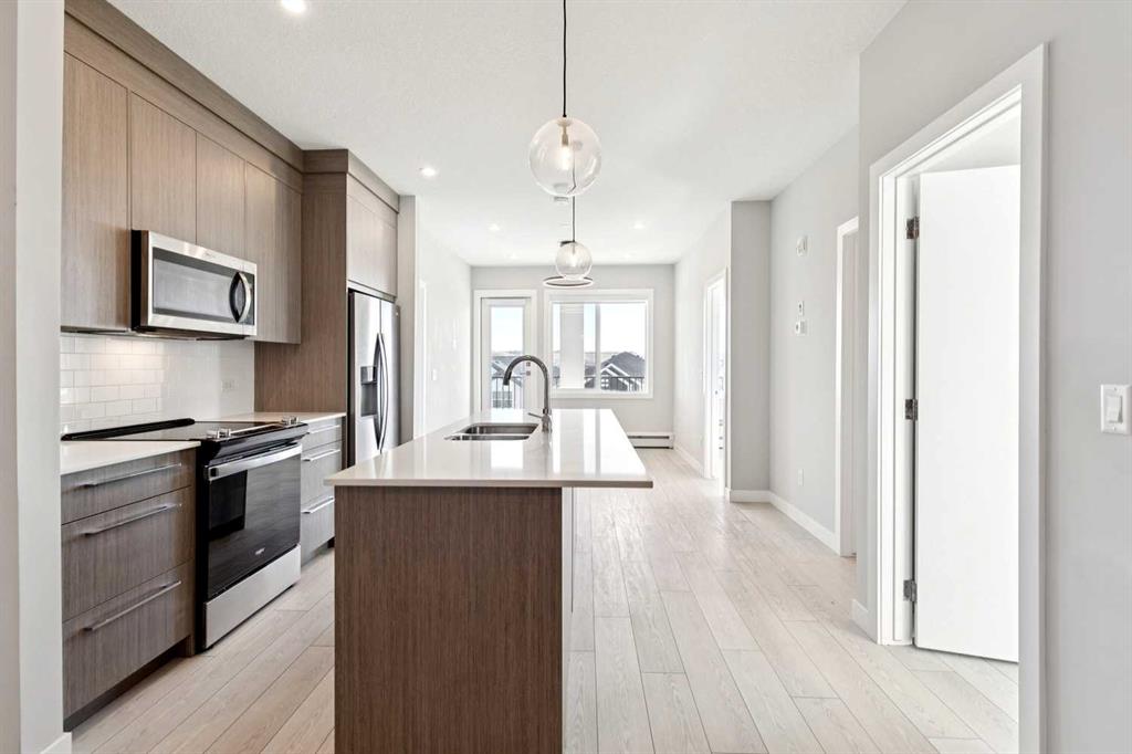 Inside, modern finishes and quality craftsmanship stand out. High ceilings and luxury vinyl plank flooring create a sleek, contemporary feel, while the kitchen is beautifully appointed with quartz countertops, full-height soft-close cabinetry, stainless steel appliances, and a functional eat-up bar — perfect for entertaining.