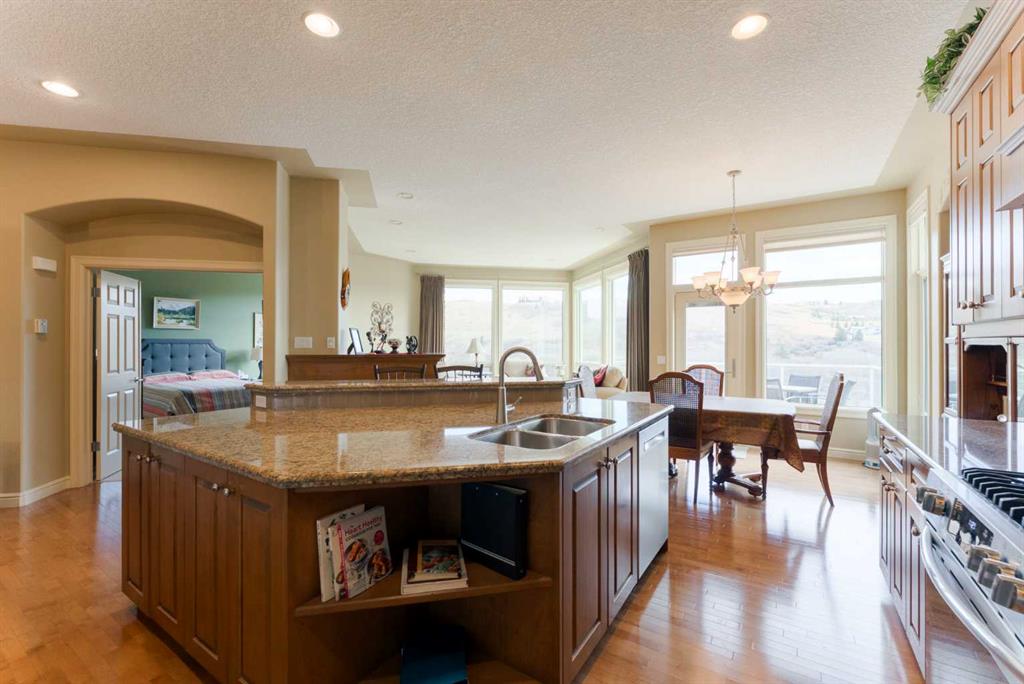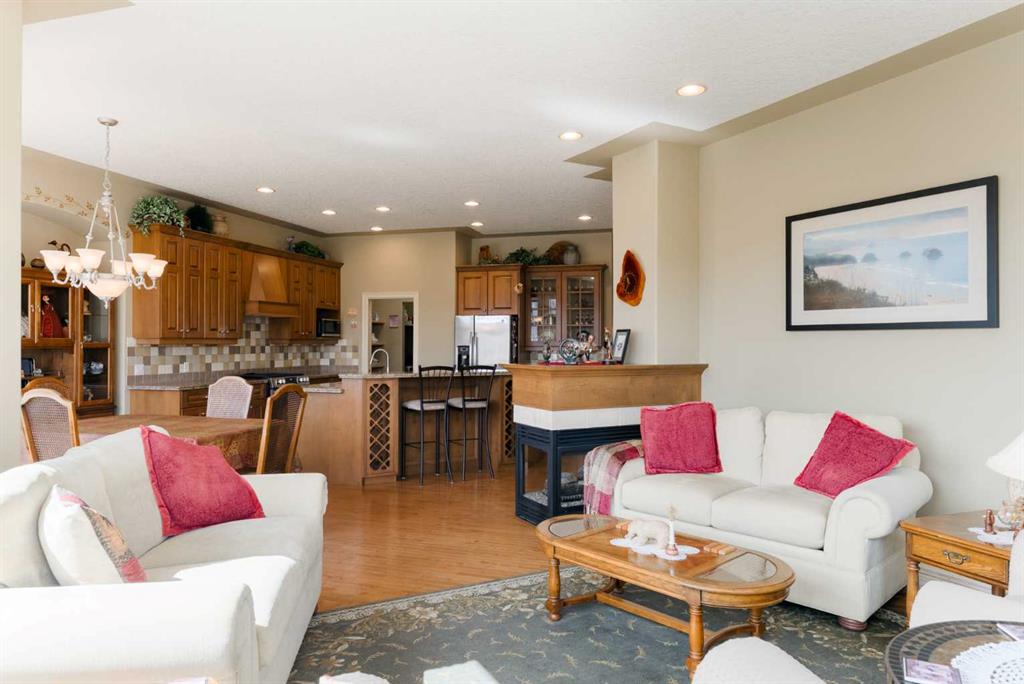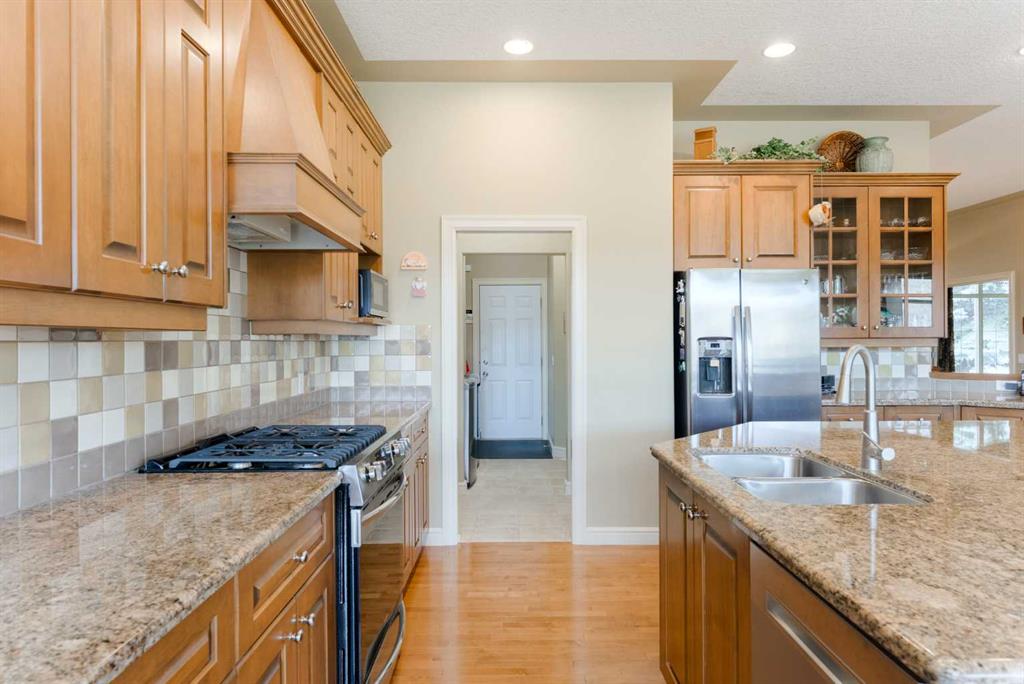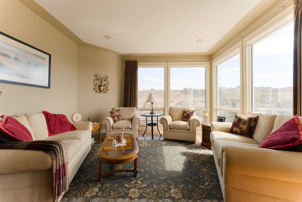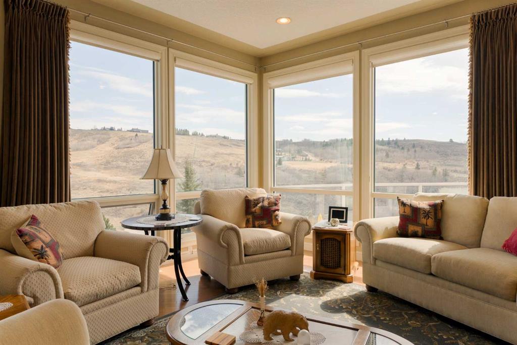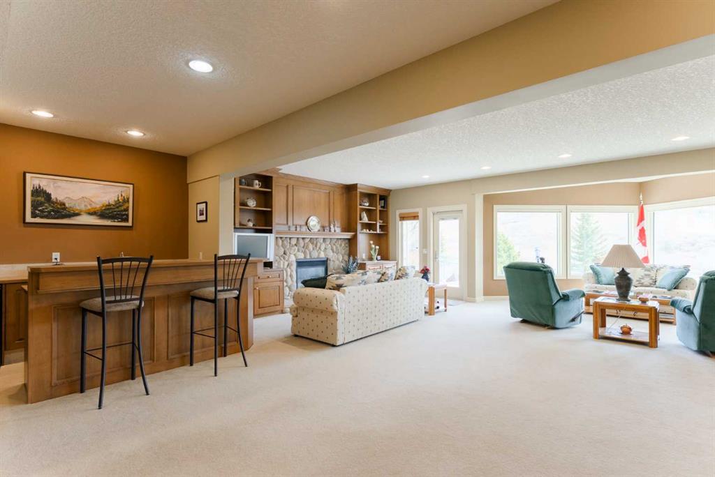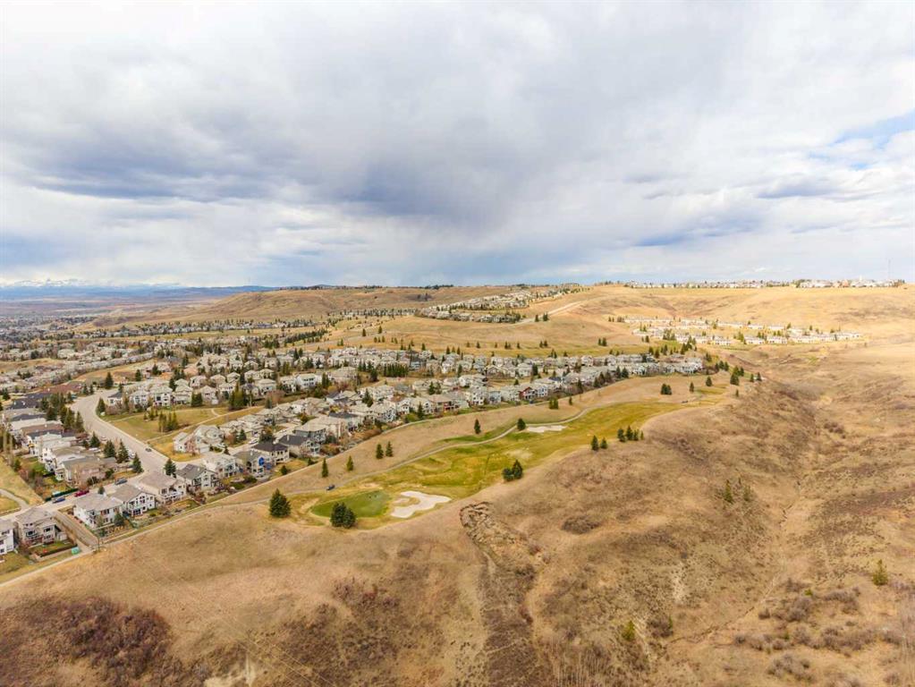 Perched directly above the 13th green of Gleneagles Golf Course, this rare walkout bungalow offers front-row views of the manicured green, sweeping valley landscape, frequent wildlife sightings, and the quiet lifestyle that makes Gleneagles one of Cochrane’s most sought-after communities. Enjoy golf course and valley views from your deck, great room, primary suite, and walkout lower level. Offering over 2800 sqft of developed living space, the home features soaring 10’ ceilings, expansive windows, and a bright open layout designed for comfortable main-floor living. The kitchen is centred around a massive island, stainless steel appliances, gas range, walk-through pantry, and seamless connection to the dining and living areas. Major recent upgrades provide true peace of mind, including new asphalt shingles replacing the original shake roof, upgraded triple-pane east-facing view windows, two recently replaced hot water tanks, and refreshed stucco exterior. The main floor primary retreat captures the views and includes a spacious 5-piece ensuite with jetted tub, separate shower, and private water closet. A front office, convenient laundry/mudroom area off the garage entry, and powder room complete the main level. The fully developed walkout basement is warm and inviting with in-floor heat, large windows, generous natural light, wet bar, spacious recreation area, two bedrooms, and a full bath. Step out to the private lower patio overlooking the fairway and landscaped yard with underground sprinklers. Additional highlights include a tall double attached garage, excellent pride of ownership throughout, and a setting that is difficult to replicate. Gleneagles remains one of Cochrane’s most desirable communities for its elevated setting, golf course lifestyle, mature streetscapes, and exceptional commuter convenience with quick access to Highway 1A, Calgary’s northwest edge, downtown Cochrane, and an easy escape west to the mountains. A rare opportunity to secure an executive walkout bungalow in one of Cochrane’s premier neighbourhoods.