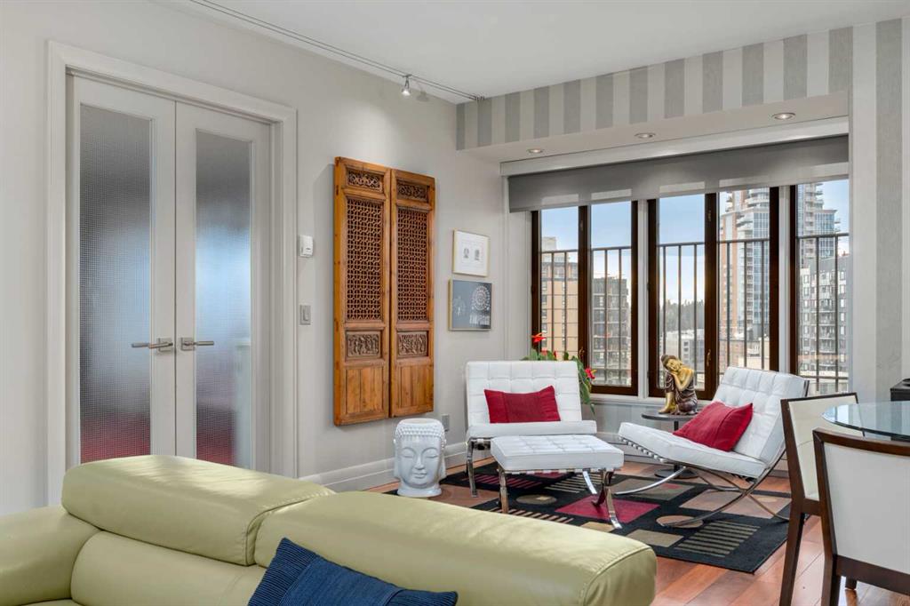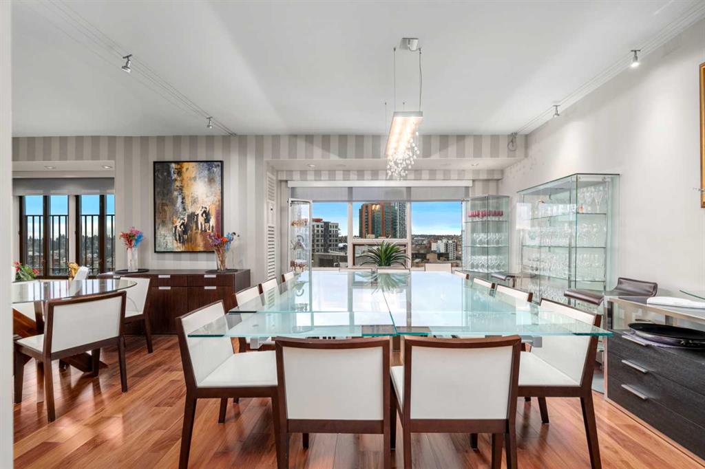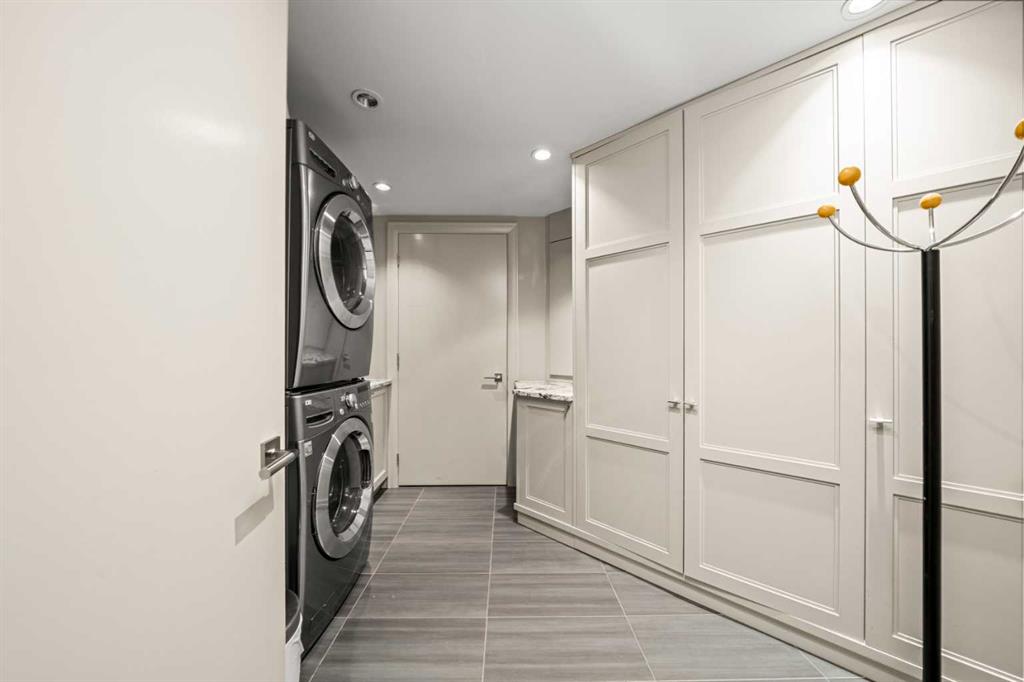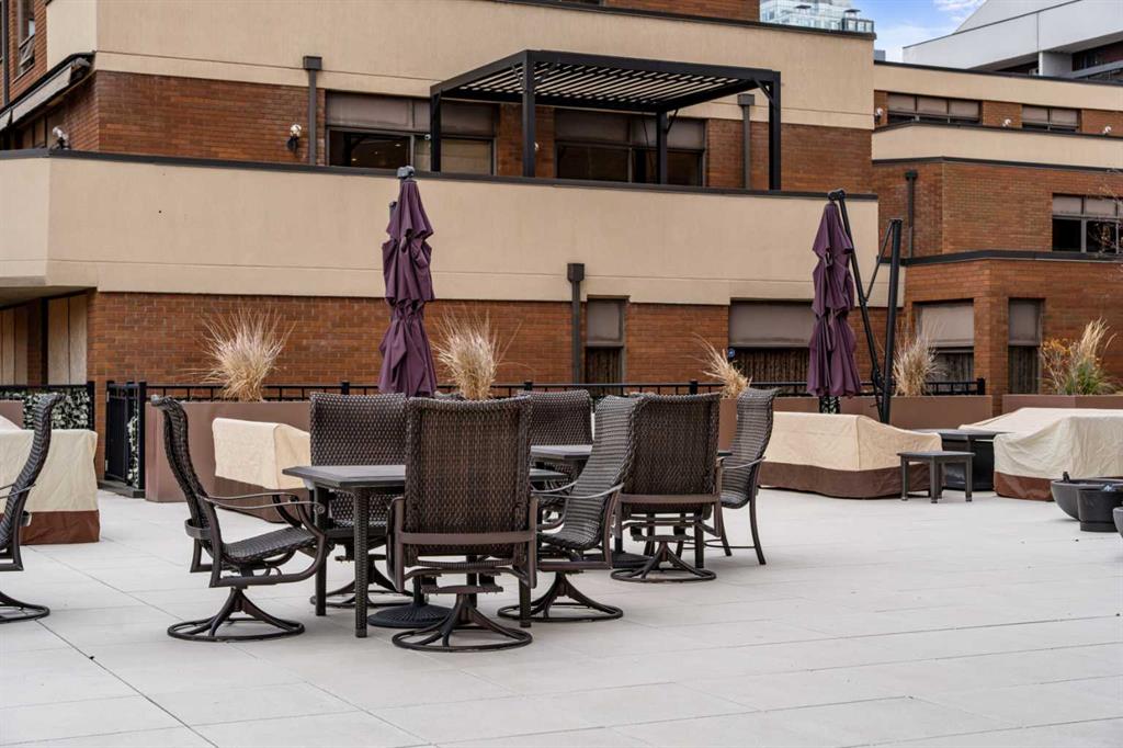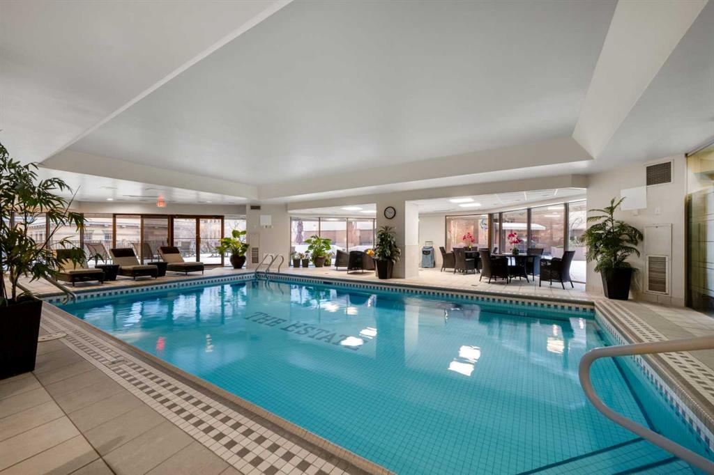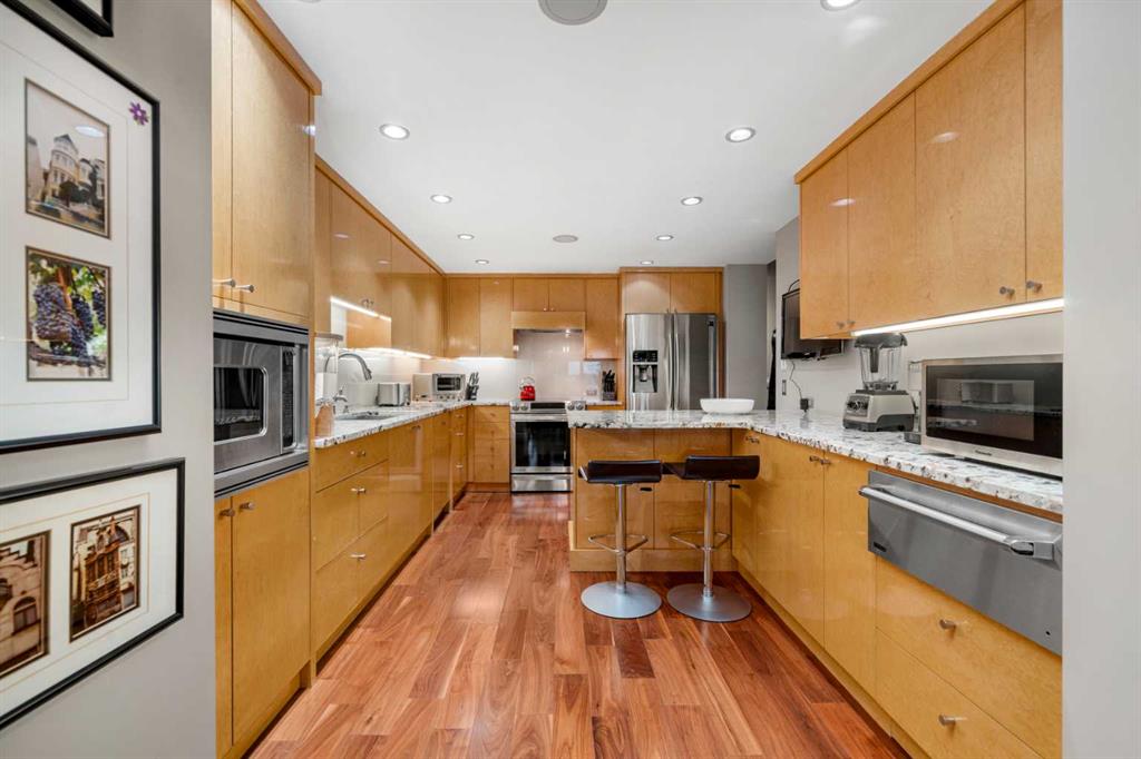 This beautiful 2022 sq ft executive condo is ideal for entertaining. Only one of three units on this floor providing a more private corridor entry that can be personalized with owner’s artwork. Once you walk in, you are met with a large living room with adjoining window seating area and a breakfast nook adjoined by a large dining room capable of seating 12. The graciously sized windows boast a mountain view from the dining room. The kitchen gleams with granite counter tops and maple cabinetry. The appliances include an oven with induction top, refrigerator, dishwasher and small wall convection oven and a warming drawer. Just off the kitchen is the laundry room complete with multiple storage and adjoining room that holds a wine cabinet and a second refrigerator location. Once checking upon the primary bedroom with a massive dressing room with multiple closets and sitting area and a grand view of the Lougheed House and park below. The master bathroom consists of a large shower with steam option. The large Den doubles as a spare bedroom with a murphy bed and an office area. It has a large media center with large TV that is included in the sale. The condo is fully wired from the media closet with speakers throughout. Entertaining? There is bookable access to the indoor pool & hot tub and adjacent patio with BBQ for family and social events. Large outdoor landscaped patio for casual use and BBQing. The building is connected to the Ranchmens Club with direct access.