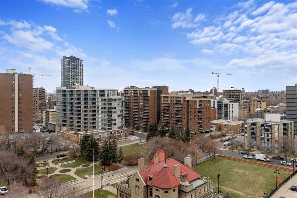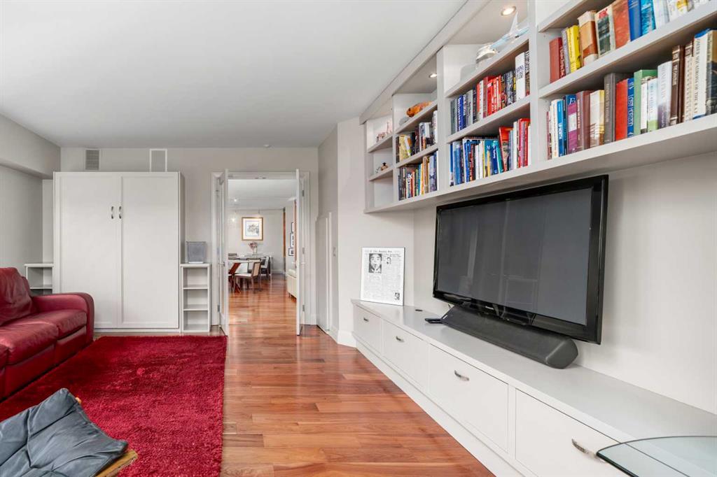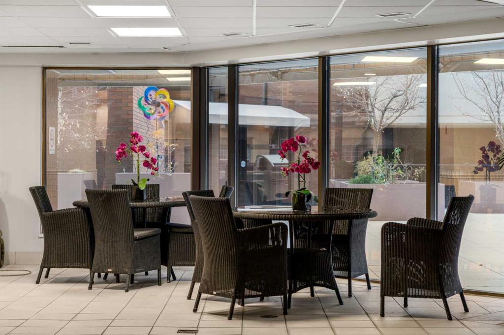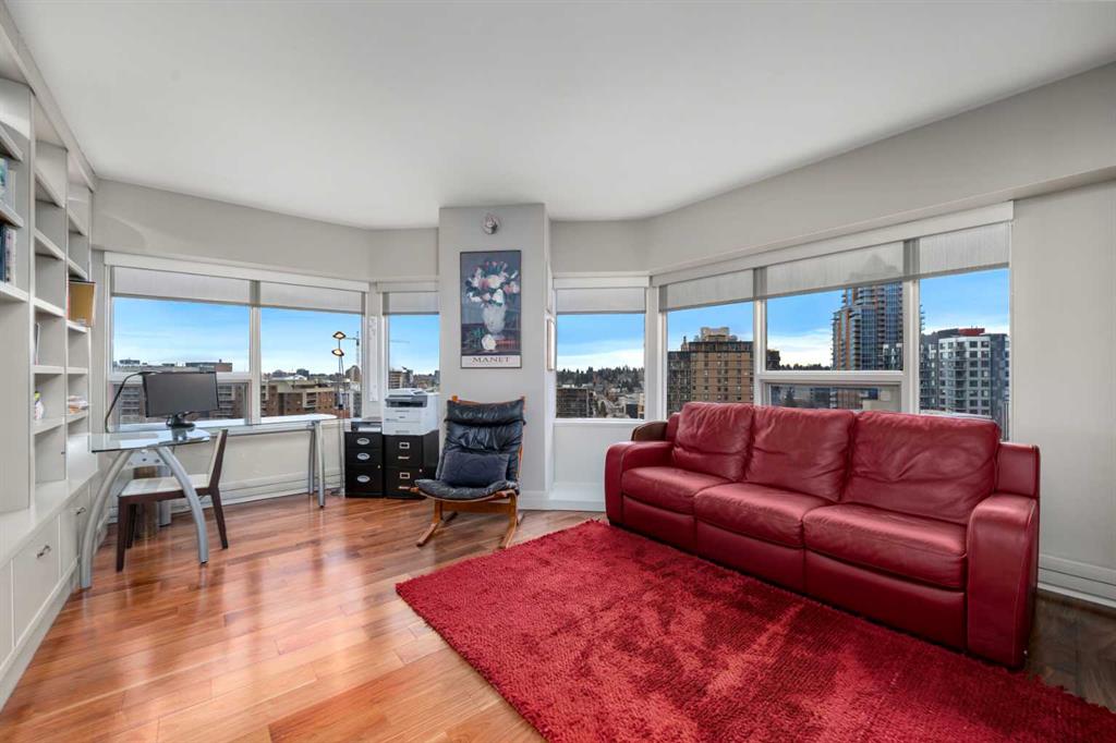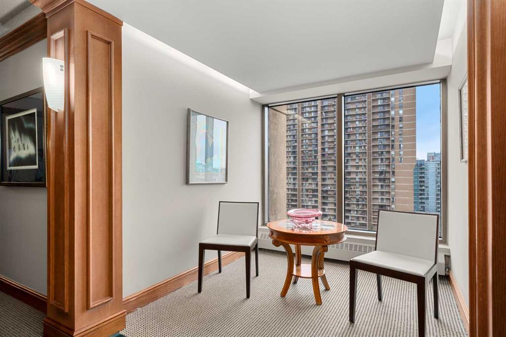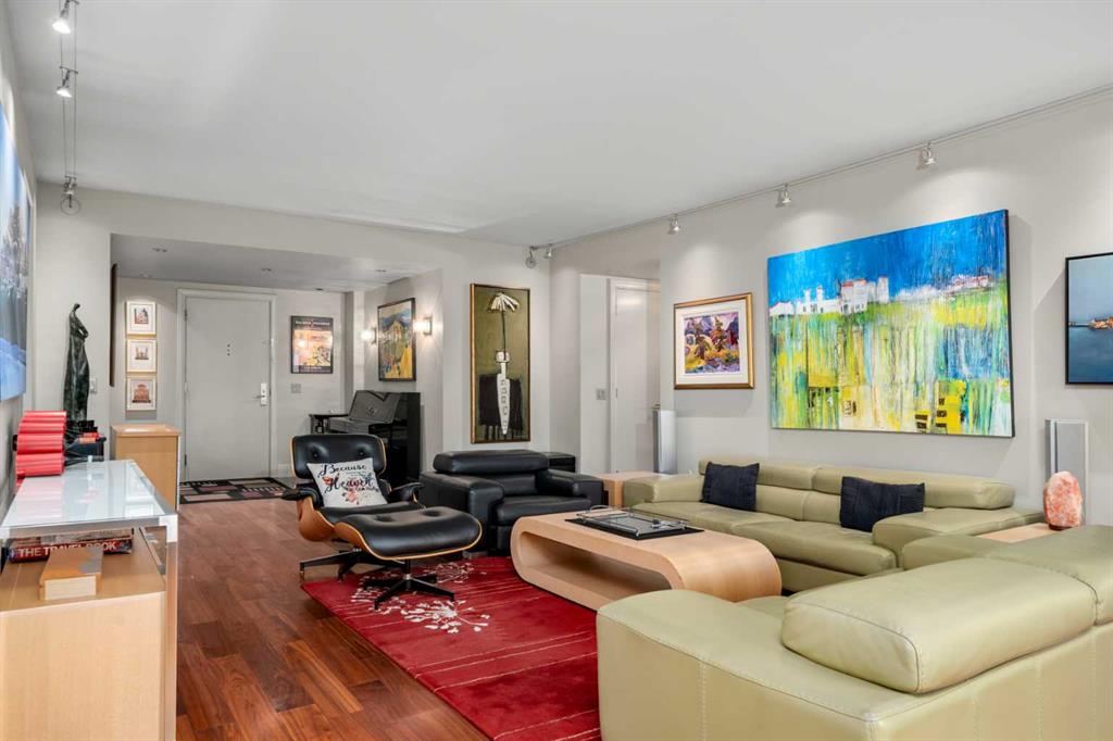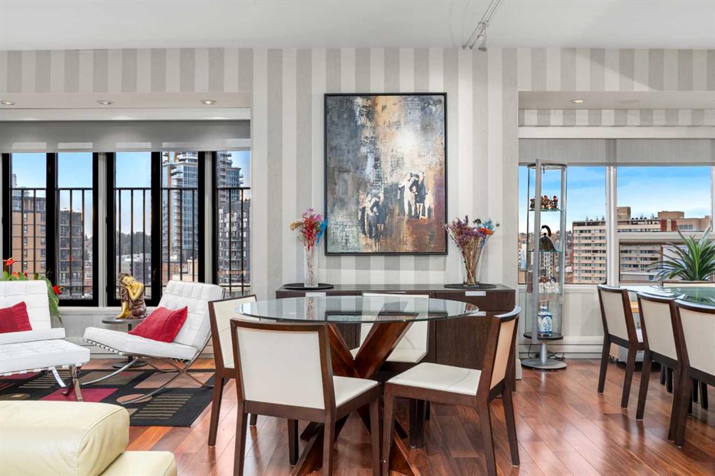 This beautiful 2022 sq ft executive condo is ideal for entertaining. Only one of three units on this floor providing a more private corridor entry that can be personalized with owner’s artwork. Once you walk in, you are met with a large living room with adjoining window seating area and a breakfast nook adjoined by a large dining room capable of seating 12. The graciously sized windows boast a mountain view from the dining room. The kitchen gleams with granite counter tops and maple cabinetry. The appliances include an oven with induction top, refrigerator, dishwasher and small wall convection oven and a warming drawer. Just off the kitchen is the laundry room complete with multiple storage and adjoining room that holds a wine cabinet and a second refrigerator location. Once checking upon the primary bedroom with a massive dressing room with multiple closets and sitting area and a grand view of the Lougheed House and park below. The master bathroom consists of a large shower with steam option. The large Den doubles as a spare bedroom with a murphy bed and an office area. It has a large media center with large TV that is included in the sale. The condo is fully wired from the media closet with speakers throughout. Entertaining? There is bookable access to the indoor pool & hot tub and adjacent patio with BBQ for family and social events. Large outdoor landscaped patio for casual use and BBQing. The building is connected to the Ranchmens Club with direct access.