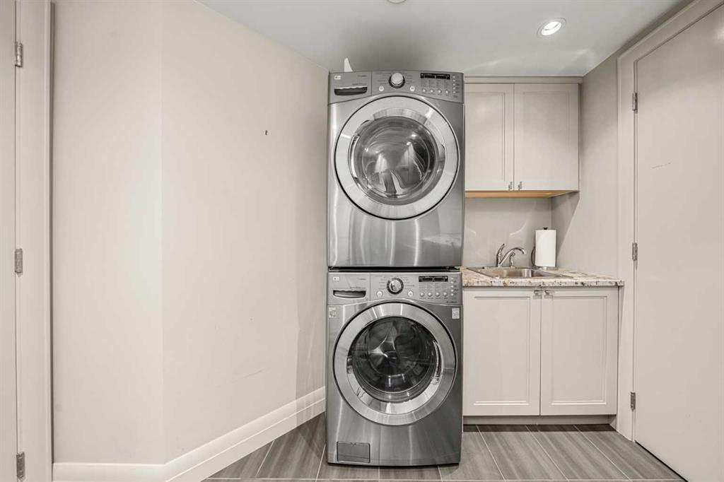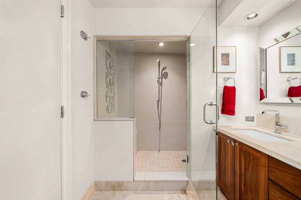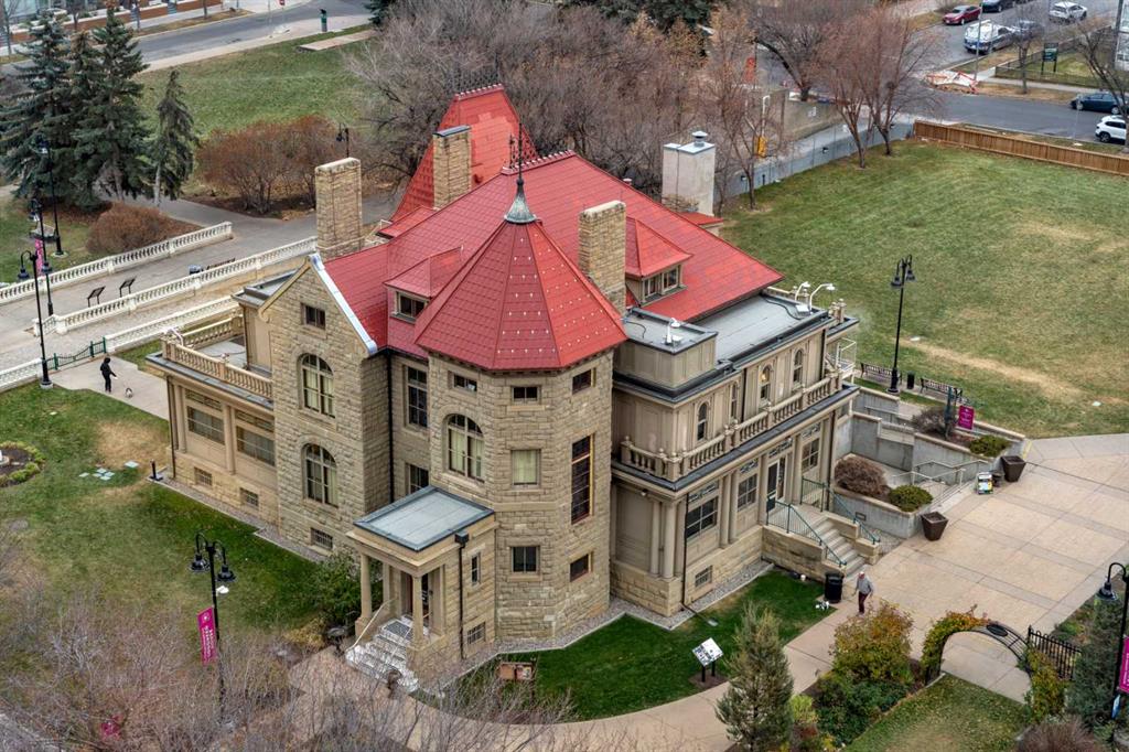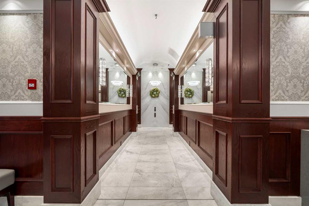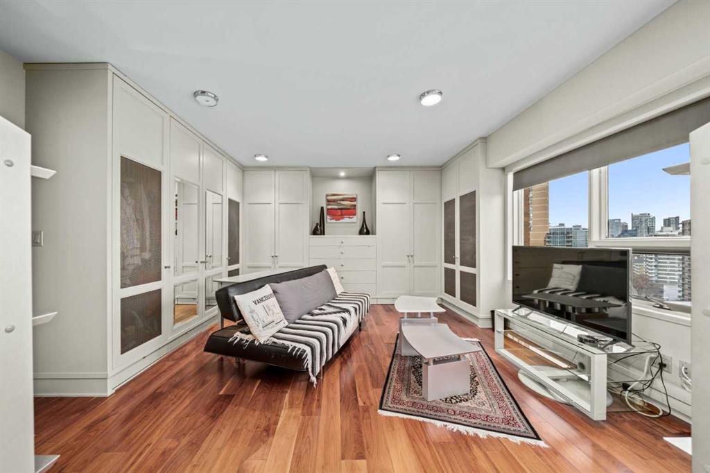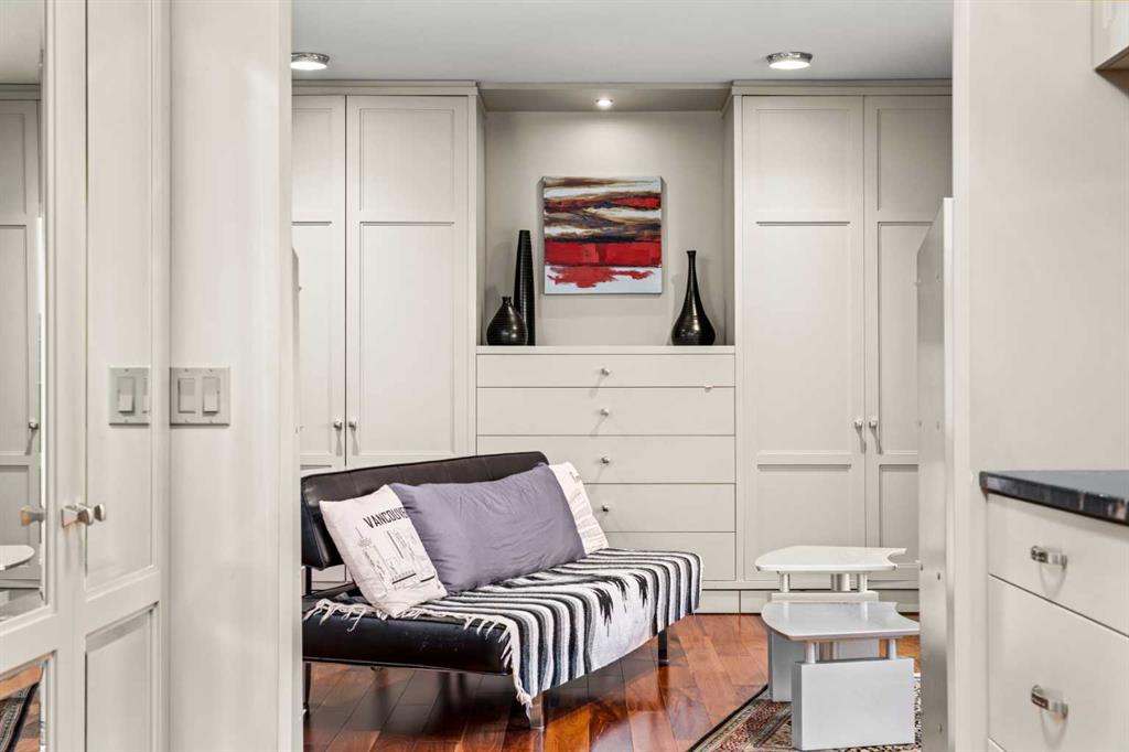 This beautiful 2022 sq ft executive condo is ideal for entertaining. Only one of three units on this floor providing a more private corridor entry that can be personalized with owner’s artwork. Once you walk in, you are met with a large living room with adjoining window seating area and a breakfast nook adjoined by a large dining room capable of seating 12. The graciously sized windows boast a mountain view from the dining room. The kitchen gleams with granite counter tops and maple cabinetry. The appliances include an oven with induction top, refrigerator, dishwasher and small wall convection oven and a warming drawer. Just off the kitchen is the laundry room complete with multiple storage and adjoining room that holds a wine cabinet and a second refrigerator location. Once checking upon the primary bedroom with a massive dressing room with multiple closets and sitting area and a grand view of the Lougheed House and park below. The master bathroom consists of a large shower with steam option. The large Den doubles as a spare bedroom with a murphy bed and an office area. It has a large media center with large TV that is included in the sale. The condo is fully wired from the media closet with speakers throughout. Entertaining? There is bookable access to the indoor pool & hot tub and adjacent patio with BBQ for family and social events. Large outdoor landscaped patio for casual use and BBQing. The building is connected to the Ranchmens Club with direct access.