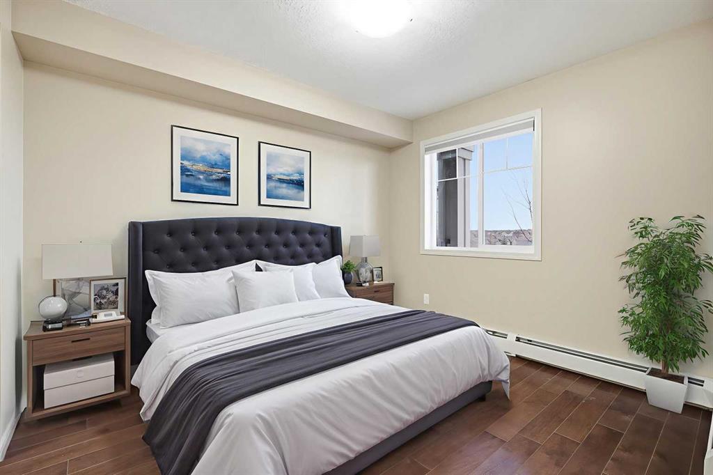 LOWEST PRICED 1 BED / 1 BATH UNIT IN PANORAMA WEST! Experience an elevated lifestyle in this timeless condo located in the heart of Panorama Hills. This modern unit features tall ceilings, warm beige tones, and rich brown laminate flooring throughout. The spacious kitchen is finished with matching brown cabinetry, stainless black appliances, granite countertops, and a large breakfast island—perfect for both everyday living and entertaining. The open-concept living area offers plenty of room to relax and leads to a generously sized balcony through patio doors, allowing for abundant natural light. The well-designed layout includes a spacious bedroom with a large window, walk-in closet, and convenient access to the 4-piece bathroom. Additional highlights include in-unit laundry, a storage locker, and a titled parking stall. Ideally located just steps from shopping centres, schools, and playgrounds, this home is perfect for first-time buyers or investors seeking excellent value in a prime community. Book your private showing today!