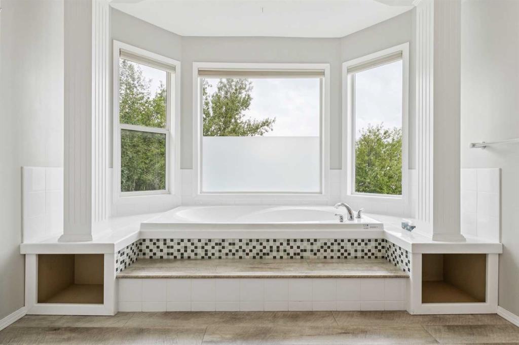Upstairs, you’ll find two spacious bedrooms plus a sun-filled primary suite. The luxurious ensuite offers soaker tub surrounded by windows, and beautiful garden views.