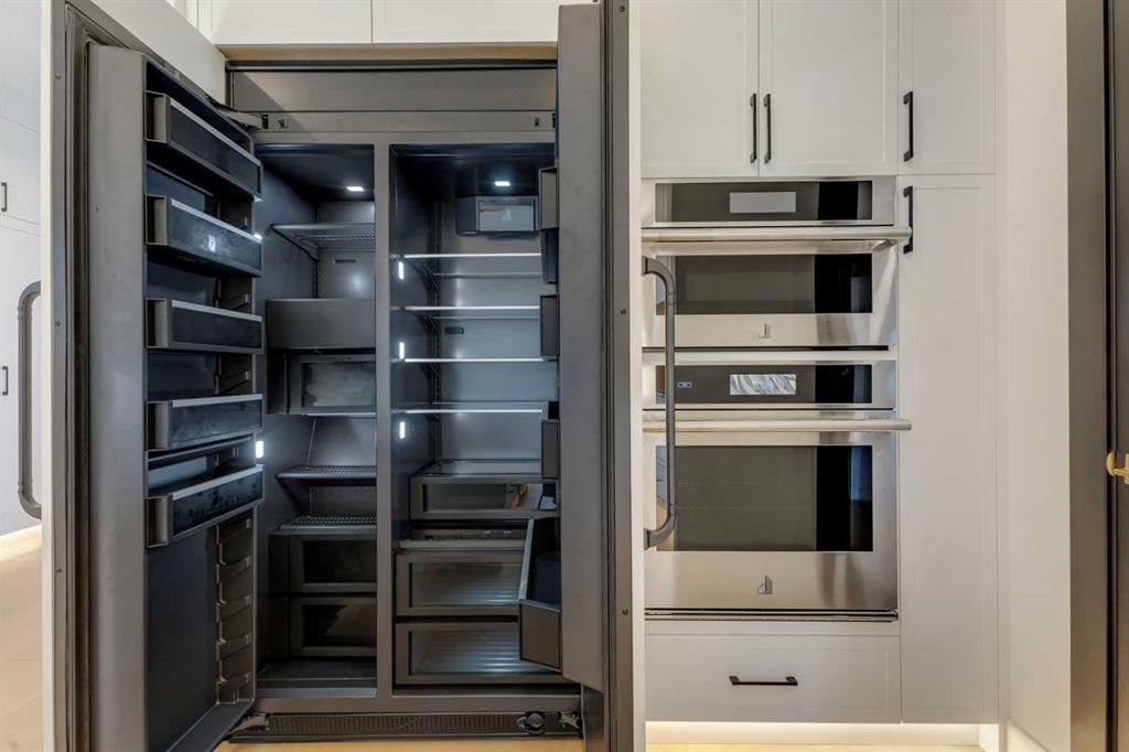 At the centre of the home, the kitchen stands as both a statement piece and a highly functional workspace. Quartz countertops, custom oak and white cabinetry, matte black fixtures, and a sculptural arched hood fan are complemented by a full JennAir appliance package, including a gas range. A pot filler and abundant storage support everyday use, while a hidden prep kitchen with a second sink, additional cabinetry, and open shelving allows the main kitchen to remain effortlessly clean and composed.