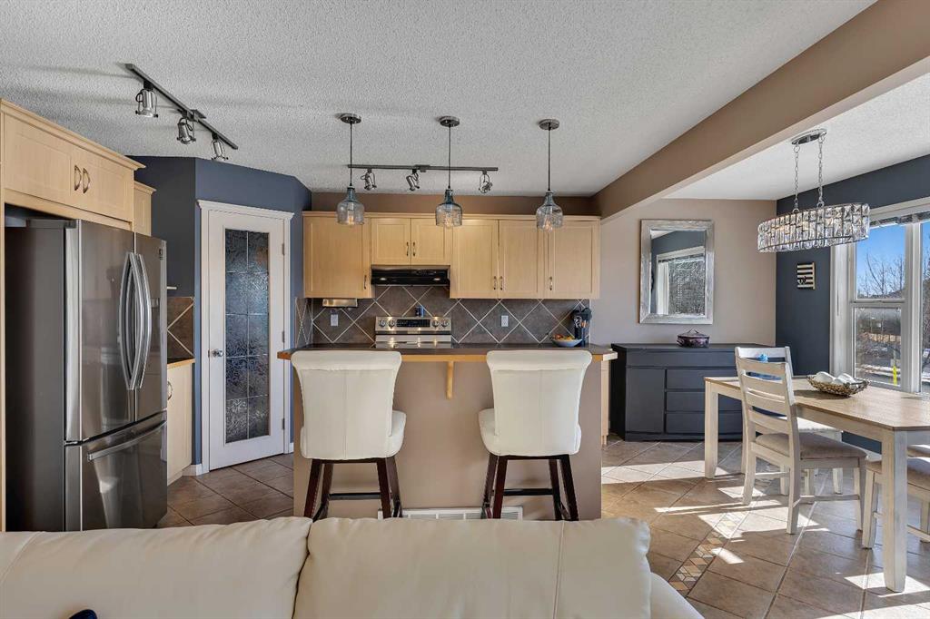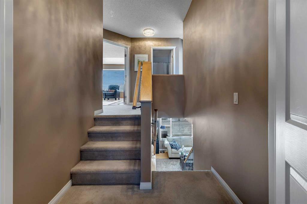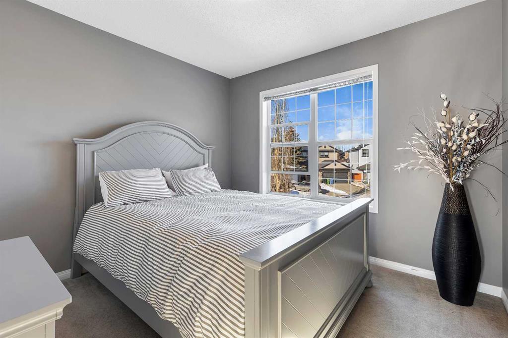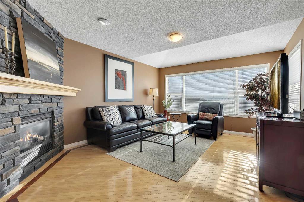 Stunning family home with spectacular mountain views in a quiet cul-de-sac location with no neighbours behind! Offering 1,909 SQFT above grade plus an additional 710 SQFT in the fully developed basement, this beautifully designed home delivers exceptional space, comfort, and lifestyle appeal. The main floor features rich hardwood flooring, a bright, functional island kitchen with a pantry, and spacious living and dining areas ideal for entertaining. A cozy main floor fireplace creates a warm focal point, while expansive windows fill the home with natural light and frame breathtaking mountain views. The west facing backyard is perfect for enjoying evening sunsets and outdoor gatherings. Upstairs features 4 generous bedrooms plus a large bonus room with its own fireplace, creating an ideal family retreat. The impressive primary suite offers vaulted ceilings, a private ensuite bath, and a spacious walk-in closet. The fully developed basement adds incredible versatility with massive windows, a third fireplace, separate thermostat control, and a convenient kitchenette with its own fridge, perfect for extended family or multi-generational living. This home offers 3 full bathrooms and 1 half bath, a rare total of 3 fireplaces, and stunning views from all levels. Ideally located close to transit and surrounded by expansive open spaces, soccer fields, and numerous nature pathways throughout the neighbourhood. Just three blocks from the community recreation area, featuring tennis courts, playgrounds, a rowing lake for summer enjoyment, and skating in the winter, creating a true year round outdoor lifestyle. A rare opportunity combining privacy, views, space, and an unbeatable family-friendly location.