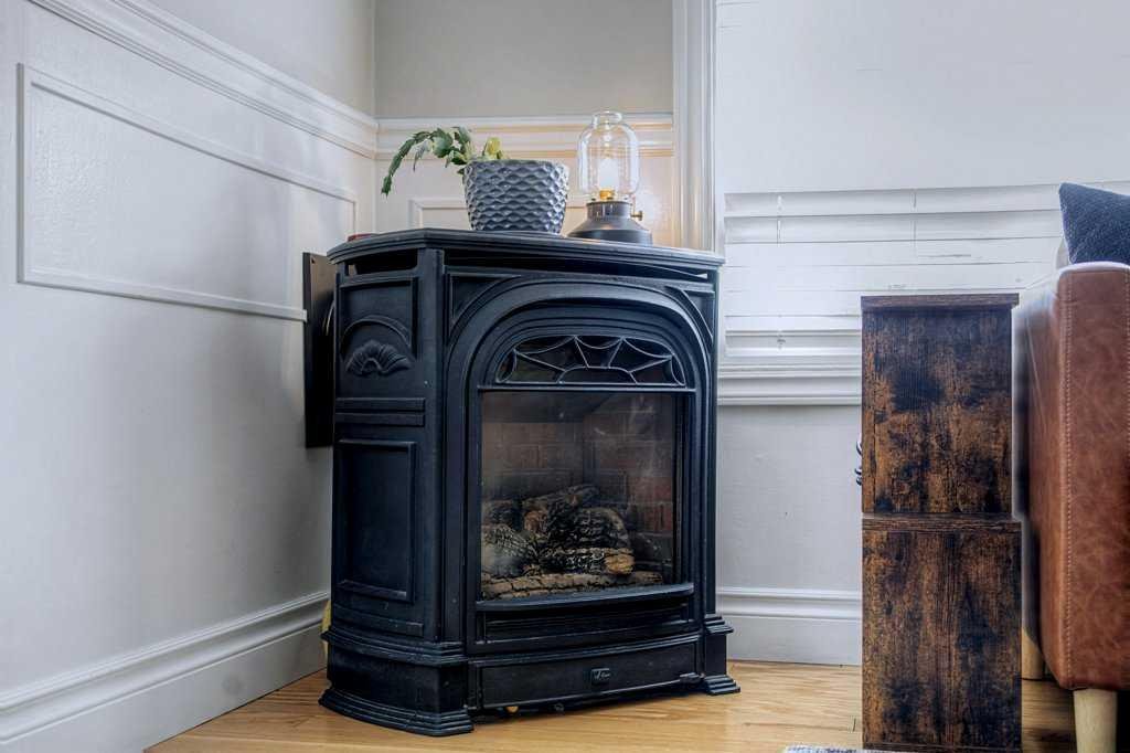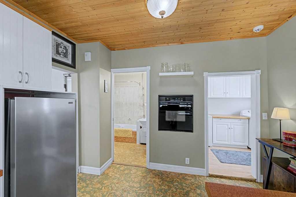 Inside, we’re talking hardwood floors you could slide across in your socks, a fireplace for those nights when a White Russian and some Creedence just makes sense, and open beam ceilings in the kitchen that give the whole place this kind of… bowling alley-adjacent gravitas. One bedroom, a den — call it what you want, man, an office, a meditation space, a place to keep your rug — and main-floor laundry with storage.