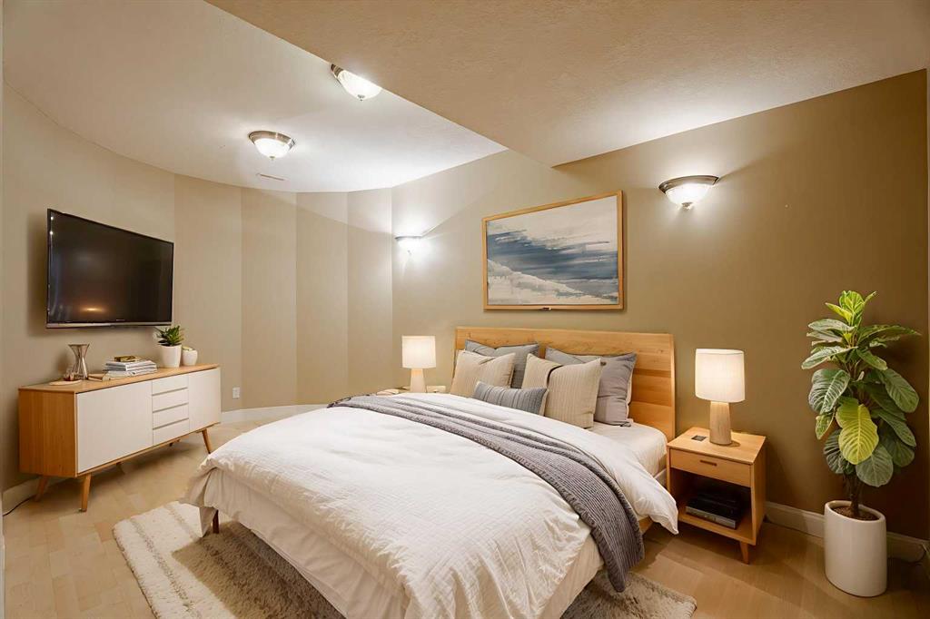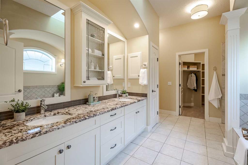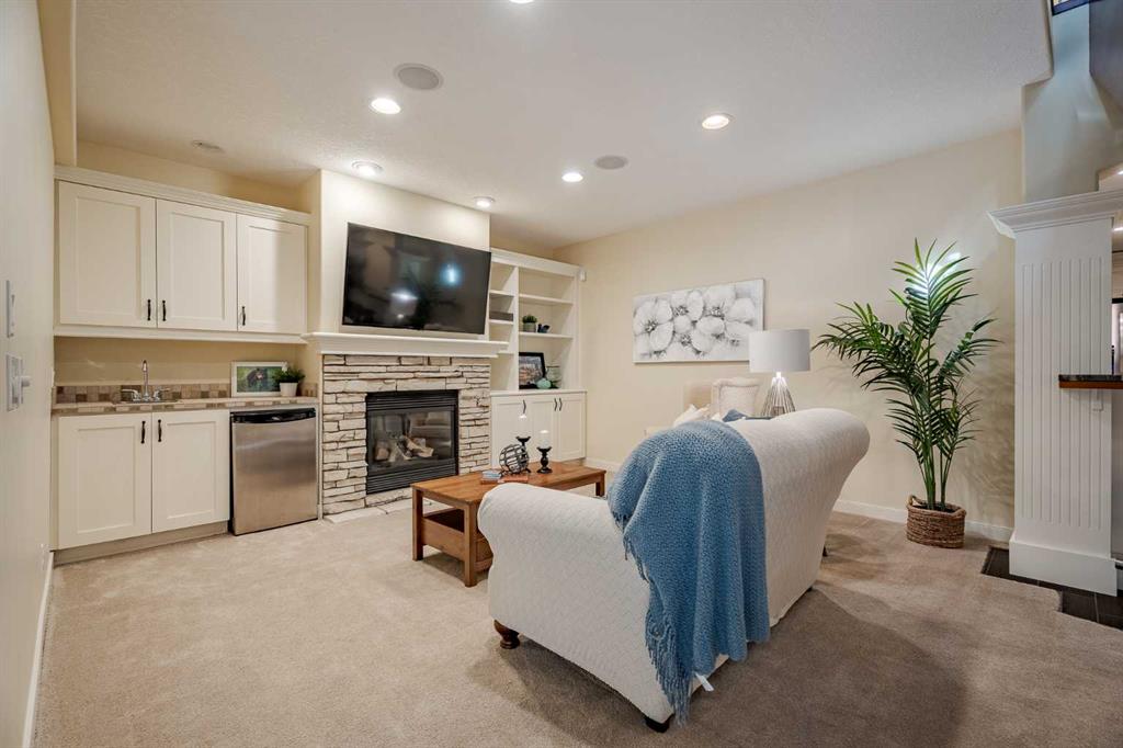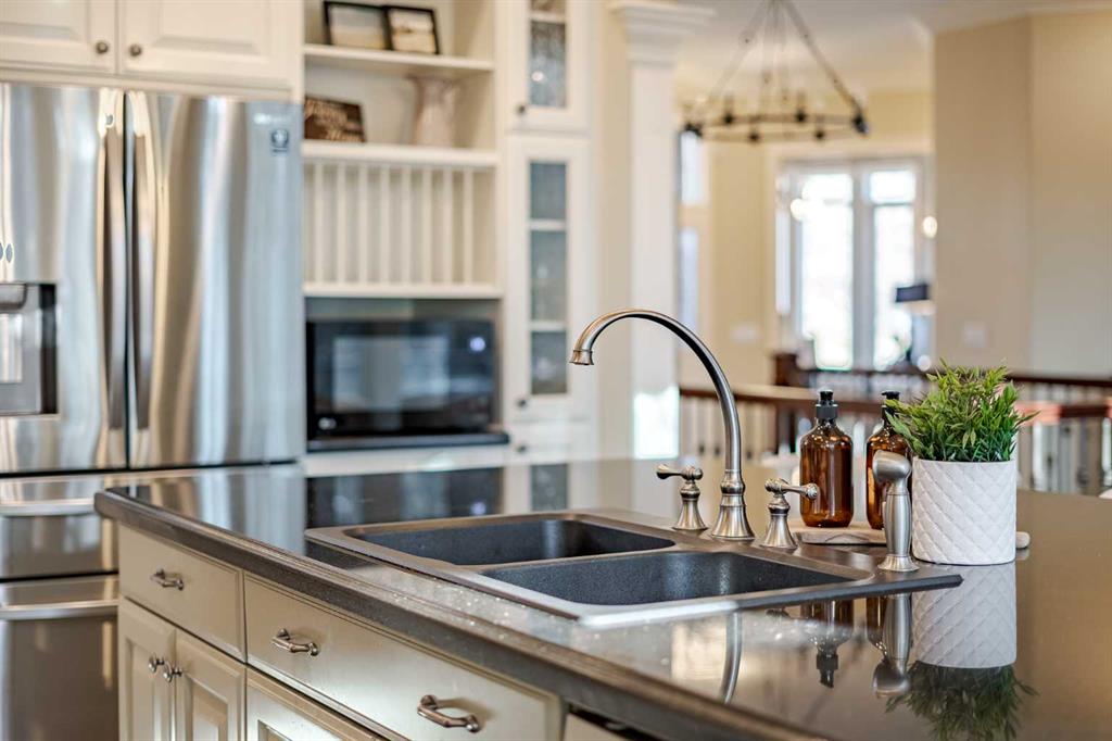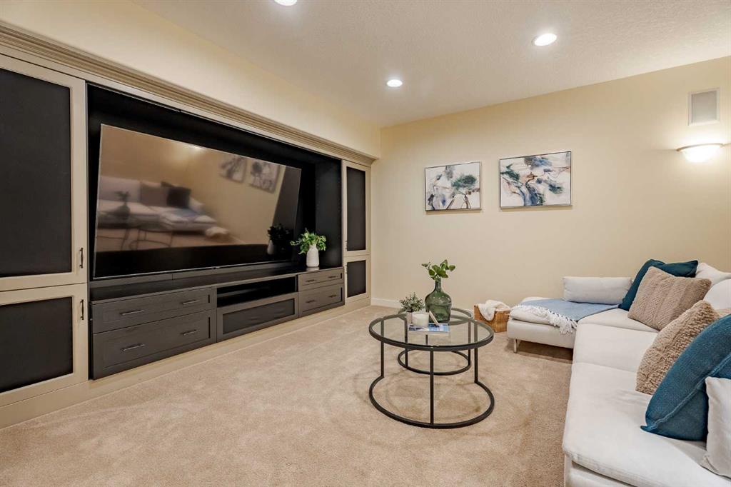 The lower walkout level is designed for both relaxation and versatility, featuring nine-foot ceilings and the cozy luxury of in-floor heating. This expansive space includes a massive family room and a private home theatre, creating the ultimate hub for entertainment. For guests or multi-generational living, a full second kitchen—complete with an oven, dishwasher, and refrigerator—provides a completely self-contained living experience. Two additional generous bedrooms and a flexible exercise room ensure there is ample space for every need. The home’s technical updates are equally impressive, including a new high-grade Vacuflo system, a garage equipped with a custom storage platform for additional appliances, and permanent Gemstone lighting that provides a sophisticated glow to the exterior year-round.
