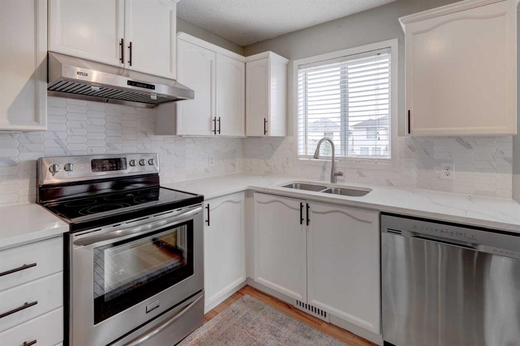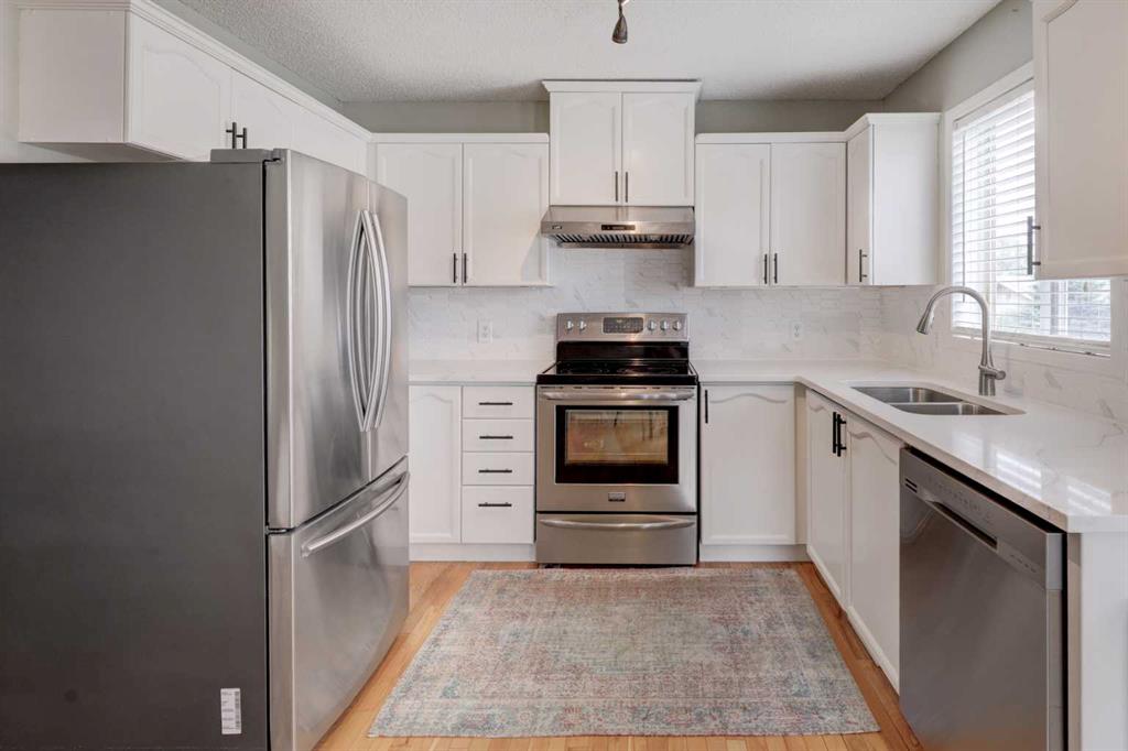 Perfect starter home in Hidden Valley, a highly desirable community in NW Calgary! This cozy 2 storey single-family home is situated on a quiet street, right next to a playground—ideal for families. The home features 3 bedrooms and 1.5 bathroom. An oversized double garage was built just 3 years ago, offering plenty of space for parking and storage. The main level boasts hardwood flooring throughout, and the spacious living room is filled with abundant natural light from the bay windows, complemented by a gas fireplace. The bright white kitchen has been beautifully upgraded in 2025 with new quartz countertops, backsplash, freshly painted cabinets, and stainless steel appliances. The dining area is equally inviting, with two large windows and patio door access to a huge deck—perfect for entertaining. The fully fenced backyard adds privacy and outdoor enjoyment. Upstairs, you’ll find three well-sized bedrooms and a 4-piece bathroom. The primary bedroom comfortably fits a king-size bed and features his-and-hers closets, while the other two additional bedrooms are also generously sized.T he undeveloped lower level is ready for your personal touch and future development. Conveniently located just minutes from Stoney Trail, Shaganappi Trail, Beddington Trail, and 14 Street, offering quick and easy access to all amenities.