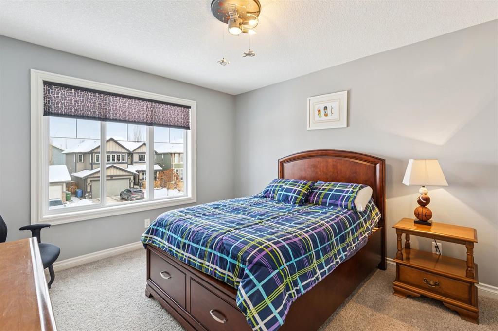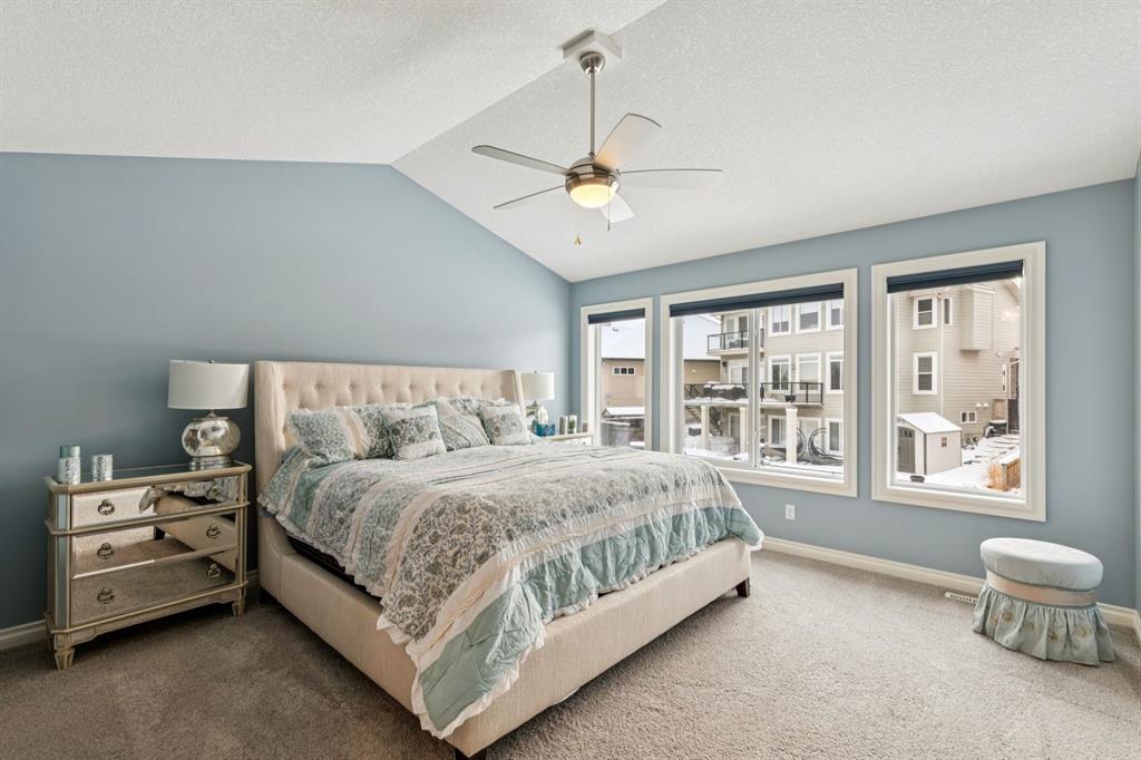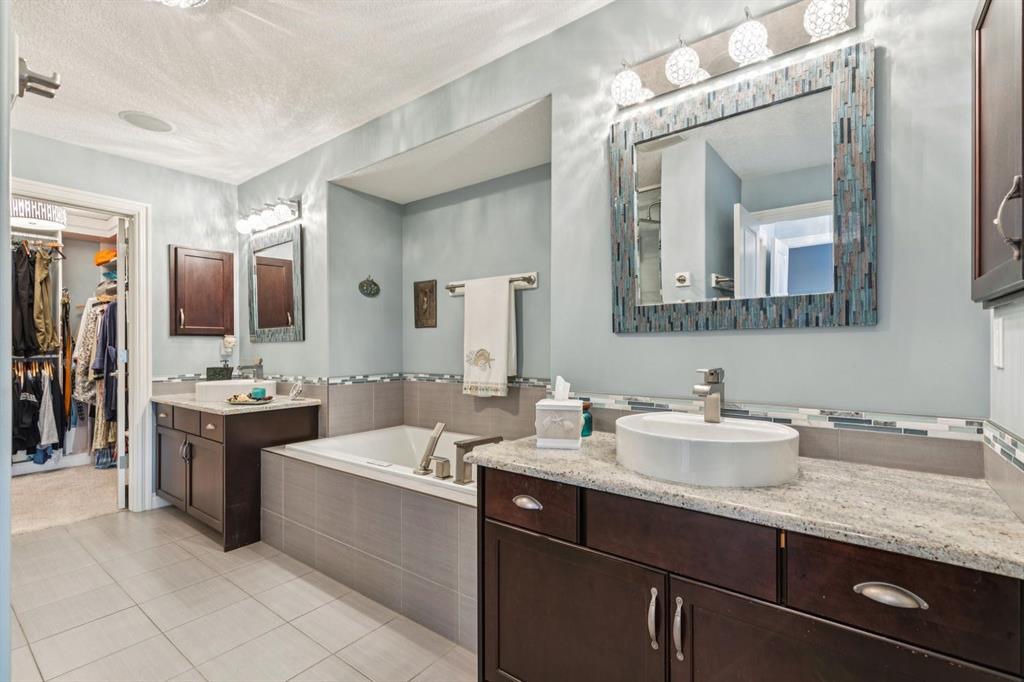 The primary suite is truly a retreat, highlighted by vaulted ceilings, a two-sided fireplace, and generous natural light. The ensuite includes dual sinks, an oversized glass shower, an air-jet soaker tub, and a private water closet. The showstopper, however, is the spectacular walk-in closet—truly a dream space for anyone who appreciates luxury organization and storage.