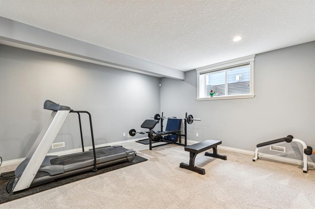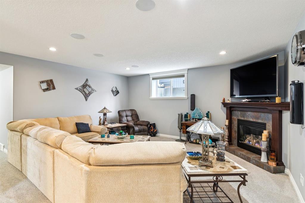 The fully finished basement extends the living space with 8’7″ ceilings, a large games area, a second family room with a cozy corner fireplace, a full bathroom, a spacious bedroom with a walk-in closet, oversized windows, and abundant storage.