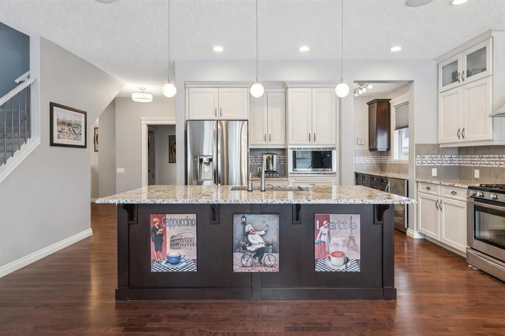 The chef-inspired kitchen is built for those who love to cook and entertain. It showcases granite countertops, full-height custom shaker cabinetry, stainless steel appliances including a gas range, a large central island with seating, an undermount sink, recessed lighting, a full pantry, and a convenient walk-through butler’s pantry. The bright breakfast nook overlooks the beautifully designed, zero-maintenance backyard, complete with irrigation and direct access to a lake pathway leading to your private dock—a rare and highly desirable feature.