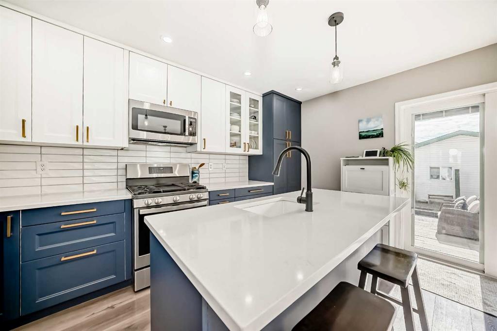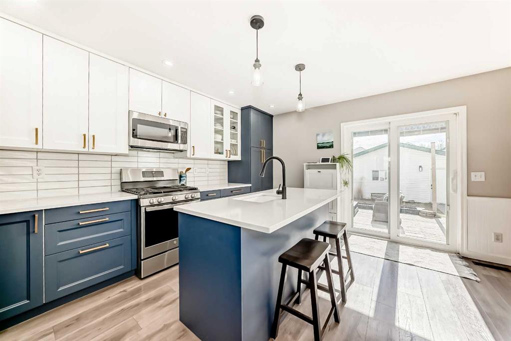 The back door provides access to the extensive full-width deck and the oversized & heated double detached garage with alley access. Upstairs boasts a tasteful primary bedroom with walk-in closet, 2 stylish secondary bedrooms and 1 full bath with private access from the primary. The fully finished basement presents a 4th large bedroom, family room, a renovated 3pc bathroom as well as ample storage space.