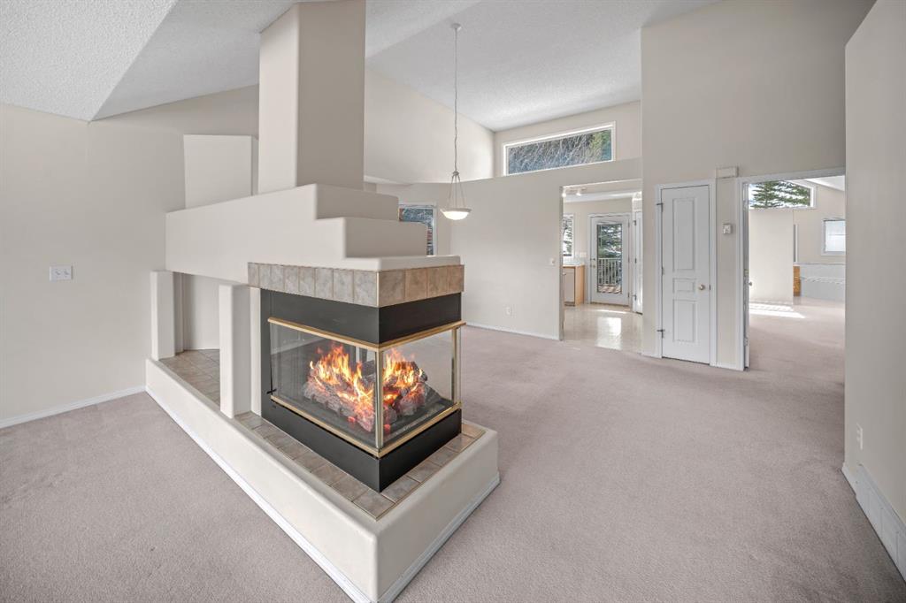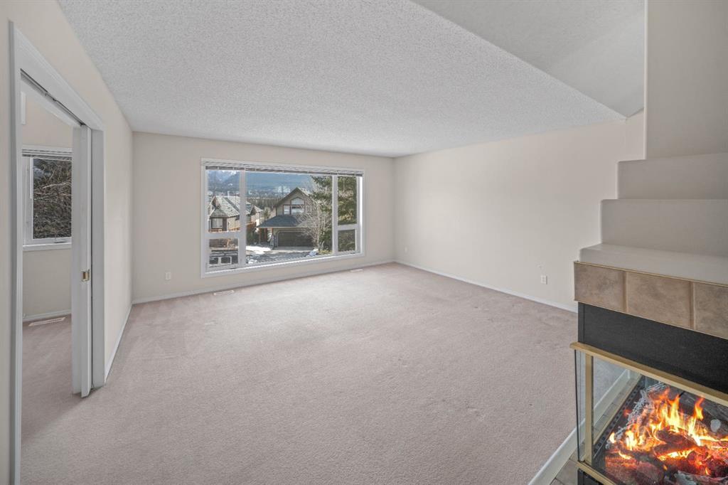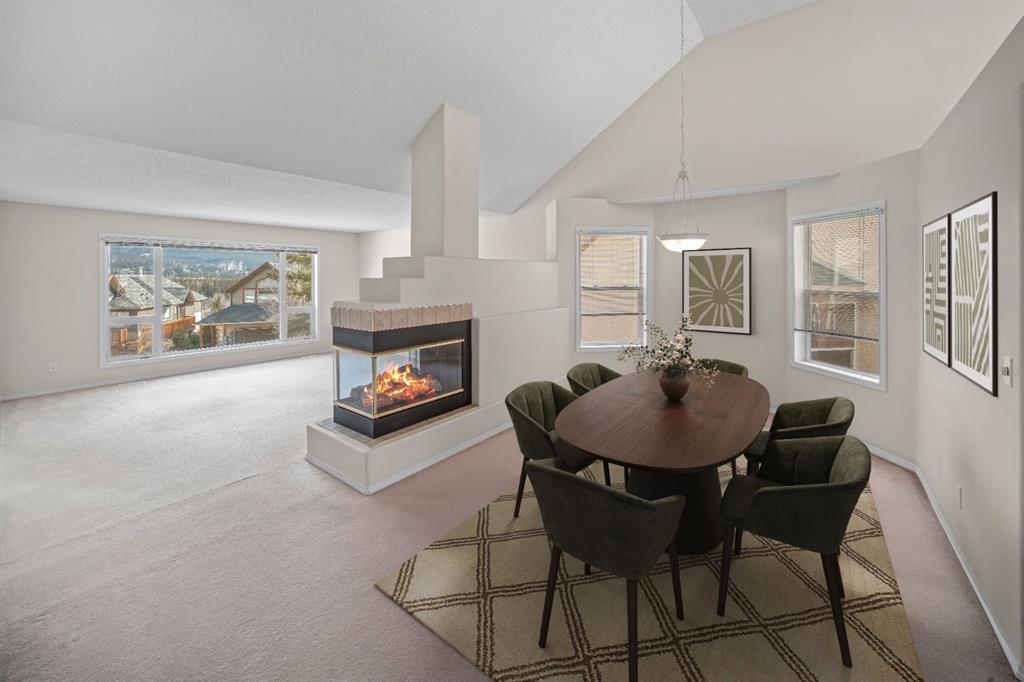 The main living area is warm and inviting, featuring a 3-sided gas fireplace that adds ambiance and definition to the space. Expansive windows flood the home with natural light and frame truly spectacular mountain views, including Grotto Mountain, Lady Macdonald, and the Fairholme Range—creating a stunning backdrop for everyday living.