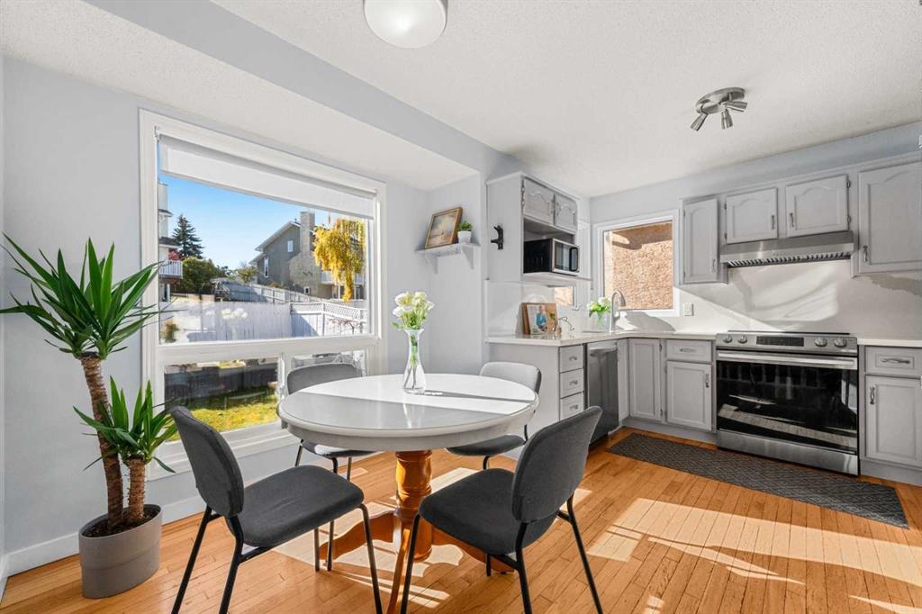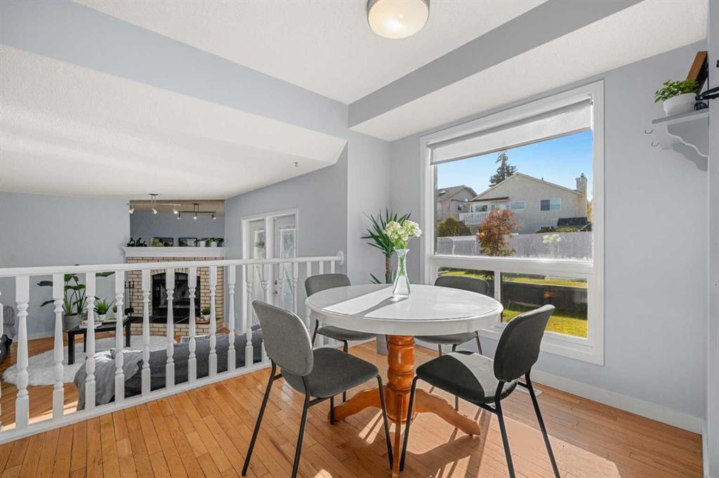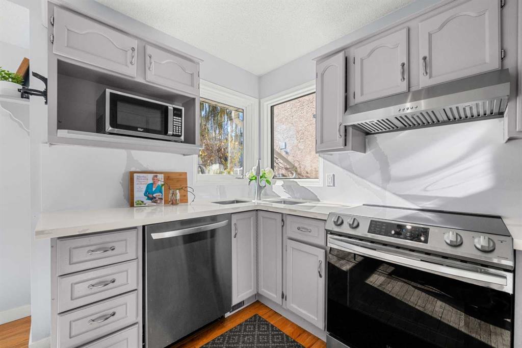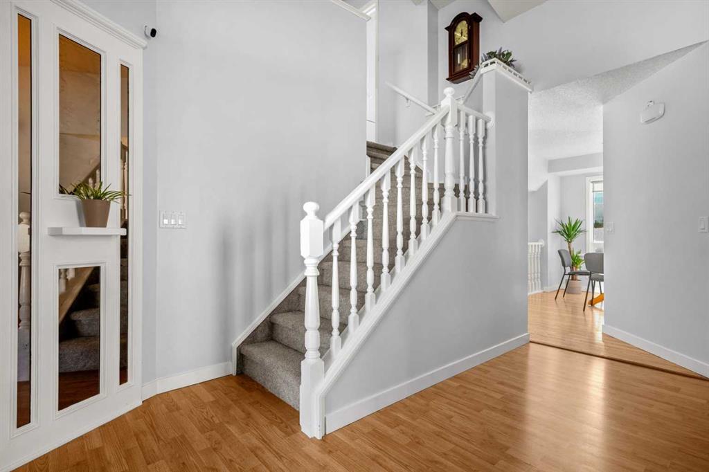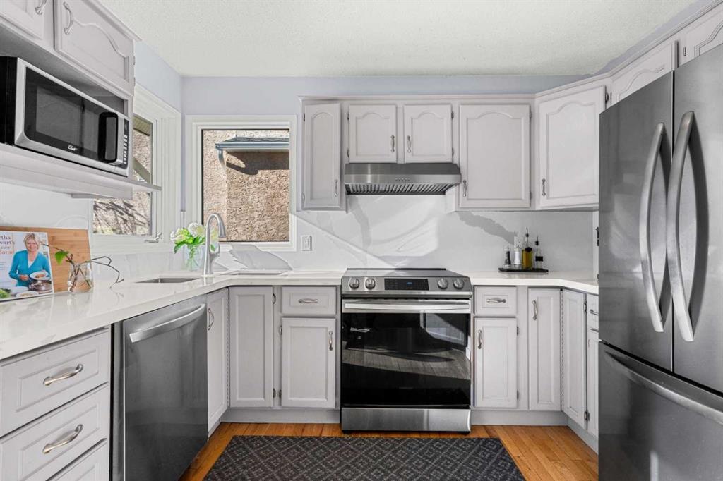 Inside, the foyer opens to soaring vaulted ceilings and an airy formal living and dining space wrapped in natural light. Laminate flooring, a soft grey palette, and a beautiful wood-spindled staircase create a warm yet refined first impression. Toward the back, you’ll reach the heart of the home with an updated kitchen that shines with quartz countertops and backsplash, stainless steel appliances, and a quaint corner sink framed by dual windows overlooking the backyard. Adjacent is the breakfast nook with a picture window capturing the morning light, complemented by lovely wood accents that subtly connect each level.