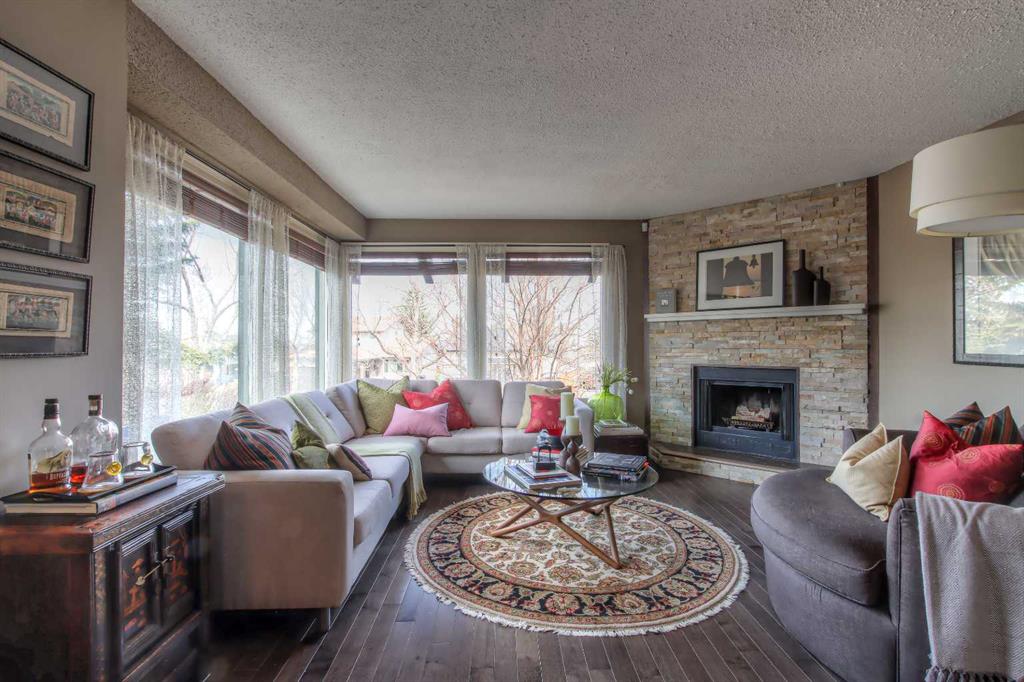 The spacious living area features a fireplace and large, bright, newly installed picture windows.