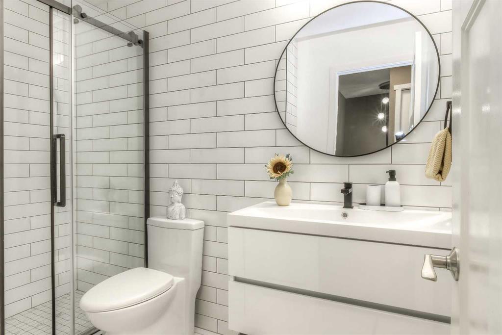 Upstairs offers a super large primary bedroom with ample closet space. The second bedroom is also generous in size. The brand-new contemporary full bathroom features full subway tile and a walk-in shower.