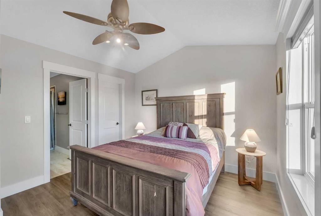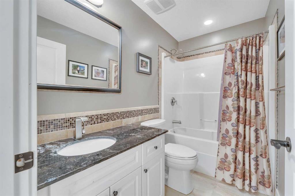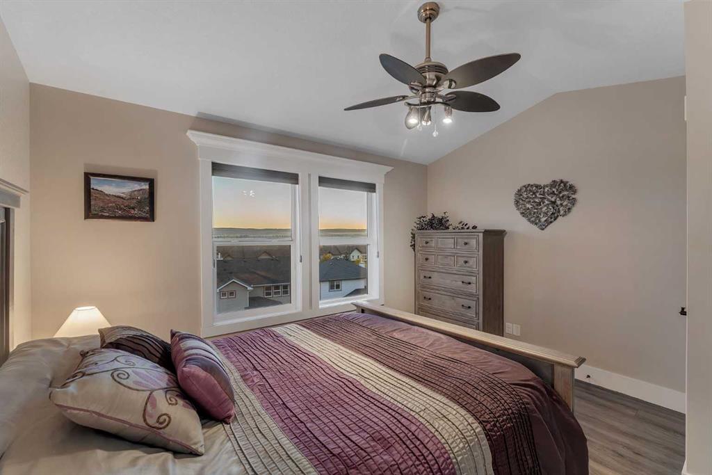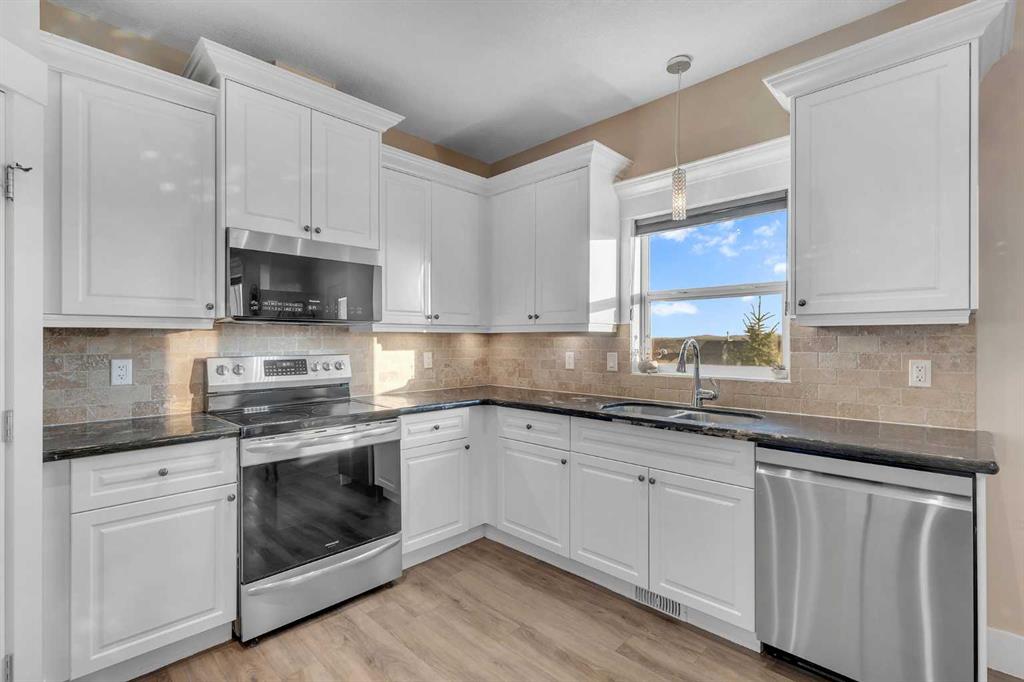 Perched on a quiet cul-de-sac, this home offers sweeping west-facing views over rolling hills and the snow-capped Rocky Mountains. From the moment you arrive, there’s a sense of space, light, and comfort that makes this property stand out. Inside, the open-concept main floor is bright and welcoming. The living room features a striking floor-to-ceiling rock fireplace, creating a warm focal point for everyday living or entertaining. Large windows flood the space with natural light and frame stunning mountain and hill views. The dining area flows into a spacious kitchen with granite countertops, sleek stainless steel appliances, travertine tile, and plenty of cabinetry. A convenient powder room and access to the deck with glass railings allow you to take in the full, unobstructed view while enjoying privacy and outdoor living. Upstairs, the primary suite feels like a private retreat with vaulted ceilings, generous space for a king bed, and more west-facing views. A well-appointed ensuite and walk-in closet add comfort and convenience. Two great-sized additional bedrooms, a full bathroom, and a laundry room complete the upper level, making it an excellent layout for families or guests. The fully finished walk-out basement provides flexibility, featuring a large rec room, full bathroom, and potential for a separate living area with its own access and a parking area off the back lane. This space can be used for guests, hobbies, a home office, or additional living quarters. Throughout the home, thoughtful upgrades stand out, such as new vinyl flooring, fresh paint, tall baseboards, crown moulding around door frames, and abundant windows that keep every room light and bright. Outside, the walk-out level opens to a landscaped yard with extensive rockwork and level green space. A hot tub sits just steps away, and below is a lower garden area with mature shrubs where you can gaze up and admire your surroundings. Located in Heritage Hills, near a newly proposed grocery store and close to local schools, this property combines privacy and convenience with quick access to Highway 1A for easy mountain getaways. This is where comfort meets breathtaking views, creating the perfect place to call home. Experience the beauty and calm of Heritage Hills living.