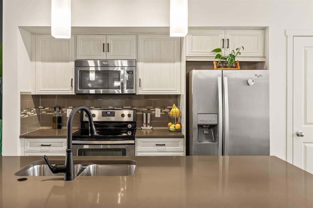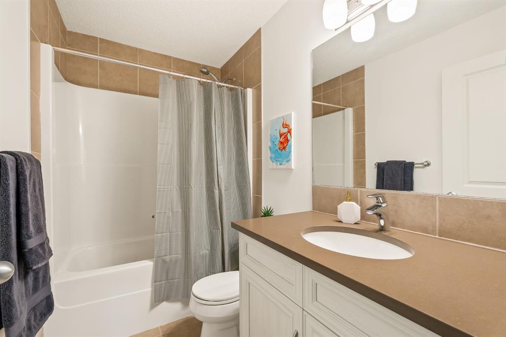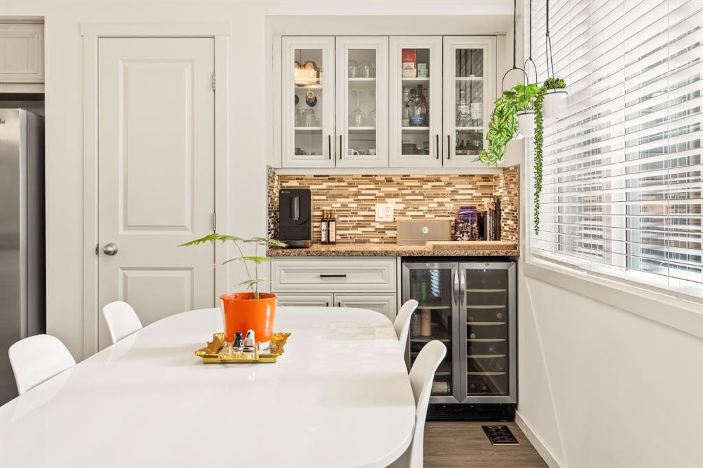 Discover a fantastic opportunity to own in one of Calgary’s premier four-season lake communities—Mahogany. This gorgeous NO-CONDO-FEE townhome is perfectly situated within walking distance to Westman Village, the lake entrance, playgrounds, shops, dining, and countless amenities. From the moment you step inside, this home is sure to impress. The desirable open-concept floor plan features 9’ ceilings, newer luxury vinyl plank flooring and oversized windows that flood the space with natural light. The inviting front living room—complete with a sleek feature wall—flows effortlessly into the stylish kitchen, where you’ll find quartz countertops, a subway tile backsplash with mosaic detailing, full-height cabinetry, a generous central island with an upgraded touch faucet, as well as an upgraded built-in bar perfect for entertaining. A convenient half bath completes the well-designed main level. Upstairs, the dual-primary layout offers two spacious bedrooms, each with its own walk-in closet, including custom California Closets in the primary suite, along with private en-suite bathrooms for ultimate comfort. The builder-finished basement adds even more living space with a large recreation room, a third bedroom and another full 4-piece bathroom—ideal for guests, teens, or a home office. You’ll also appreciate the added convenience of rough-ins for a central vacuum system and rough-ins for a reverse-osmosis water system, offering great future upgrade potential. Outside, enjoy the south-facing, fully landscaped yard complete with a deck and plenty of room to savour those warm summer days. A double detached garage adds the final touch to this exceptional property. Beautifully maintained and thoughtfully upgraded, this home delivers unmatched value in an unbeatable location—welcome to life in Mahogany!