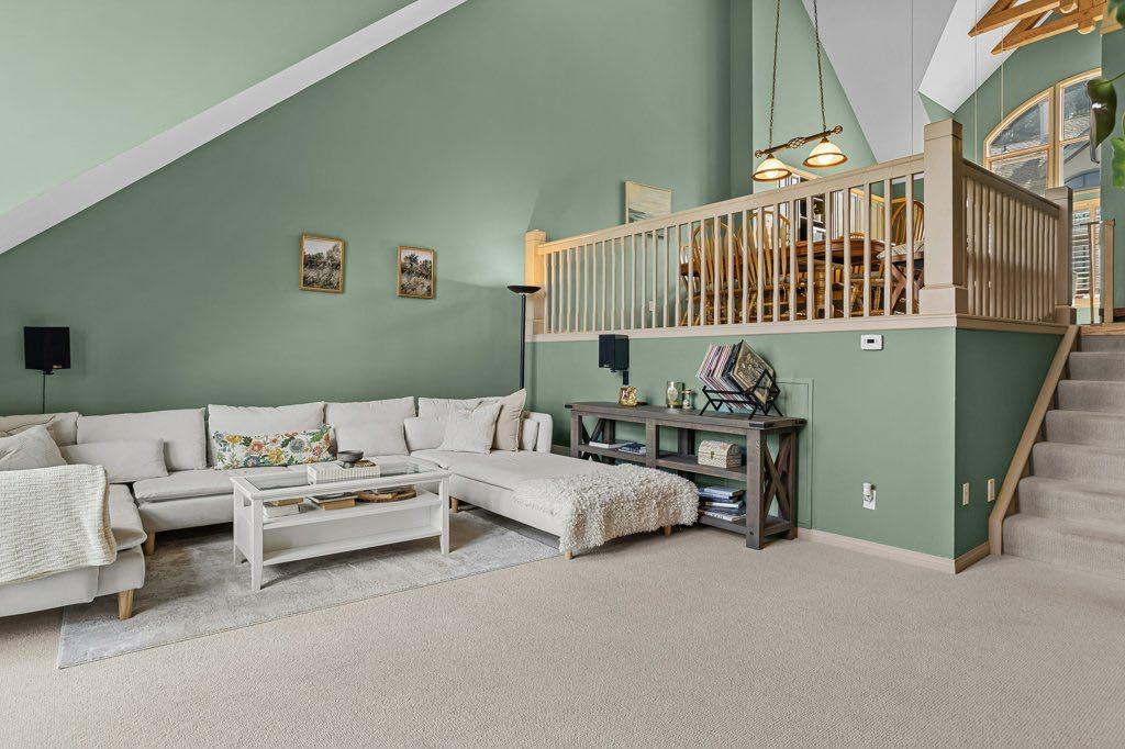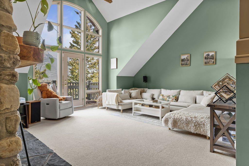 Offering over 2,400 sq. ft. of living space, the main level features vaulted ceilings and an open-concept layout that connects the living room, dining area, and kitchen with ease. Large windows on both sides capture Bow Valley mountain views and bring in natural light throughout the day.