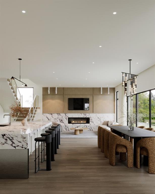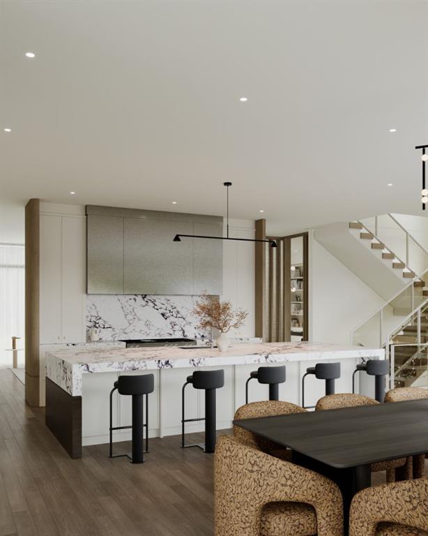 Experience an extraordinary expression of modern luxury in this architecturally striking residence designed by Midnight Designs, with interiors curated by Stephanie Martin and meticulously built by Ambedo Homes. Thoughtfully composed with clean contemporary lines, expansive windows, and a refined material palette, the home offers over 5,500 square feet of total developed living space, including a fully finished lower level and a rare attached triple tandem garage. The main floor unfolds through a dramatic open concept layout where natural light fills the interiors, and wide plank hardwood flooring and warm textures create an inviting yet sophisticated atmosphere. A welcoming foyer introduces the home’s architectural language, while a private main floor office offers a refined workspace with custom built in cabinetry. The heart of the home is the stunning chef’s kitchen designed as both a functional workspace and architectural showpiece, highlighted by an oversized waterfall island finished in bold stone with rich burgundy veining, custom cabinetry with integrated hardware, and a concealed range wall framed by textured metal panels and full height stone surfaces. Premium appliances are complemented by a fully equipped walk through pantry with additional prep space and storage, while the adjacent dining and living areas flow seamlessly together, anchored by a striking linear fireplace set within a dramatic feature wall, custom oak panelling, and expansive windows. A thoughtfully designed mudroom with built in storage connects directly to the attached triple tandem garage, while sculptural lighting, curved millwork transitions, wood stair treads, and a dramatic staircase illuminated by large picture windows add architectural presence throughout the home. The upper level offers four bedrooms, including an exceptional primary retreat, a central loft style bonus space, and a convenient laundry room with built in cabinetry. The primary suite unfolds through a series of elegant spaces beginning with the serene bedroom and continuing through a dressing gallery lined with windows into a boutique style walk through wardrobe with custom cabinetry and a center island. The spa inspired ensuite features a freestanding soaker tub beside oversized windows, custom double vanities with brass hardware, in floor heating, and a large walk in steam shower finished with full height stone tile, bench seating, and dual rainfall and handheld fixtures. The fully developed lower level expands the home’s functionality with a spacious recreation and media lounge, gym, one additional bedroom, and a full bathroom ideal for guests or extended family. Situated on a quiet tree lined street in one of Calgary’s most sought after inner city communities, this exceptional residence offers a rare combination of architectural sophistication, curated interiors, and elevated modern living just minutes from parks, schools, and the city’s best amenities. Call today to book your private tour!