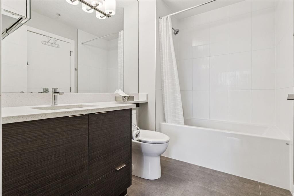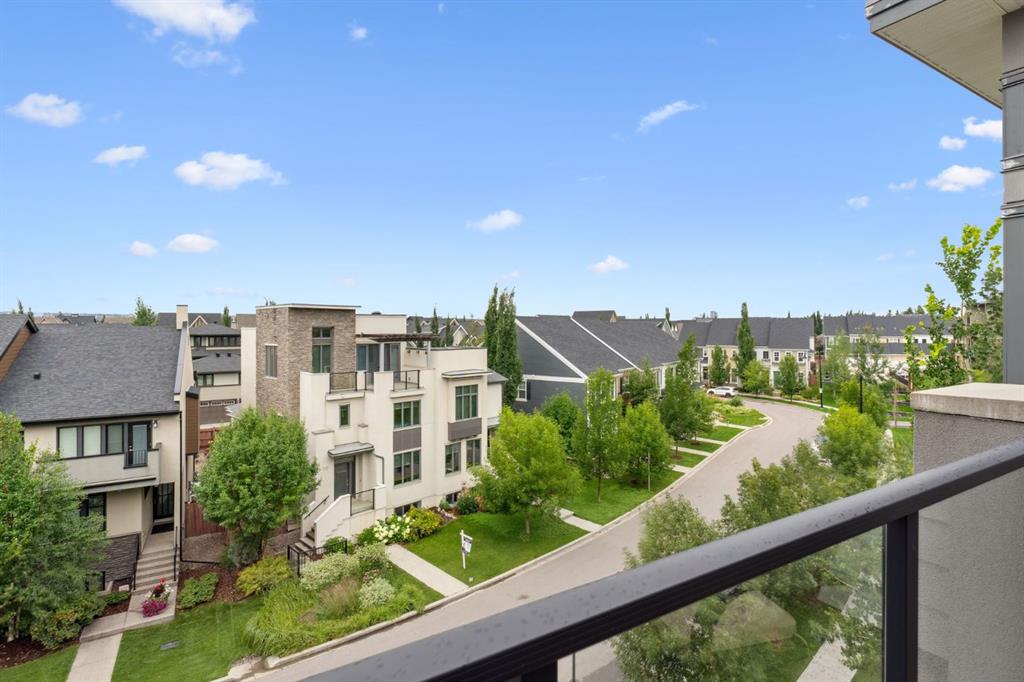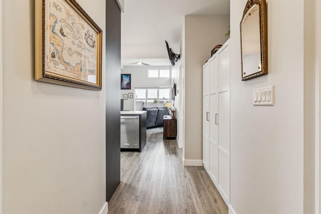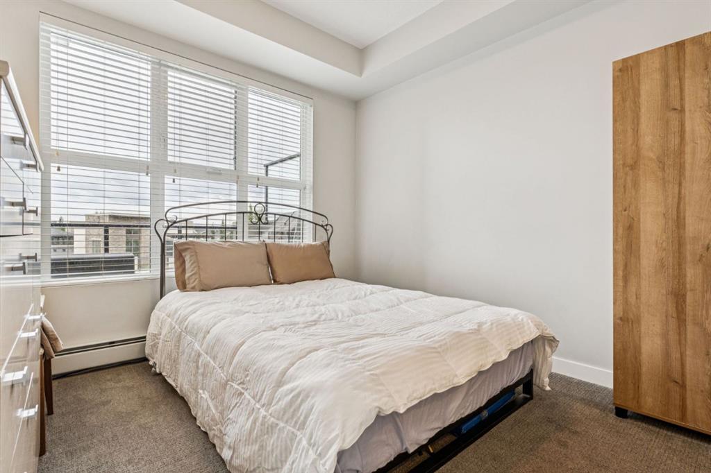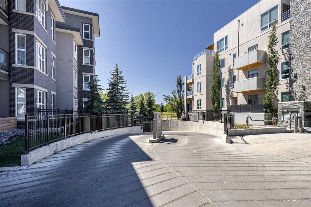 PREMIUM Top-Floor Living with 12FT Ceilings in the Urban Sanctuary of Currie Barracks! Nestled amongst Million-Dollar Homes these 4th Floor Condo’s are designed for the distinguished buyer. This Top Floor 2 Bedroom 1 Bath Configuration are RARELY offered. Generous West Natural Light that stands out for this condo while Neutral & Modern toned Luxury Vinyl Plank floors combined with BEAUTIFUL European-Inspired Kitchen, the throughout are TOP NOTCH & Well maintained with Gorgeous Quartz Countertops, two-toned cabinetry, new LED lighting & HEX backsplash all tastefully combine for a Luxurious feel. Sleek Appliance package includes Fisher-Paykel fridge with Gas Stove too! Pull up to the eating bar or room enough for a small table, as desired. Main Living area enjoys the Exclusive 12 FT Ceilings only found on the top-floor! Large nearly 12 x 12 living room with New FAN/remote with ample space enough for relaxation. Enjoy watching Calgarys always-changing WESTERLY weather systems from your BRIGHT OPEN Balcony/deck. Luxe Carpeted Master Bedroom with Walk-thru closet to cheater 4pce Ensuite. Stackable in-suite Laundry and extra storage as well. 2nd Bedroom/Flex/Den with new LED lighting fixture, nearly 9 x 9FT to be used as desired. Extra Pantry storage recently added off-kitchen. Fantastic & Well-maintained Common Areas interior/exterior. throughout the grounds for the furry friends in this pet-friendly complex. Recently painted COMMON AREAS, Regular Bldg maintenance includes Window cleaning, Plumbing, Parkade Cleaning, Secured Titled Underground heated Parking stall with ample visitor parking (guests can be buzzed in) with lockable storage cage. Bike Room Storage, Car wash for residents and coin-op soap dispenser. Quick access to downtown, MRU, minutes to Amenities of Garrison Woods, neighbourhood restaurants/pubs, Glenmore Trail, Stoney Trail, or great investment for the University Students. Eclectic mix of residents, young professionals, established folks for this Premium condo complex!