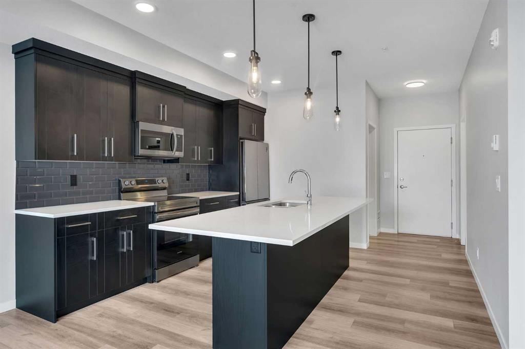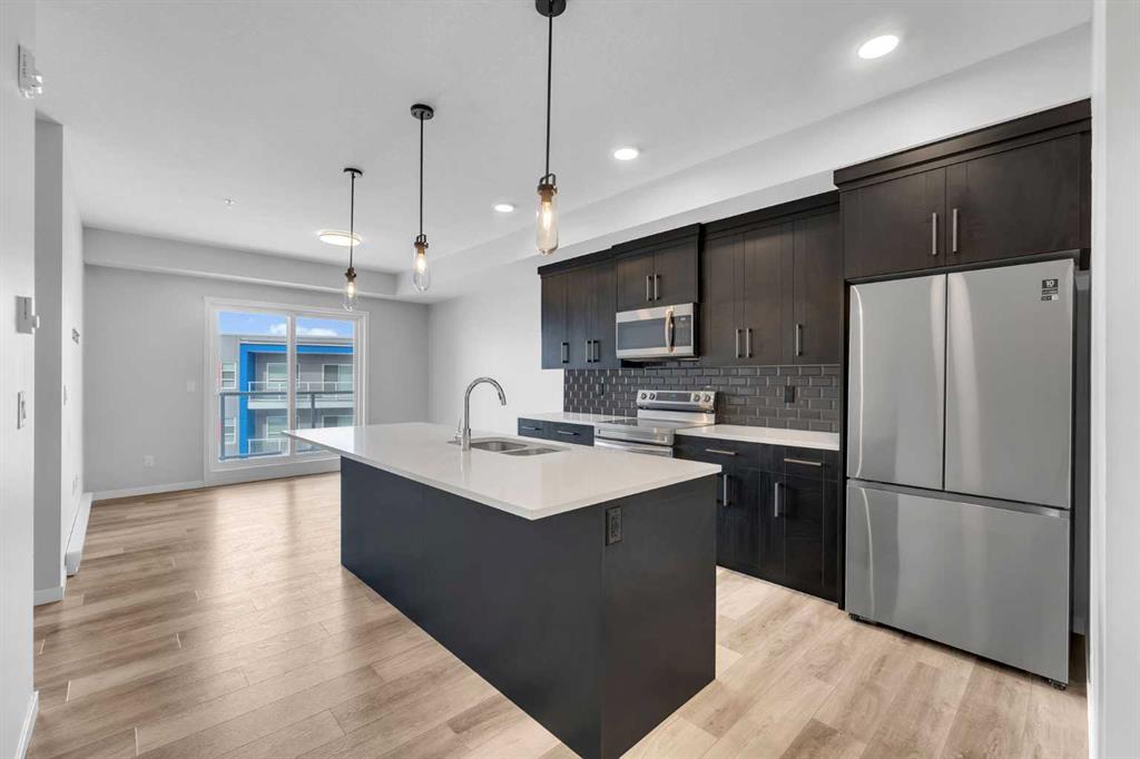 Durable vinyl plank flooring runs throughout, with the kitchen anchored by a quartz island—perfect for cooking, entertaining, or everyday living. The kitchen flows seamlessly into the living area and out to a private balcony.