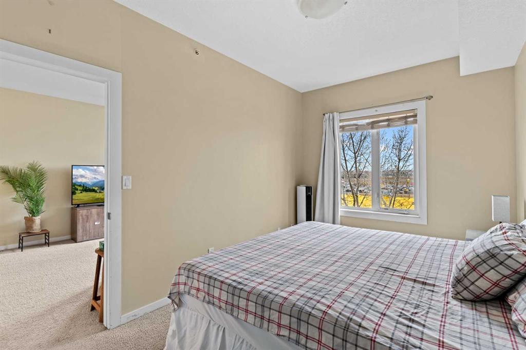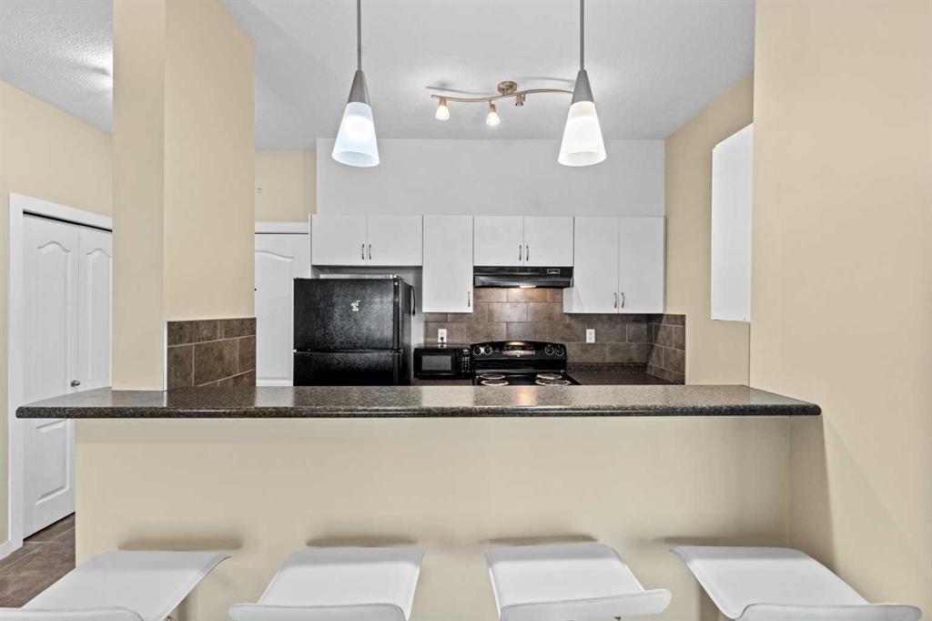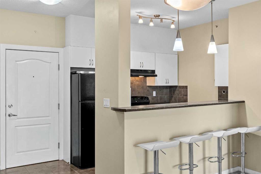 The kitchen anchors the space with a large eating bar, perfect for morning coffee or catching up with friends over dinner. From here, the layout opens seamlessly to the living area — bright, inviting, and surrounded by mature trees that give a sense of privacy rarely found in condo living. Step out onto your private balcony and take in the uninterrupted west-facing mountain views — your own little escape from the city below.
