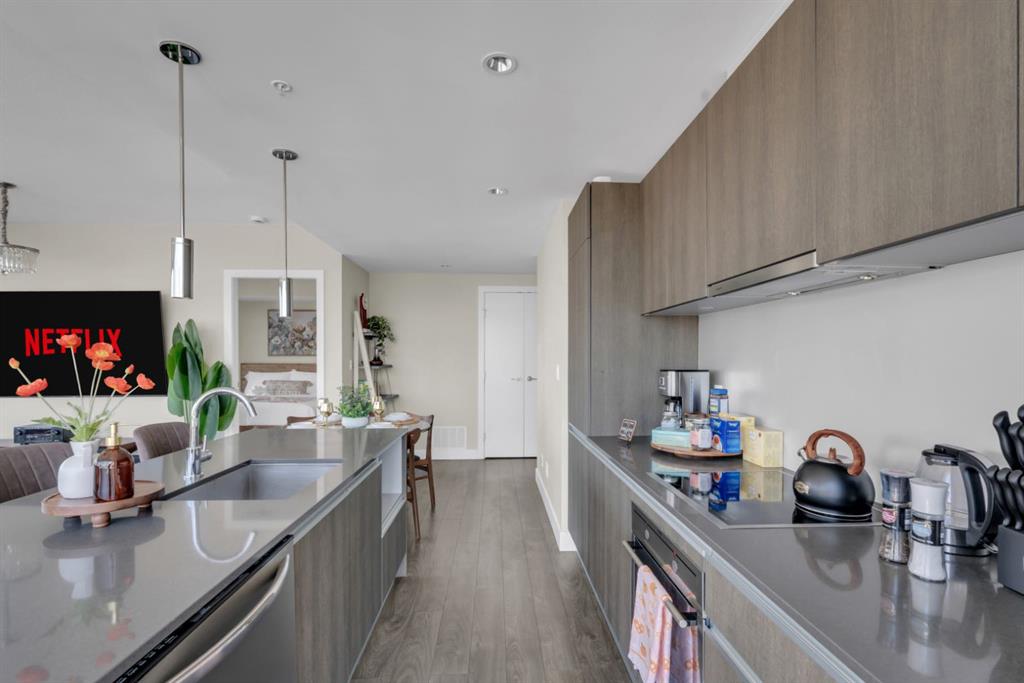 The thoughtfully designed layout features a large, open-concept living area, ideal for both relaxing and entertaining. The modern kitchen is equipped with quartz countertops, Italian Armony Cucine cabinetry, and a sleek induction cooktop, blending style with functionality. The unit includes two well-sized bedrooms and two full bathrooms, offering comfort and privacy for residents, guests, or shared living. Step out onto your private balcony with BBQ, perfect for enjoying morning coffee or evening skyline views in your own outdoor space. This home has been exceptionally maintained and thoughtfully styled, creating a warm, upscale feel that stands apart from standard builder-grade units.