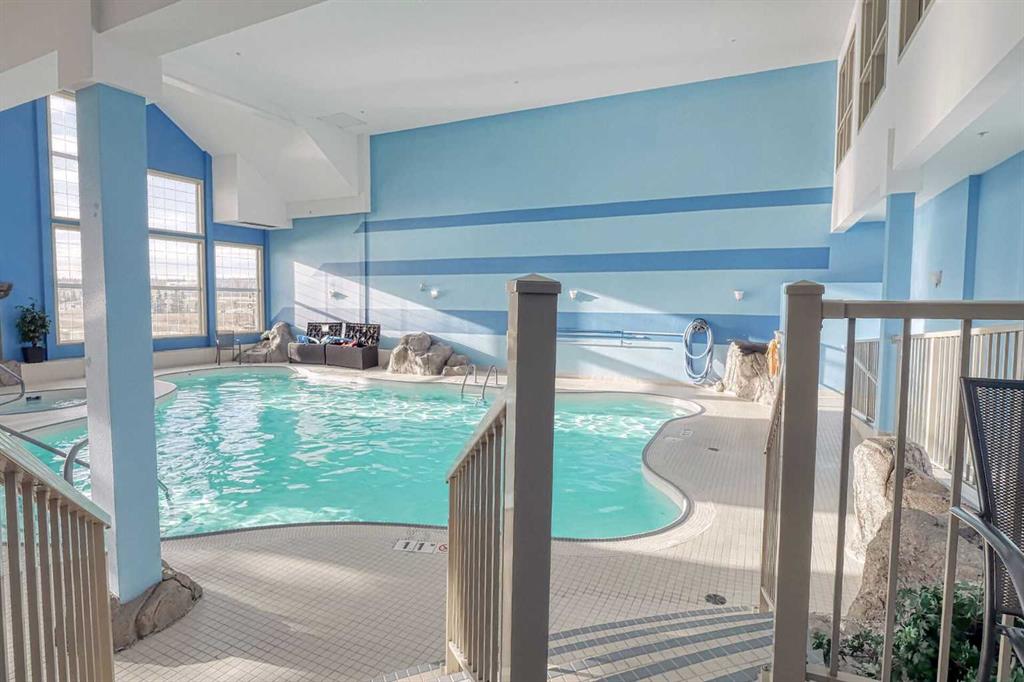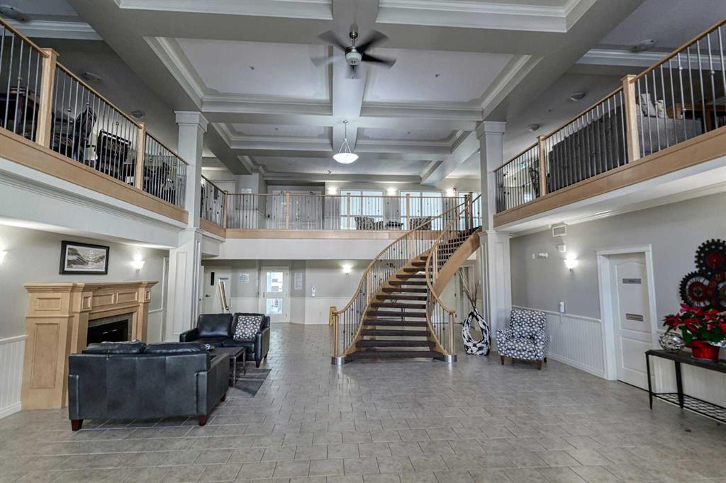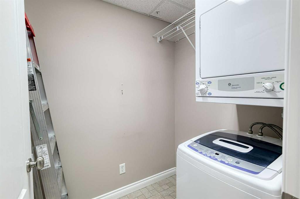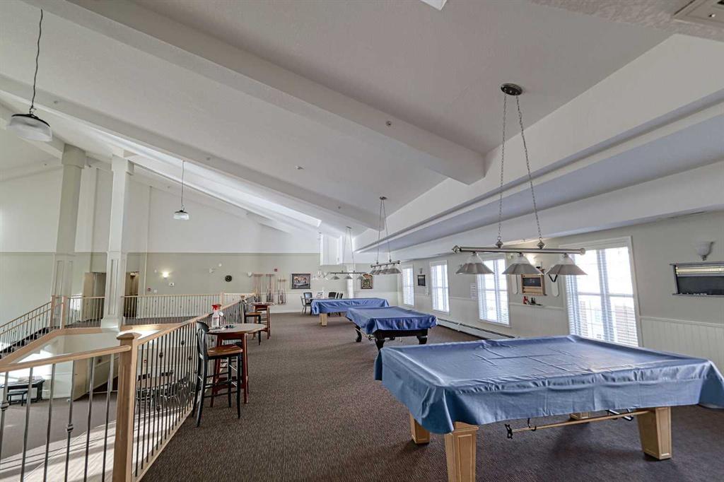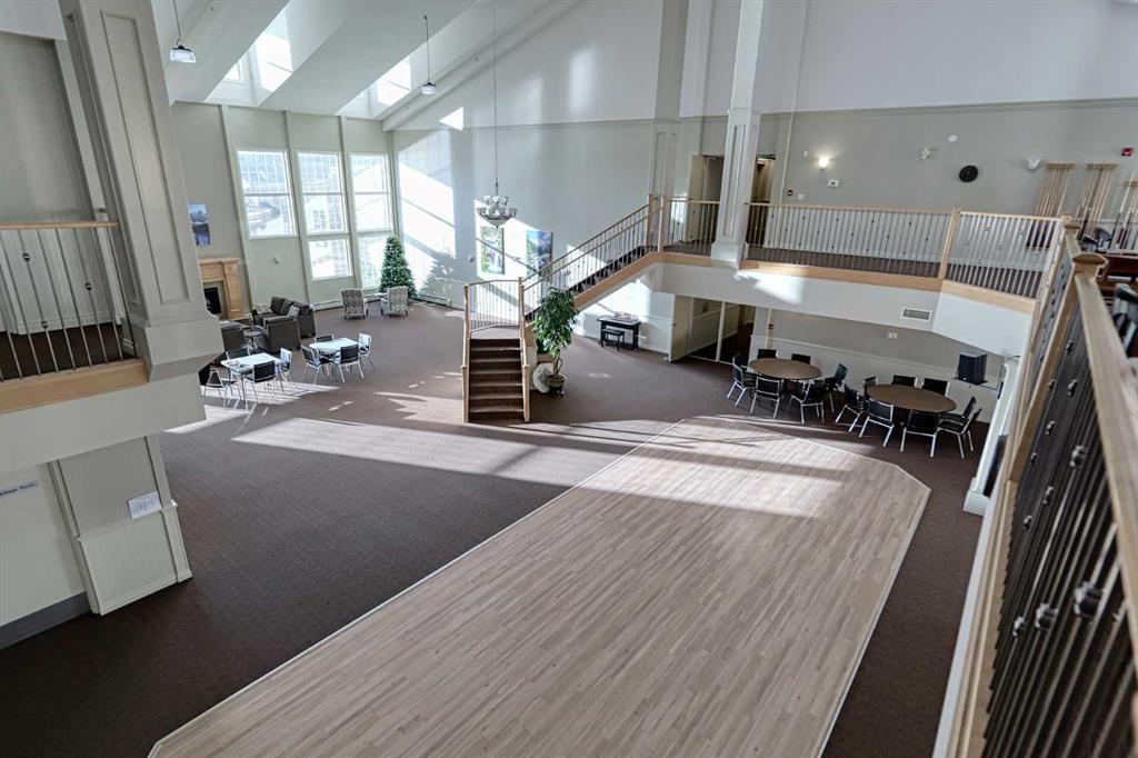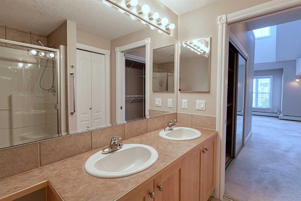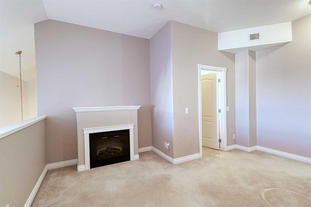 Welcome to this spacious 1,295 sq. ft. multi-level, top-floor condo in the sought-after Country Estates on the Cove, featuring TWO TITLED UNDERGROUND PARKING STALLS and air conditioning. This rare layout offers soaring two-storey ceilings in both the living room and primary bedroom, creating a bright, open feel with impressive natural light. Freshly painted throughout, the open-concept living and dining areas flow seamlessly into the kitchen with solid maple cabinetry. A combined laundry and pantry room adds excellent convenience and storage, while the balcony is accessed directly from the living room. The primary bedroom features a dramatic vaulted ceiling, walk-through closet, and private 4-piece ensuite with double vanity. A second bedroom, additional 4-piece bathroom, and an open loft overlooking the living room complete the layout. The loft includes a 2-piece bathroom and electric fireplace, ideal for a home office or flexible living space. This well-managed 40+ adult community offers exceptional amenities including a fitness centre, indoor pool, hot tub, recreation room with games and bowling alley, library, woodworking shop, guest suites, car wash bay, and assigned storage. Condo fees include all utilities. Conveniently located near shopping, parks, and walking paths, with easy access to Deerfoot Trail, Stoney Trail, transit, and the airport.