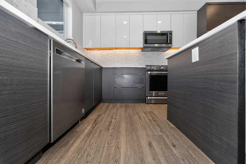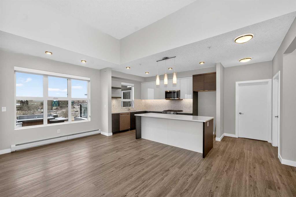 Discover this exceptional penthouse nestled in the heart of Currie Barracks, offering unparalleled elegance and comfort. Located on the top floor of a stunning four-storey building, this residence features soaring ceilings and an expansive open-concept living and dining area perfect for both relaxing and entertaining. Step outside onto the massive terrace, where breathtaking views and seamless indoor-outdoor living await. With dual balconies, you will enjoy stunning views from every direction, including mountain views from the primary bedroom balcony. Every detail of this penthouse exudes sophistication, from the sleek quartz countertops in the modern kitchen and bathrooms to the thoughtfully designed layout that maximizes space and natural light. For year-round comfort, the home is equipped with dual air conditioning units, one in the living room and one in the primary bedroom. Enjoy the convenience of two titled parking stalls in the heated underground parkade, along with two dedicated storage unit and secure bike storage. The parkade also offers 26 visitor stalls and a car wash for added convenience. The beautifully landscaped surroundings provide easy access to numerous nearby parks, creating a serene and inviting atmosphere. Experience the pinnacle of refined living in this one-of-a-kind penthouse where luxury truly meets lifestyle.