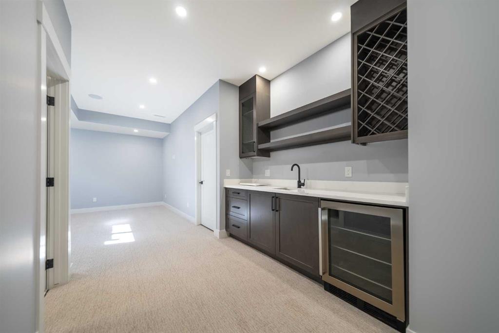 The professionally finished basement is designed for entertaining, featuring a stunning custom bar with black and gold accents, a wine display wall, spacious recreation room, full bathroom, and additional storage.