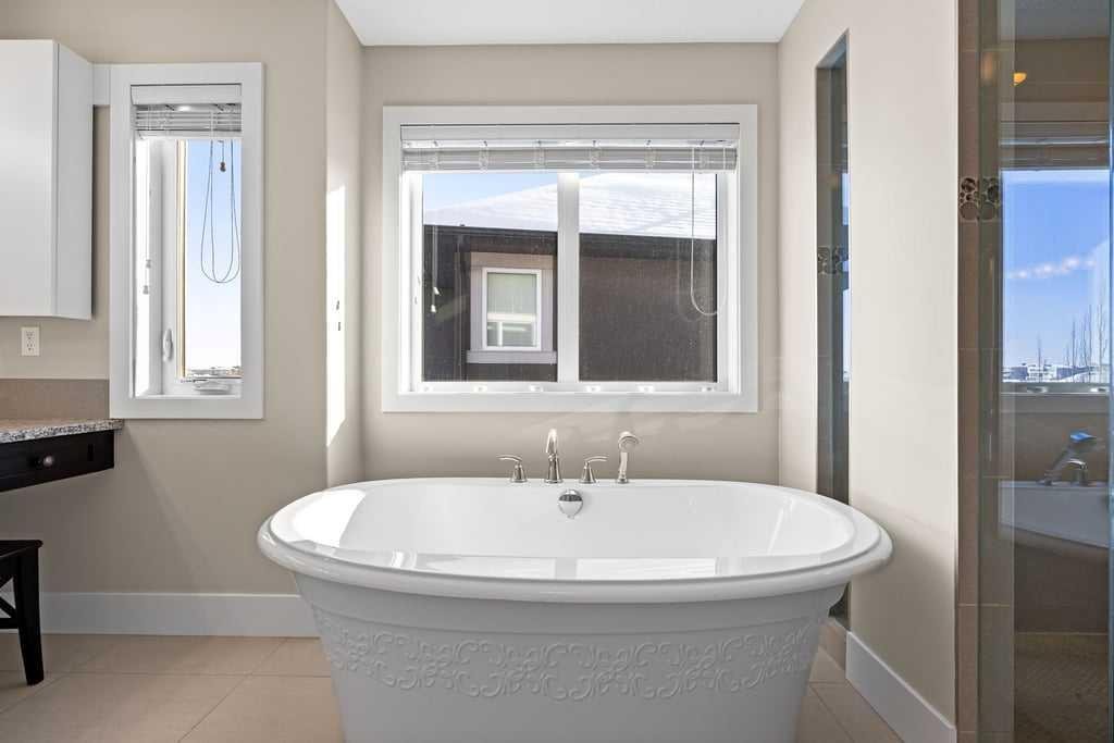 Upstairs, four well-sized bedrooms are complemented by a central bonus room with vaulted ceilings, creating an airy space ideal for family time or relaxing at the end of the day. One of the secondary bedrooms also features a vaulted ceiling, adding extra character and openness. The primary suite offers a large walk-in closet and a spacious ensuite featuring a soaking tub, separate shower, and extended vanity with a dedicated makeup station. One secondary bedroom includes its own ensuite and walk-in closet, while the remaining two share easy access to a full bath.