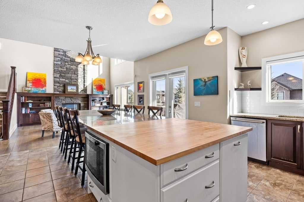 The kitchen is truly the centrepiece of the home. A dramatic island stretching nearly 14 feet creates a natural gathering place, comfortably seating up to ten while offering exceptional prep and entertaining space. Warm butcher block blends beautifully with granite countertops, while rich wood cabinetry extends to the ceiling for abundant storage. Pendant lighting adds warmth overhead, and the adjacent eating area opens directly onto the deck, creating effortless indoor-outdoor living for summer evenings and weekend gatherings.