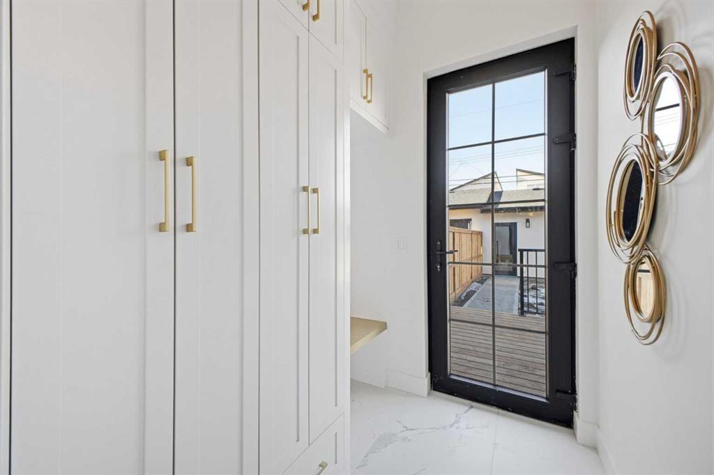 Upstairs, you’ll find 9-foot ceilings throughout, an expansive primary bedroom with large windows and 13.5 foot vaulted ceilings, a walk-in closet with custom built-ins, and a luxurious 5-piece ensuite with in-floor heating, dual sinks, quartz counters, freestanding soaker tub, and a tiled glass shower. Two additional bedrooms offer generous space and light, while the main bathroom includes double sinks and full-height tile tub surround. The upper floor also features a spacious laundry room with built-in cabinetry and a linen closet.