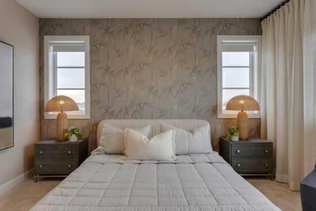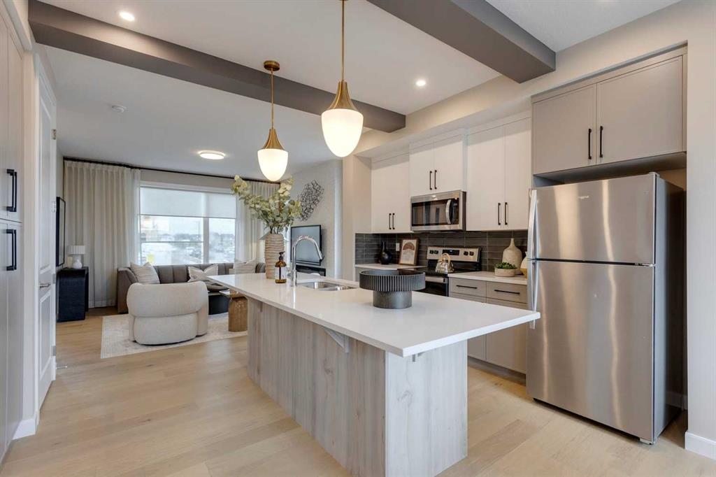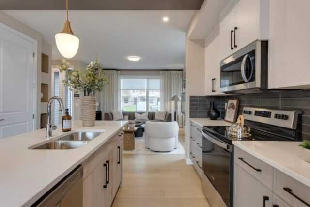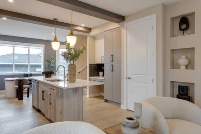 Discover the St. Andrews, expertly crafted by Douglas Homes. This 1294sqft. end-unit, fee simple townhouse delivers a turnkey lifestyle with a convenient side entrance and no condo fees. Located in the sought-after community of AmbleRidge, one of Calgary’s newest neighborhoods, this home stands out with quality upgrades already included. Enjoy 9-foot knockdown ceilings, luxury vinyl plank flooring, quartz countertops, and 42-inch upper cabinets. The bright, open-concept main floor showcases a spacious great room with oversized windows and an optional fireplace. The impressive 9-foot kitchen island comfortably seats 6–8, making it ideal for entertaining, while the adjoining dining area overlooks the sunny west backyard. Upstairs, the primary suite features a walk-in closet and a stylish 3-piece ensuite with quartz counters and a vanity with drawers. Two additional generously sized bedrooms provide plenty of space for family, guests, or a home office. A well-appointed 4-piece main bath includes quartz surfaces, a generous vanity, and a deep soaker tub. You’ll also appreciate the convenience of an upper-floor laundry room The basement is thoughtfully designed and ready for future development. Outside, the home is fully landscaped and includes a rear deck, fenced yard, and double garage. Don’t miss your chance—schedule your viewing today. Photos shown are from a previously built home and are intended to illustrate style and finishes; actual layouts and features may vary. First-Time Home Buyers’ GST Rebate: Eligible buyers may receive up to $50,000 on a new home purchase. Applicants must be 18 or older, a Canadian citizen or permanent resident, and not have owned or lived in a home owned by themselves or their spouse/common-law partner in the past four years. All terms and conditions are subject to Government of Canada/CRA guidelines.