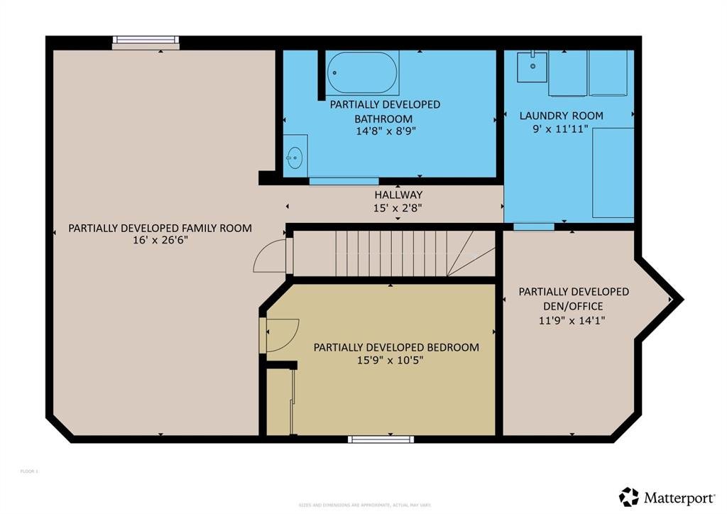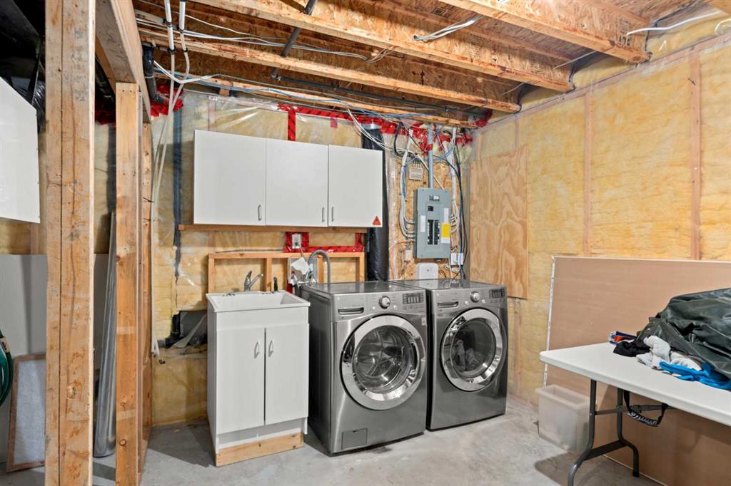 The partially finished basement offers excellent potential, including a large bedroom with closet, a spacious family/games room, and a bathroom that is roughed-in with a tub and vanity (not yet connected). There is also a framed den/office space and a functional laundry room with washer, dryer, and sink.