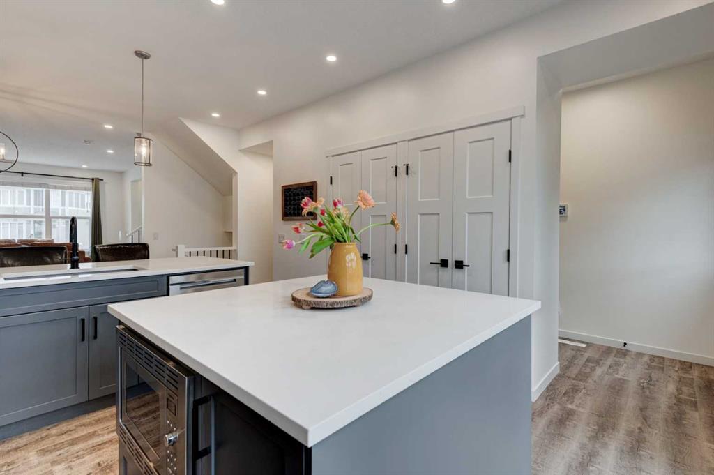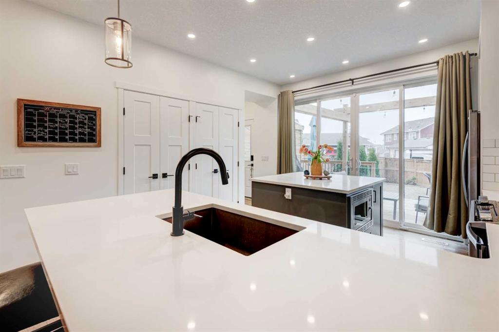 ** Open House Saturday April 25th from 1pm-3pm! ** Welcome to this bright 4-bedroom, 3.5-bathroom two-storey home, set on a spacious 4,962 sq ft southwest-facing pie lot with an oversized 24×24 heated garage and RV parking, located in the award winning lake community of Mahogany. This lovingly well-maintained home offers a very functional layout with modern finishes, upgrades throughout, and a fully finished basement. The open concept main floor features the stylish kitchen with quartz countertops, island with drawers, cabinets, and bar seating, stainless steel appliances, useful pantry, and added broom/vacuum storage. Upgraded sliding patio doors in the kitchen create a smooth transition to the outdoor deck, while allowing an abundance of natural light to fill the main floor. The living room features an electric fireplace with custom floating wood shelves and flows seamlessly into the dining area. The rear mudroom with built-in lockers adds everyday practicality, and the powder room completes the main level. The upper level includes three bedrooms, two full bathrooms, a laundry room with shelving and a linen closet. The spacious primary suite accommodates a king-sized bed and additional furniture, and features a walk-in closet and the beautifully finished ensuite with dual sinks and a fully tiled walk-in shower. The fully finished basement includes the spacious family room, fourth bedroom, full bathroom, storage, and utility room. Central air conditioning, added in 2025, keeps the home comfortable all summer long. The oversized southwest-facing yard features a lovely deck with a gas line for a BBQ and pergola, fenced RV parking, and a heated 24×24 garage with an extra wide 18-foot wide overhead door. Enjoy this quiet location just steps from a park and playground, with easy access to major routes leading to Mahogany Lake and nearby amenities including restaurants, grocery stores, and shops. This very well cared for, fully finished home with a large yard and oversized garage is ready to impress, don’t miss your chance to make it yours.