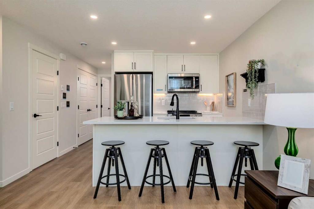 Welcome to the Braeburn at ZEN Livingston – a stylish, energy-efficient townhome built by a NET ZERO builder! Offering 518 sq.ft. of thoughtfully designed space, this 1 BED, 1 BATH home features triple-pane windows, advanced insulation, and modern construction that keeps utility bills low and comfort high. The open-concept main floor boasts Cicero Luxury Vinyl Plank flooring, and a bright living area. The sleek kitchen is complete with white ice quartz countertops and a 6-piece Whirlpool appliance package. Built with HARDIE BOARD siding (hail/fire-resistant) for long-lasting durability.Be part of a vibrant community just steps from the Livingston Hub with splash park, rink, courts & more! Plus, enjoy quick access to Stoney Trail (3 min), YYC Airport (13 min), and CrossIron Mills (11 min). Photos are representative.