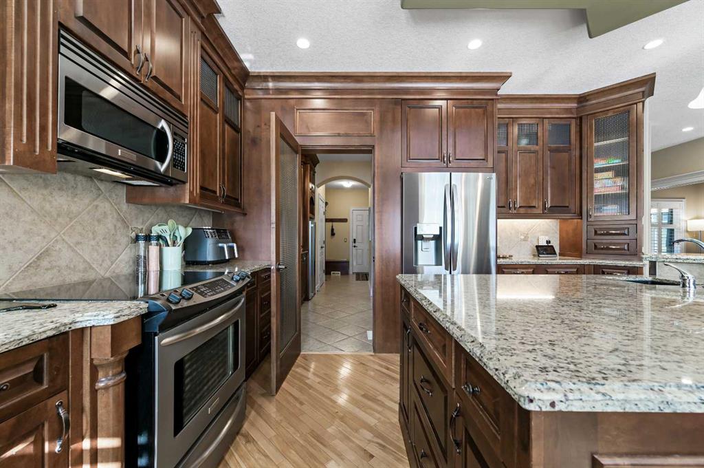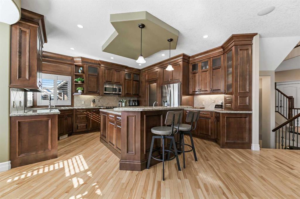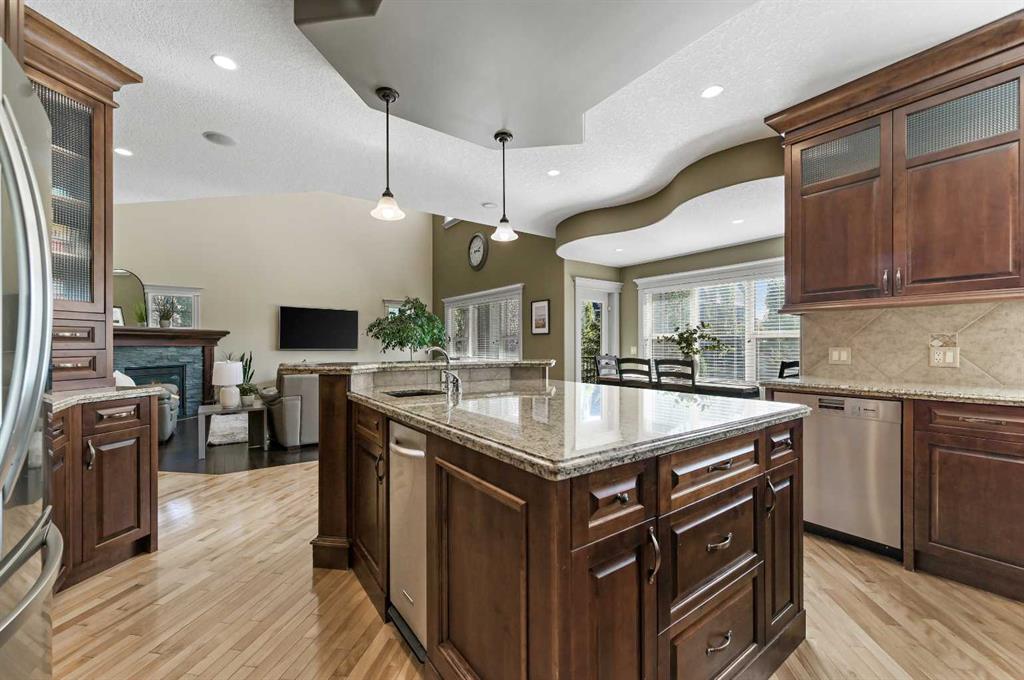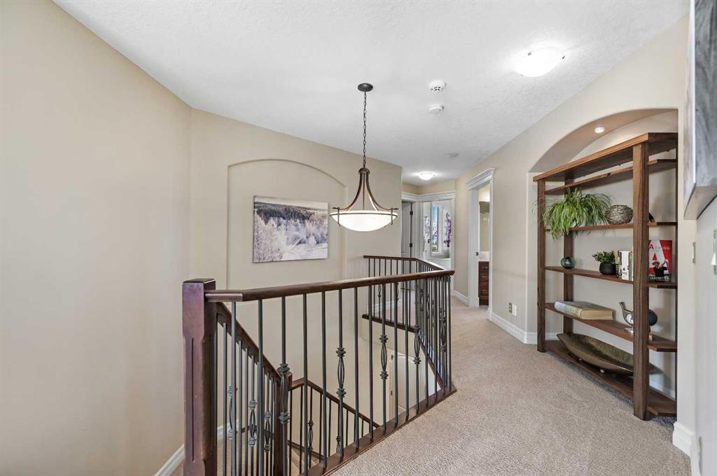 Executive Walkout Home in Coopers Crossing! Discover a home designed for both family living and entertaining in this highly sought-after community, perfectly positioned on a quiet cul-de-sac and backing directly onto walking paths and green space enjoying a sunny south exposure. This executive walkout property offers a rare combination of privacy, functionality, and luxury upgrades throughout. The open concept main floor features soaring ceilings, maple hardwood flooring, a gourmet kitchen, butler’s pantry, gas fireplace, and central A/C. The living room is anchored by dramatic floor-to-ceiling windows extending to the upper level, flooding the space with natural light. The kitchen is as functional as it is stylish, with granite counters, stainless steel appliances, a large center island, and a walk-through butler’s pantry for added storage. The dining area, surrounded by southwest exposed windows, opens to a large rear deck which is perfect for hosting or enjoying tranquil views of the park. A private den/home office and mudroom complete this level. Upstairs, a sweeping curved staircase leads to the luxurious primary retreat, featuring a spa-inspired 5-piece ensuite and a custom walk-in closet. This level also includes two generous bedrooms, a full bathroom, and a convenient upper floor laundry room. The fully developed walkout level expands the living space with a spacious rec room, corner fireplace, games area, wet bar, full bathroom, and an additional bedroom. Step outside and you’ll find a beautifully landscaped southwest-facing backyard, offering sun-filled afternoons, privacy, and direct access to pathways and green space. A covered hot tub area adds the perfect spot to unwind year-round. Additional highlights include a heated double garage, fully finished with insulation, drywall, and epoxy flooring. Beautifully maintained, this home reflects exceptional pride of ownership and is sure to impress. Book your private showing today and experience all that Coopers Crossing has to offer.