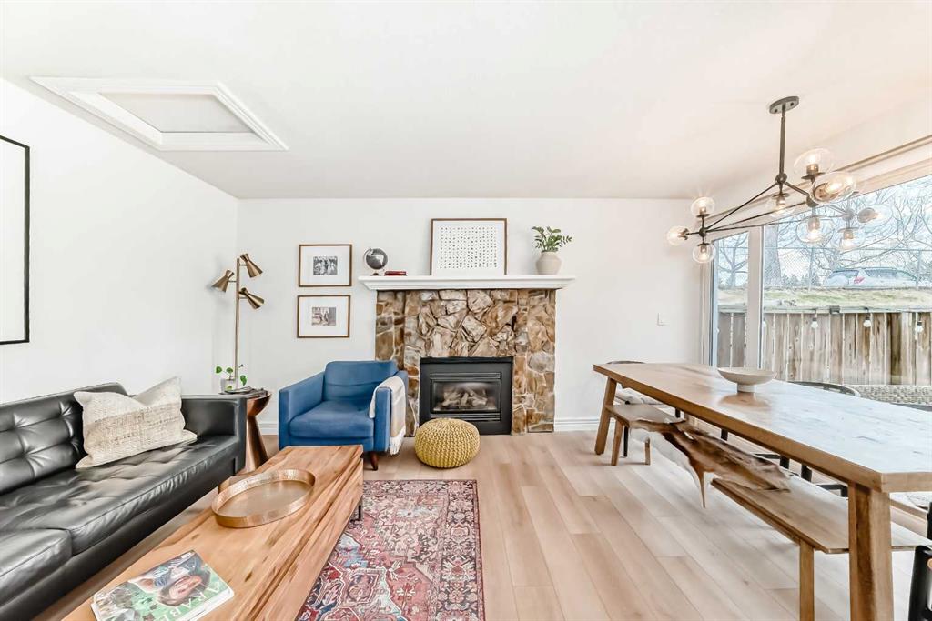 The kitchen has been fully updated with professionally painted Benjamin Moore cabinetry, boxed enclosures to the ceiling, upgraded black fixtures, and newer stainless steel appliances, including a Samsung OTR microwave, French-door refrigerator, and slide-in convection stove. The home also features new luxury vinyl plank flooring throughout, hexagon and French inspired subway tile accents, fresh Benjamin Moore paint, and three stunning feature walls that add warmth and charm. Additional upgrades include new toilets, hardware, lighting, blinds, plantation shutters, and a Phantom screen leading to the main floor deck. A cozy gas fireplace anchors the main living area, creating a warm and inviting space perfect for relaxing or entertaining.