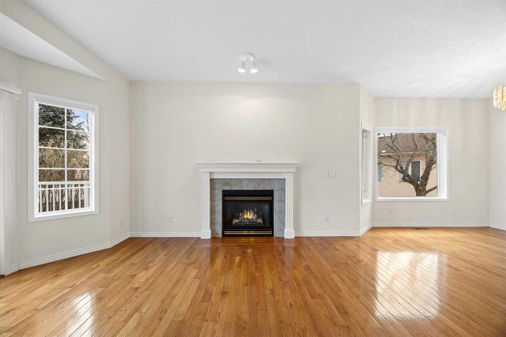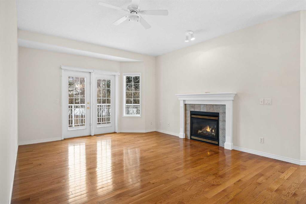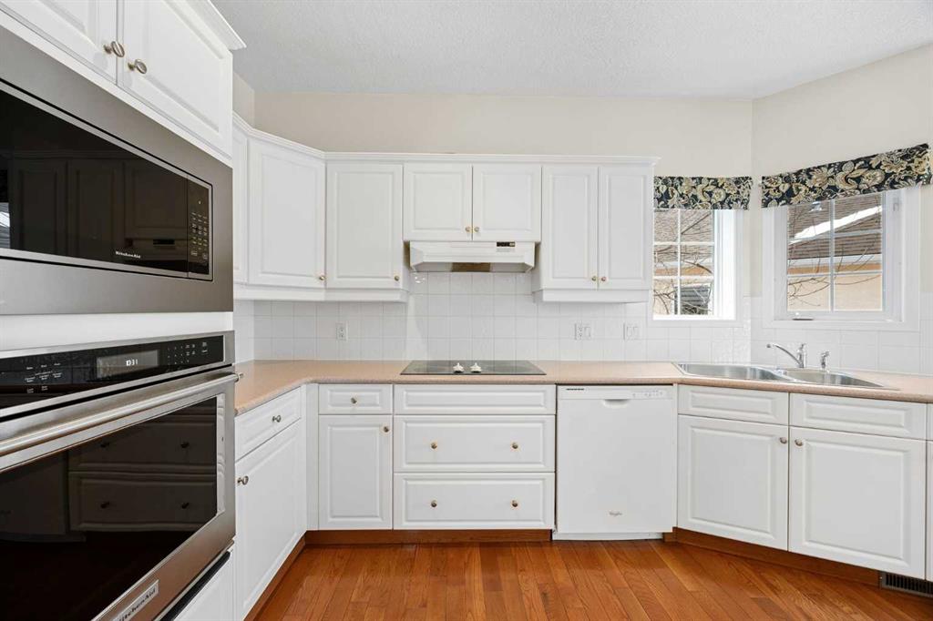 The bright white kitchen provides plenty of counter and storage space, with room for everyday meal prep and casual dining. Refaced cabinetry, an eating nook, and a new Kitchen Aid oven & microwave are included. Beautiful oak pre-finished hardwood is found throughout the main floor kitchen and family room. A large window in the family room provides an abundance of light, and the natural gas fireplace is perfect for those cold winter nights. Double doors open to the balcony, providing an additional entertaining or relaxing area.