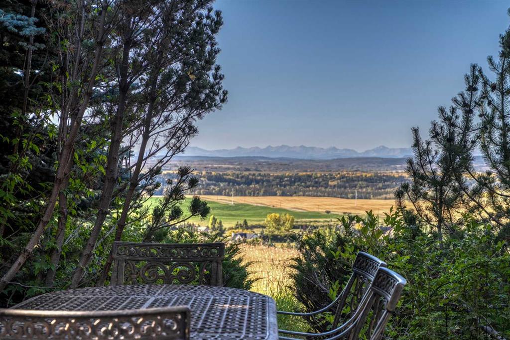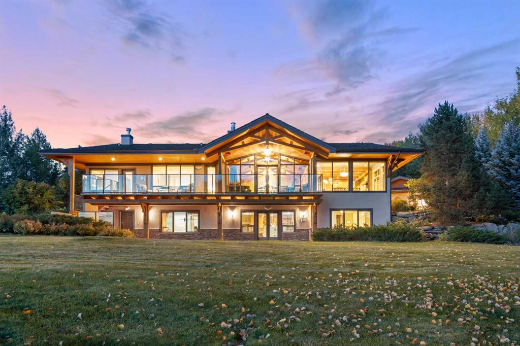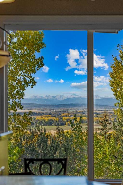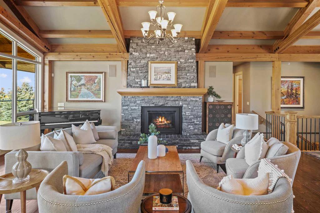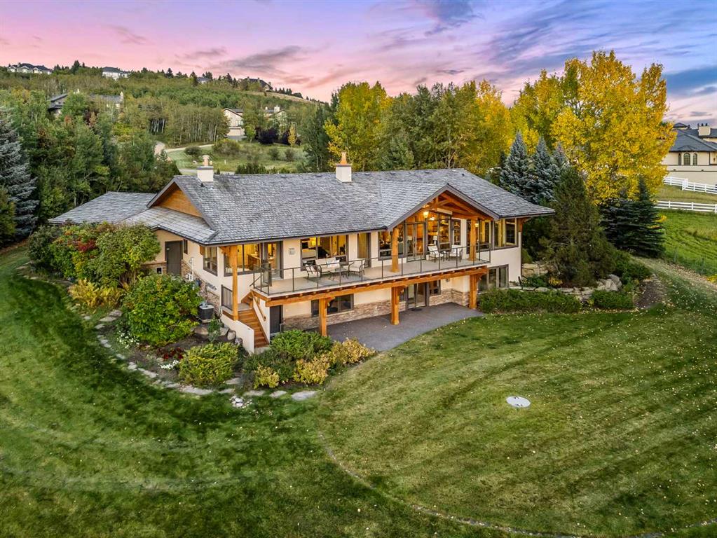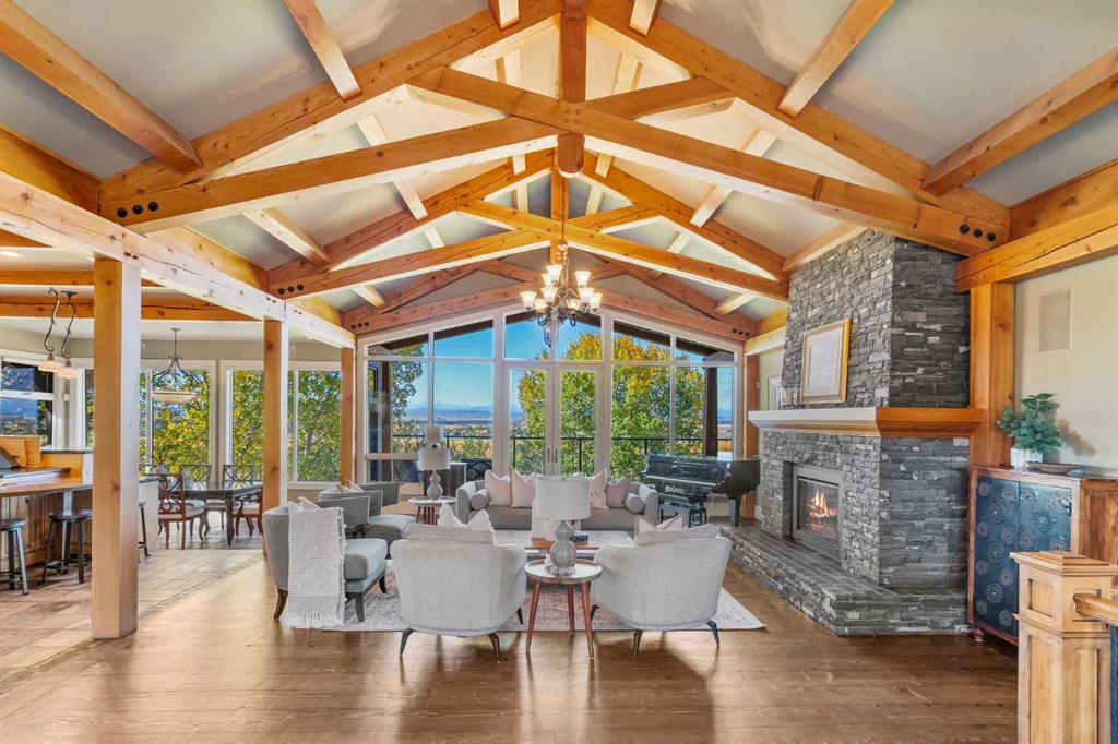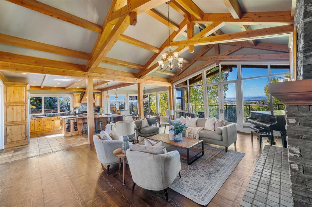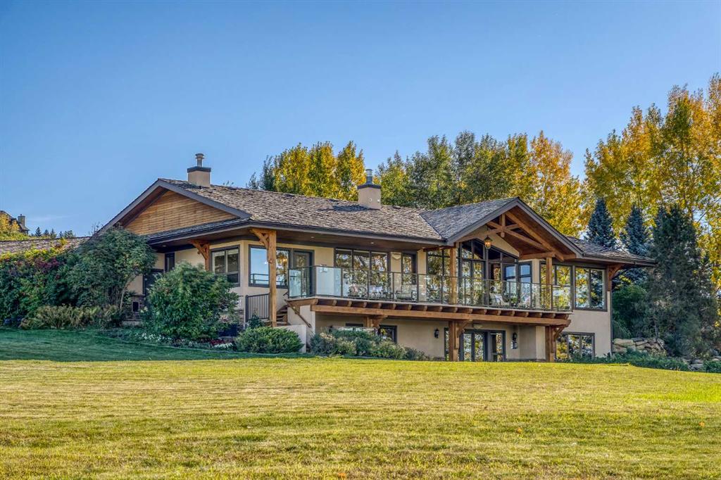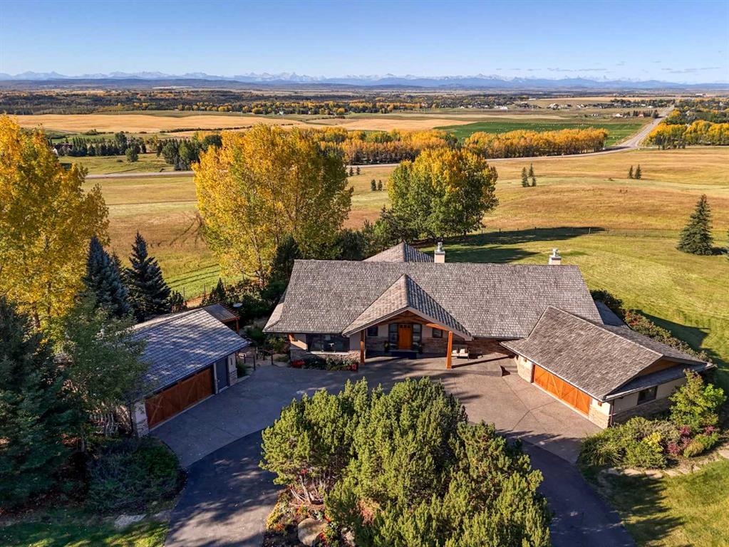 Introducing the Iconic Mountain View Estate – a landmark residence perched high in a premier Springbank location, embodying the very essence of elevated country living. Positioned gracefully on two pristine acres, this mountain-inspired walkout bungalow commands sweeping, unobstructed vistas of the Rocky Mountains, rolling foothills, and ever-changing prairie skies. From tranquil dawns to fiery alpine sunsets and dramatic summer lightning displays, every moment is framed by nature’s grandeur. Blending timeless architecture with authentic natural materials, the home radiates warmth and sophistication. Timber beams, cathedral-style vaulted ceilings, stone, slate, and wide-plank hardwood reflect the surrounding landscape, while wrought-iron details and artistic accents bring character and craftsmanship to every space. Each room is intentionally designed so that every window becomes a picture frame of the mountains set beyond. At the heart of the home, the Great Room creates a lasting impression. Towering timber frames, soaring ceilings, and a dramatic full-height stone fireplace create an atmosphere both grand and inviting. French doors lead to a spacious upper terrace where endless foothill and mountain panoramas inspire gatherings and quiet reflection alike. The chef’s kitchen is equally striking, anchored by a generous island with a curved eating counter, appointed with rich, custom Alder cabinetry, granite counters, and a professional six-burner gas range beneath a hand-crafted copper hood. Designed for both function and beauty, it flows seamlessly into the dining room, which opens onto a private courtyard. Here, an outdoor pergola dining area and lounge centered on a stone-clad fireplace provide an idyllic setting for morning coffee or intimate evening entertaining under the stars. The main level also offers a light-filled private office with French doors, a serene primary suite with spa-inspired finishes, and a well-appointed mudroom and laundry with ample storage. On the walkout lower level, expansive windows and radiant in-floor heating extend the lifestyle year-round. A spacious family/TV room, a custom-built wet bar and games area create space for both relaxation and entertainment. Three additional bedrooms, including one designed as a dual office and gym, are complemented by two full bathrooms. The estate’s grounds are equally considered. A circular front driveway, lined with mature trees and landscaped gardens, creates a true sense of arrival. Multiple outdoor living areas encourage year-round enjoyment, while car enthusiasts and hobbyists will appreciate four oversized heated garage spaces – attached and detached – seamlessly integrated with the architectural design. The Iconic Mountain View Estate is far more than a residence – it is a statement of style and sanctuary. A perfect harmony of mountain-inspired architecture, breathtaking natural beauty, and refined country living – it offers privacy, luxury, and inspiration every day.