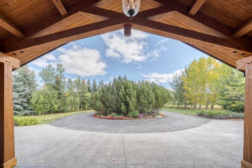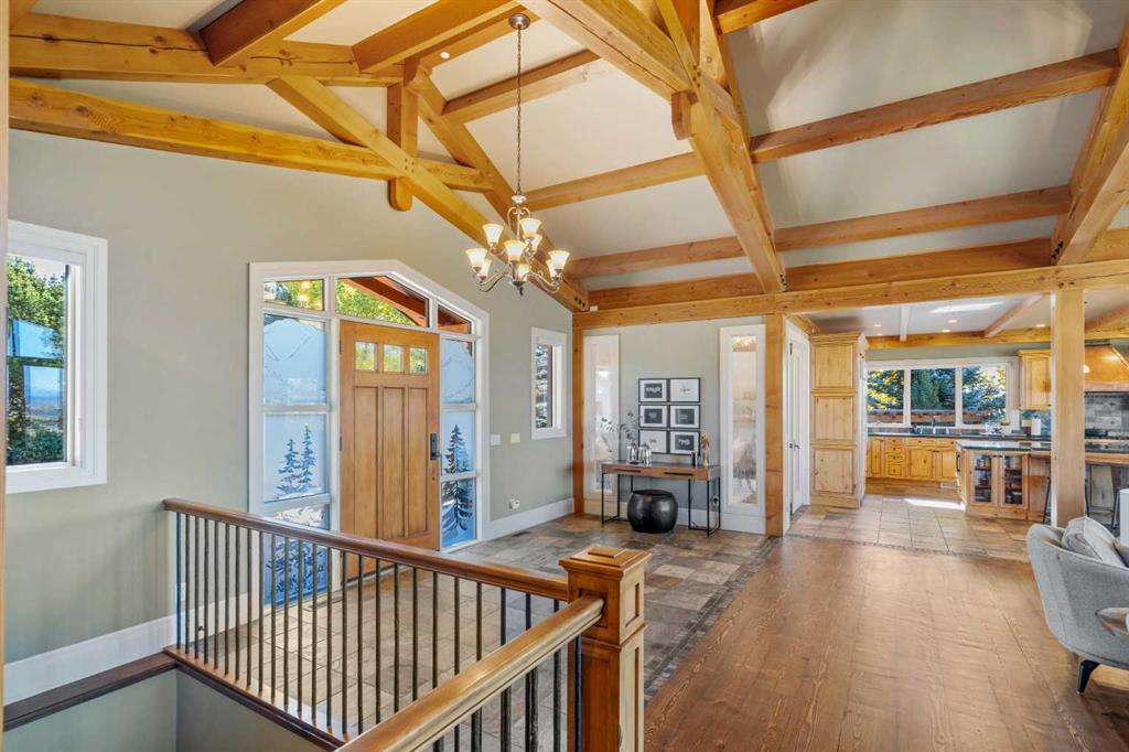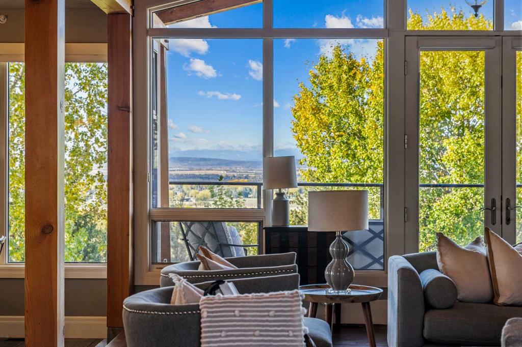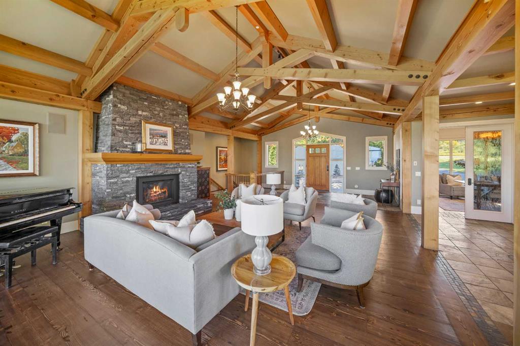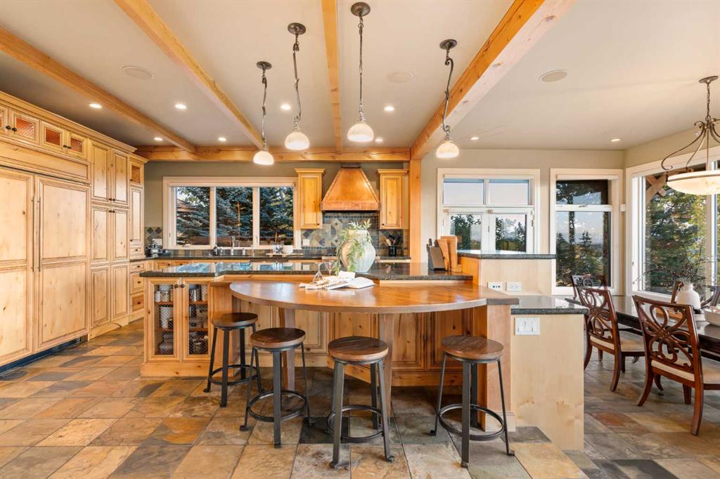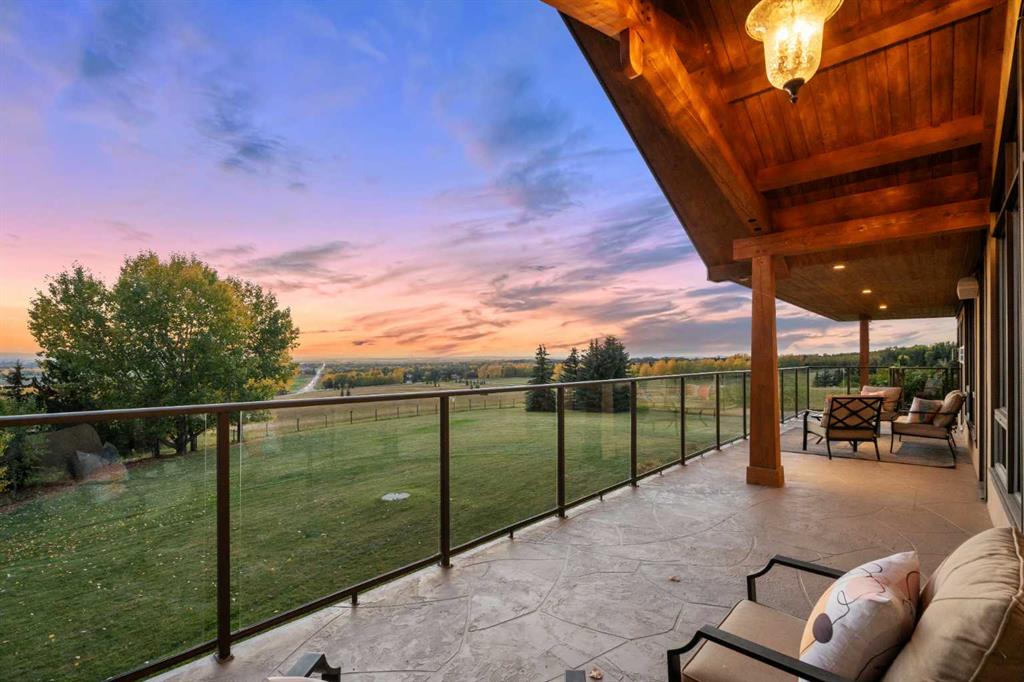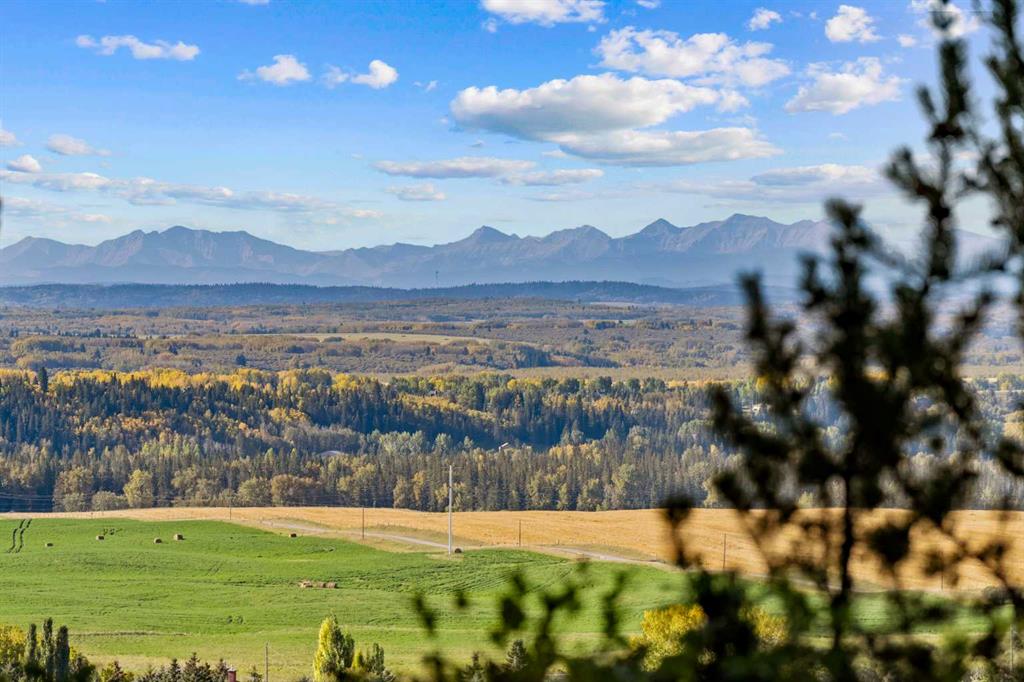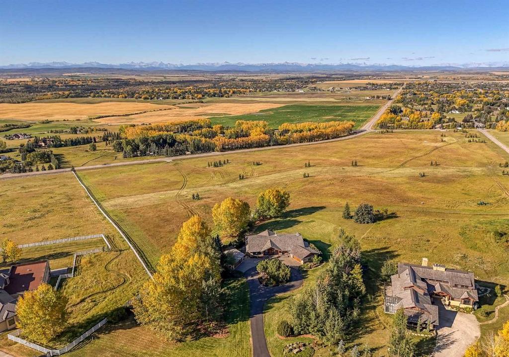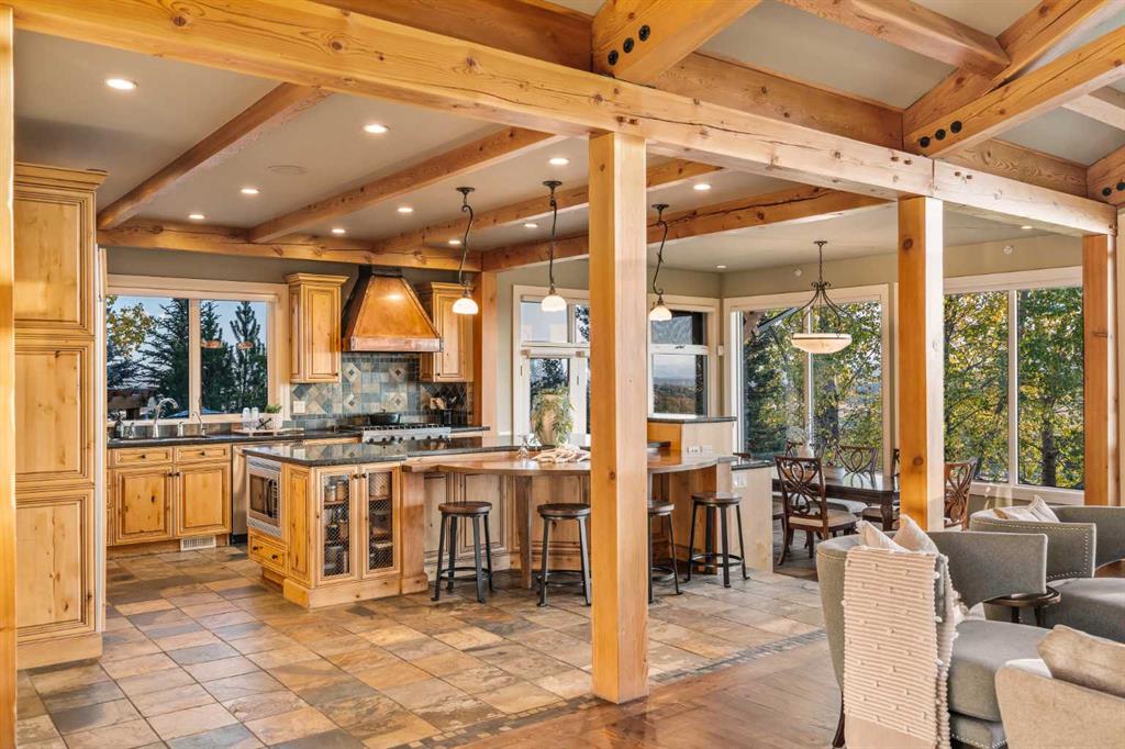 Introducing the Iconic Mountain View Estate – a landmark residence perched high in a premier Springbank location, embodying the very essence of elevated country living. Positioned gracefully on two pristine acres, this mountain-inspired walkout bungalow commands sweeping, unobstructed vistas of the Rocky Mountains, rolling foothills, and ever-changing prairie skies. From tranquil dawns to fiery alpine sunsets and dramatic summer lightning displays, every moment is framed by nature’s grandeur. Blending timeless architecture with authentic natural materials, the home radiates warmth and sophistication. Timber beams, cathedral-style vaulted ceilings, stone, slate, and wide-plank hardwood reflect the surrounding landscape, while wrought-iron details and artistic accents bring character and craftsmanship to every space. Each room is intentionally designed so that every window becomes a picture frame of the mountains set beyond. At the heart of the home, the Great Room creates a lasting impression. Towering timber frames, soaring ceilings, and a dramatic full-height stone fireplace create an atmosphere both grand and inviting. French doors lead to a spacious upper terrace where endless foothill and mountain panoramas inspire gatherings and quiet reflection alike. The chef’s kitchen is equally striking, anchored by a generous island with a curved eating counter, appointed with rich, custom Alder cabinetry, granite counters, and a professional six-burner gas range beneath a hand-crafted copper hood. Designed for both function and beauty, it flows seamlessly into the dining room, which opens onto a private courtyard. Here, an outdoor pergola dining area and lounge centered on a stone-clad fireplace provide an idyllic setting for morning coffee or intimate evening entertaining under the stars. The main level also offers a light-filled private office with French doors, a serene primary suite with spa-inspired finishes, and a well-appointed mudroom and laundry with ample storage. On the walkout lower level, expansive windows and radiant in-floor heating extend the lifestyle year-round. A spacious family/TV room, a custom-built wet bar and games area create space for both relaxation and entertainment. Three additional bedrooms, including one designed as a dual office and gym, are complemented by two full bathrooms. The estate’s grounds are equally considered. A circular front driveway, lined with mature trees and landscaped gardens, creates a true sense of arrival. Multiple outdoor living areas encourage year-round enjoyment, while car enthusiasts and hobbyists will appreciate four oversized heated garage spaces – attached and detached – seamlessly integrated with the architectural design. The Iconic Mountain View Estate is far more than a residence – it is a statement of style and sanctuary. A perfect harmony of mountain-inspired architecture, breathtaking natural beauty, and refined country living – it offers privacy, luxury, and inspiration every day.