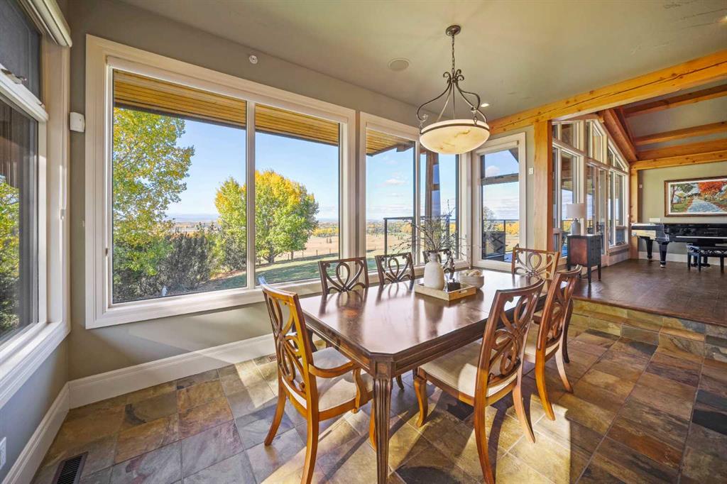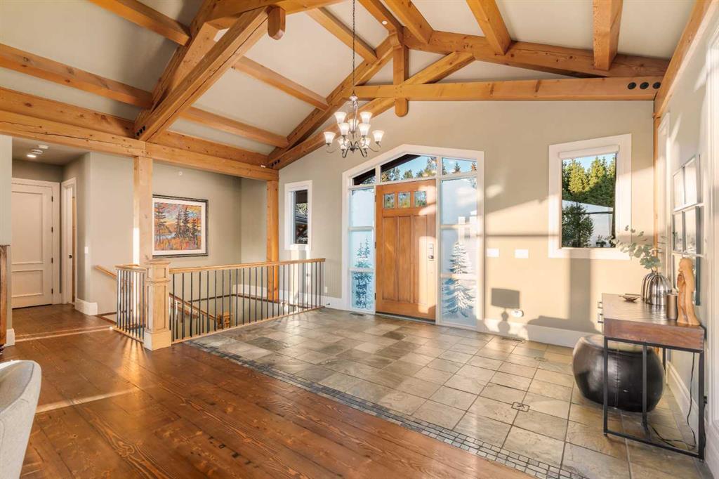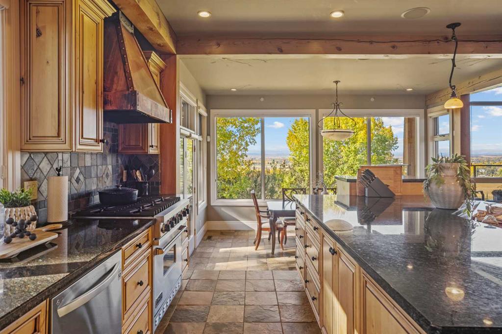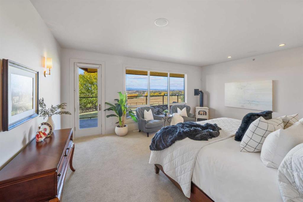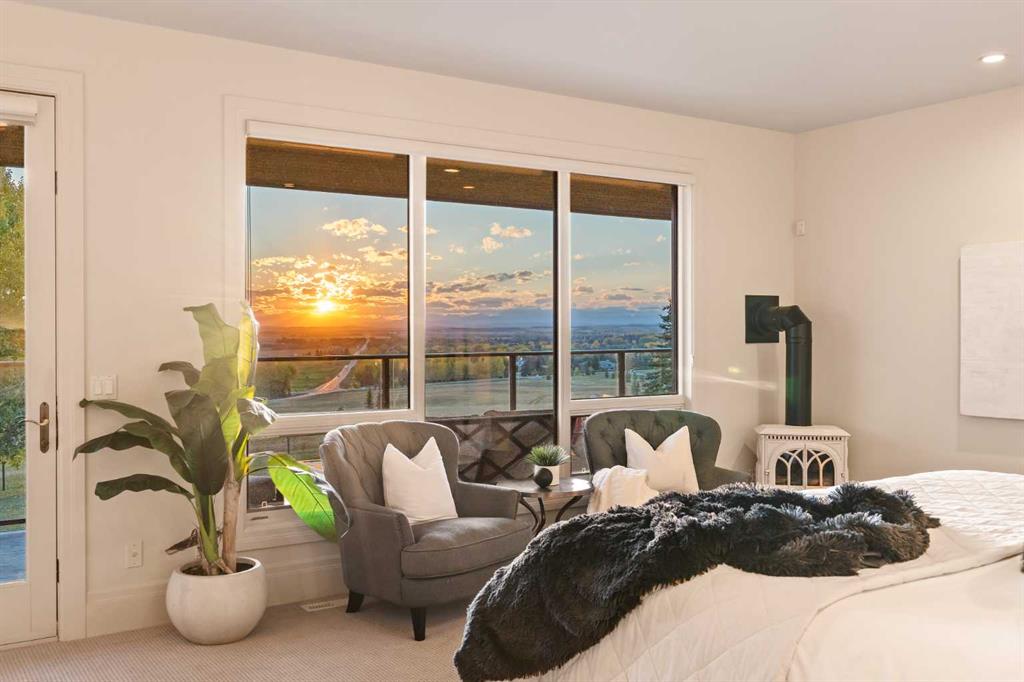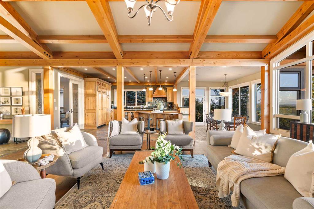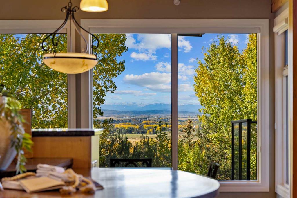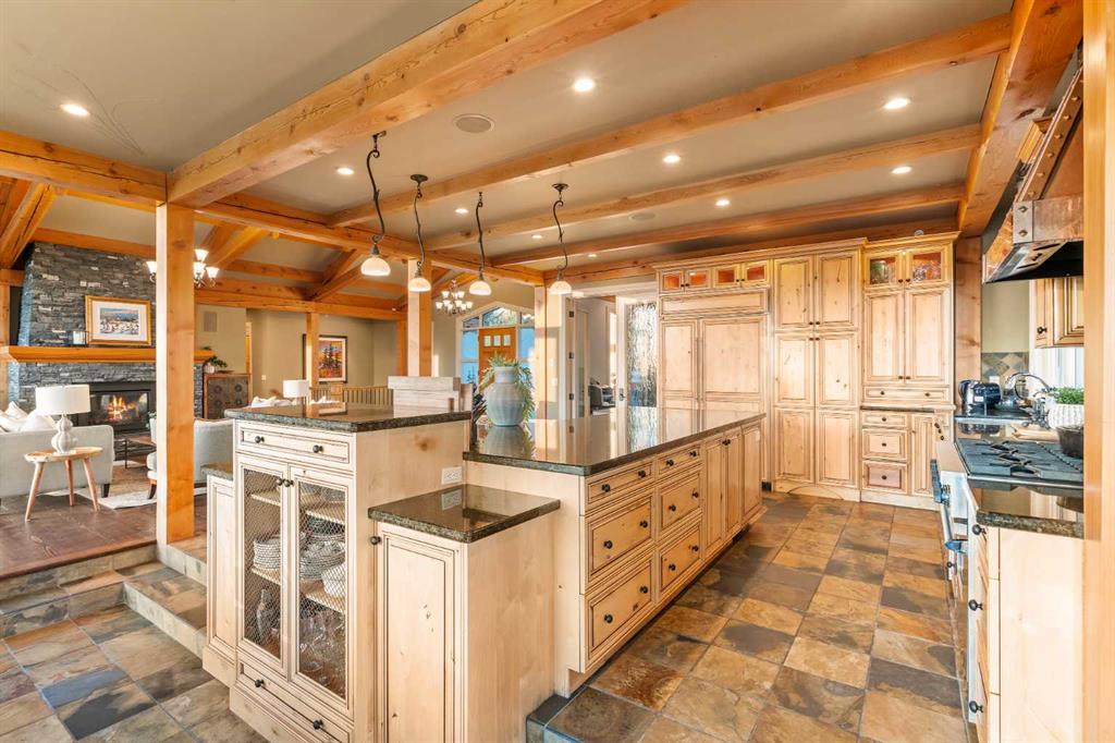 Introducing the Iconic Mountain View Estate – a landmark residence perched high in a premier Springbank location, embodying the very essence of elevated country living. Positioned gracefully on two pristine acres, this mountain-inspired walkout bungalow commands sweeping, unobstructed vistas of the Rocky Mountains, rolling foothills, and ever-changing prairie skies. From tranquil dawns to fiery alpine sunsets and dramatic summer lightning displays, every moment is framed by nature’s grandeur. Blending timeless architecture with authentic natural materials, the home radiates warmth and sophistication. Timber beams, cathedral-style vaulted ceilings, stone, slate, and wide-plank hardwood reflect the surrounding landscape, while wrought-iron details and artistic accents bring character and craftsmanship to every space. Each room is intentionally designed so that every window becomes a picture frame of the mountains set beyond. At the heart of the home, the Great Room creates a lasting impression. Towering timber frames, soaring ceilings, and a dramatic full-height stone fireplace create an atmosphere both grand and inviting. French doors lead to a spacious upper terrace where endless foothill and mountain panoramas inspire gatherings and quiet reflection alike. The chef’s kitchen is equally striking, anchored by a generous island with a curved eating counter, appointed with rich, custom Alder cabinetry, granite counters, and a professional six-burner gas range beneath a hand-crafted copper hood. Designed for both function and beauty, it flows seamlessly into the dining room, which opens onto a private courtyard. Here, an outdoor pergola dining area and lounge centered on a stone-clad fireplace provide an idyllic setting for morning coffee or intimate evening entertaining under the stars. The main level also offers a light-filled private office with French doors, a serene primary suite with spa-inspired finishes, and a well-appointed mudroom and laundry with ample storage. On the walkout lower level, expansive windows and radiant in-floor heating extend the lifestyle year-round. A spacious family/TV room, a custom-built wet bar and games area create space for both relaxation and entertainment. Three additional bedrooms, including one designed as a dual office and gym, are complemented by two full bathrooms. The estate’s grounds are equally considered. A circular front driveway, lined with mature trees and landscaped gardens, creates a true sense of arrival. Multiple outdoor living areas encourage year-round enjoyment, while car enthusiasts and hobbyists will appreciate four oversized heated garage spaces – attached and detached – seamlessly integrated with the architectural design. The Iconic Mountain View Estate is far more than a residence – it is a statement of style and sanctuary. A perfect harmony of mountain-inspired architecture, breathtaking natural beauty, and refined country living – it offers privacy, luxury, and inspiration every day.