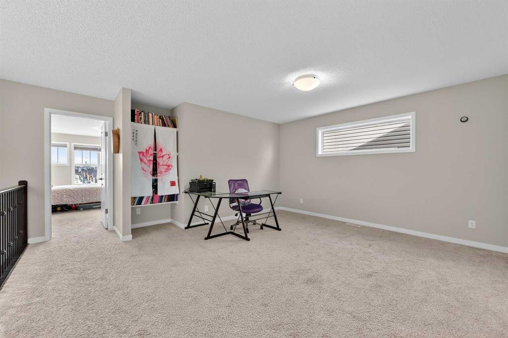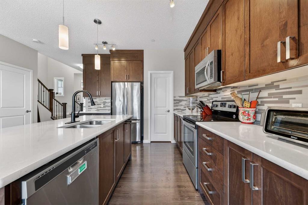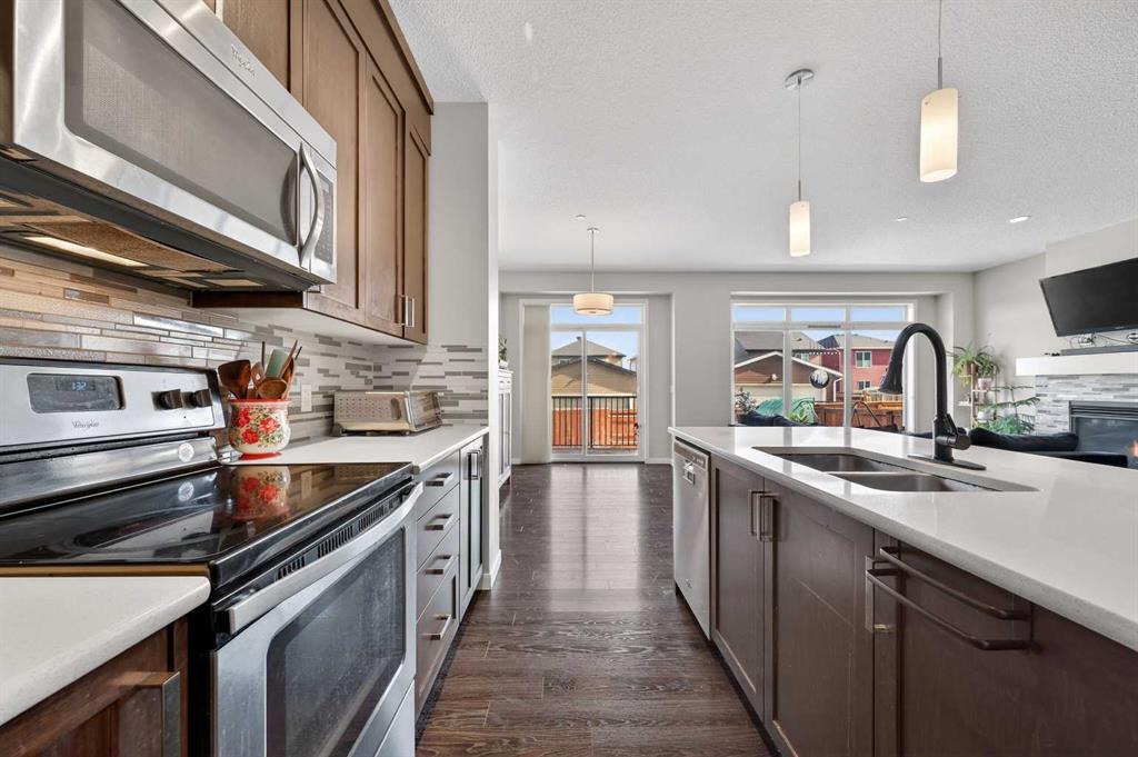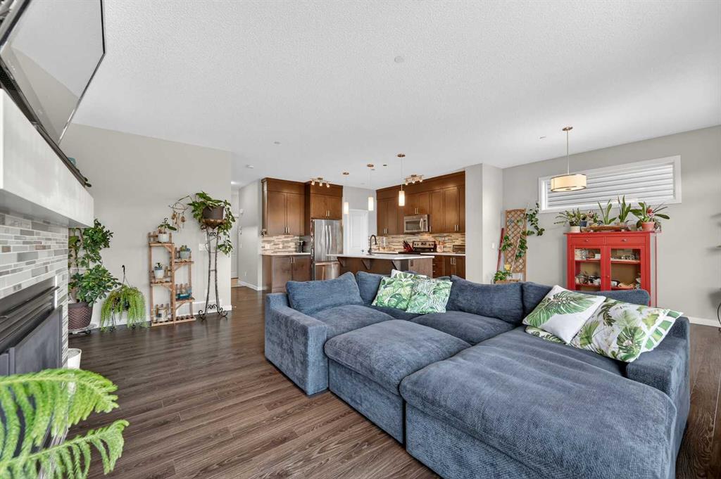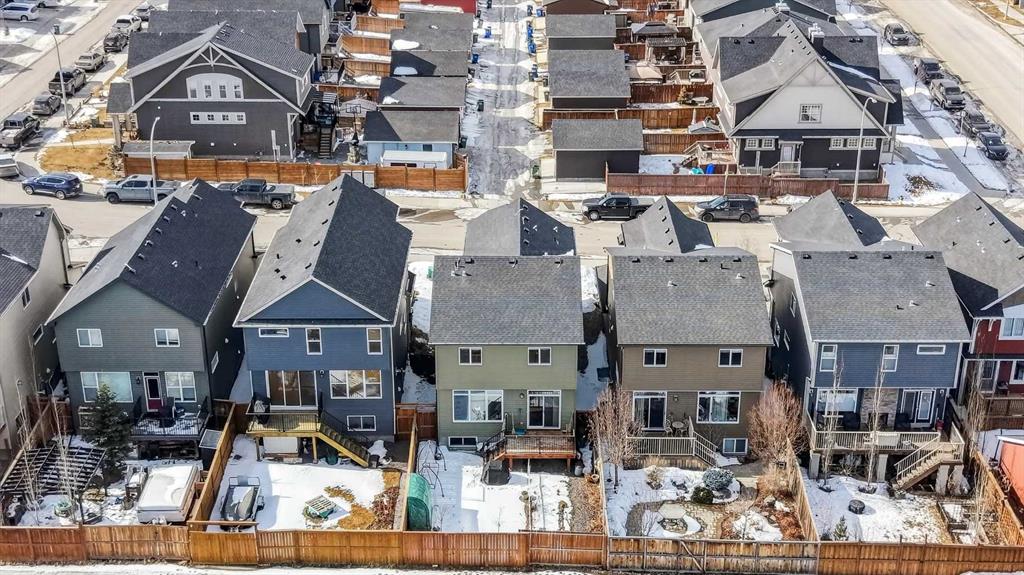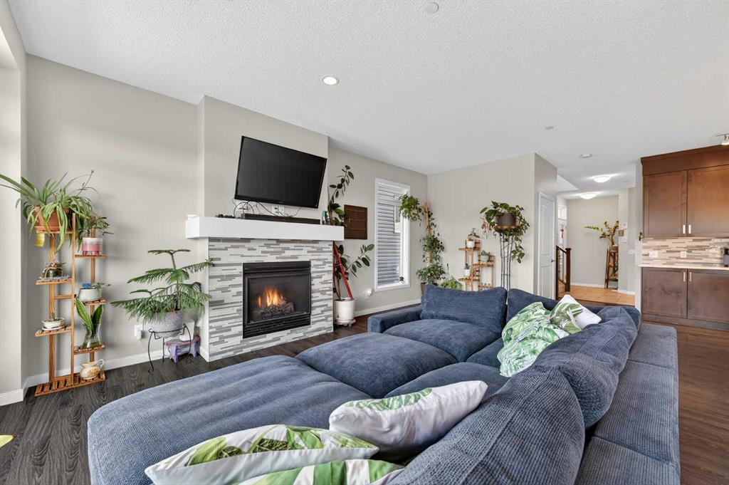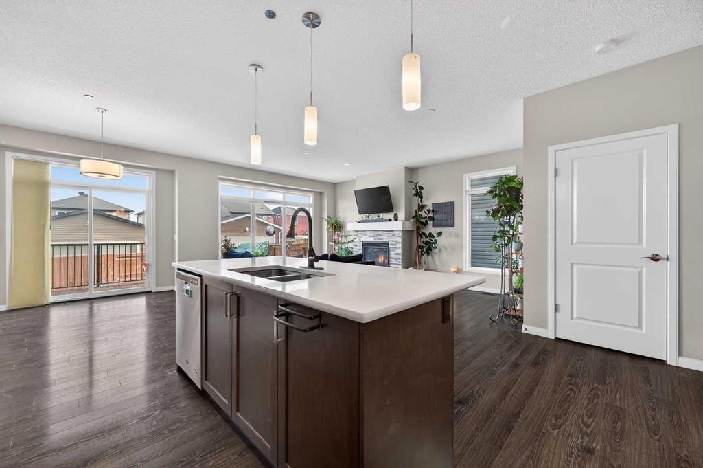 This very well maintained Cochrane 2-storey home in family-friendly Fireside offers over 2,066 square feet of functional above-grade living space designed for modern comfort. Built in 2016, your next home features a smart layout and numerous builder upgrades throughout. The open-concept main floor is anchored by 9-foot ceilings and large windows that fill the space with natural light. The kitchen is a chef’s dream, featuring quartz countertops, a massive island with a breakfast bar, stainless appliances, and a walk-through pantry for effortless organization. Adjacent to the kitchen, the spacious living room is centered around a cozy fireplace and flows seamlessly into the dining area. From here, step out onto the elevated deck to enjoy summer barbecues in the large, fully fenced backyard. A well-appointed mudroom and a 2-piece powder room complete the main level. Upstairs, the family retreat begins with a generous central bonus room that provides a versatile space for a home office, media area, or playroom. The west-facing primary bedroom is a true standout, offering mountain views, a large walk-in closet, and generous 5-piece ensuite with double vanities and a soaking tub. Two additional large bedrooms, a central 4-piece bathroom, plus a dedicated laundry room ensure convenience for the whole family. The undeveloped basement with 8-foot ceilings offers nearly 900 square feet of additional potential for a future recreation room, gym, or guest suite. Practical features include an insulated double attached garage.. Located close to schools, parks, and shopping with easy access to the walking trails and nature that Cochrane is known for. This home is move-in ready and perfectly positioned for your family’s next chapter.