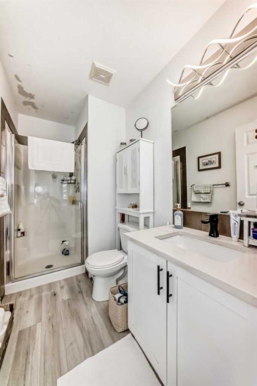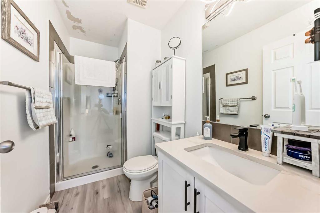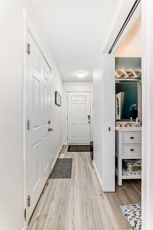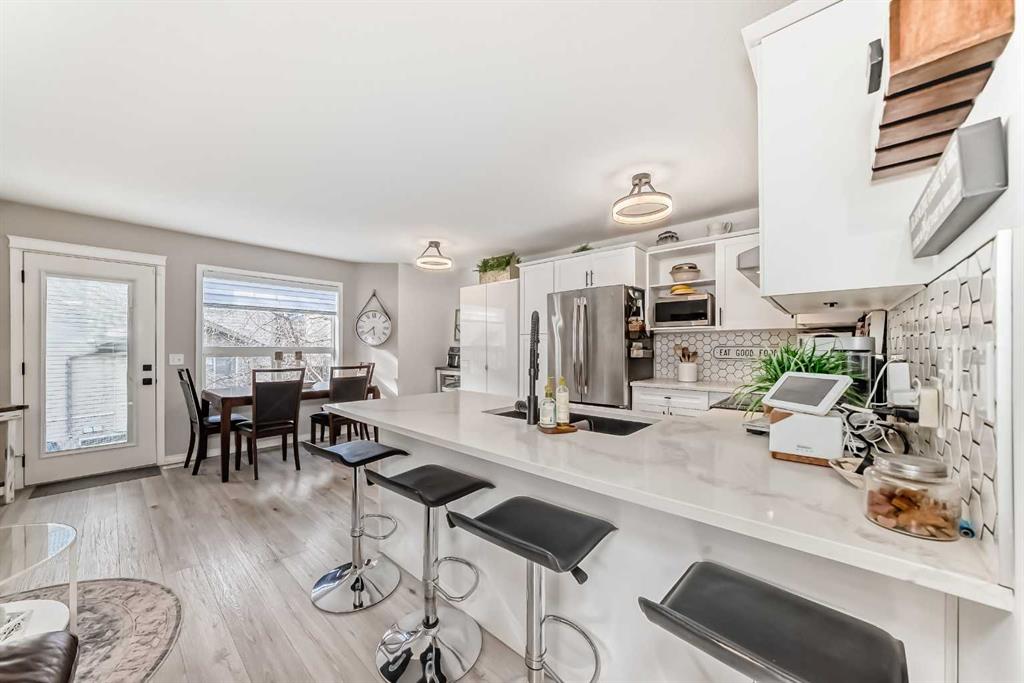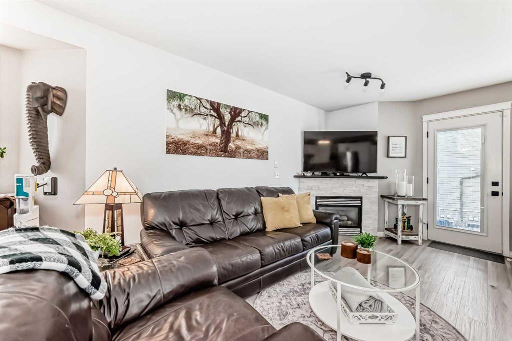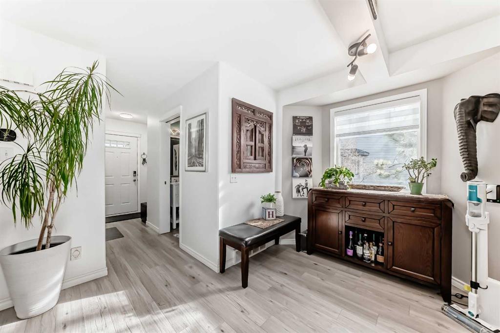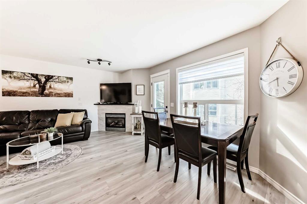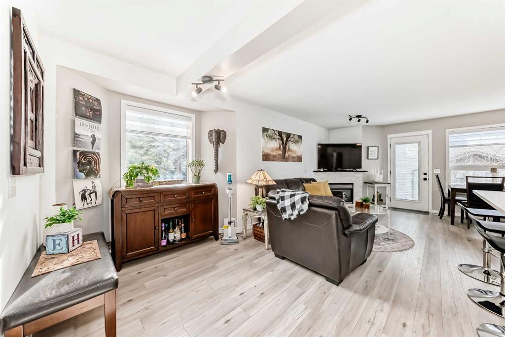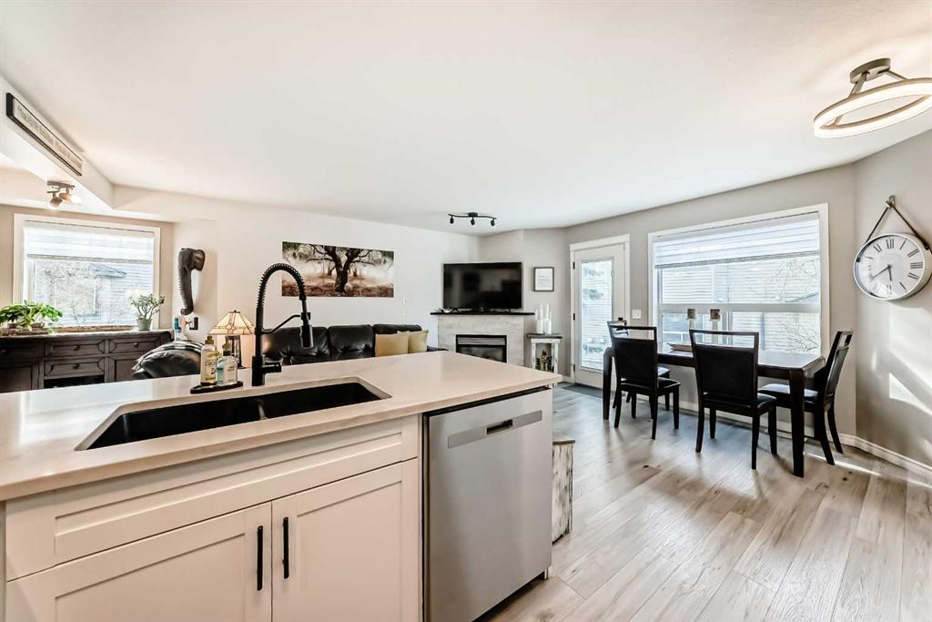The open-concept main floor showcases a bright kitchen with updated white cabinetry, quartz countertops, newer stainless steel appliances, a stylish tile backsplash, and a large pantry. The adjoining living room features a cozy corner gas fireplace, and durable LVP flooring runs throughout the main level. As an end unit, the home is filled with natural light from large south- and west-facing windows. You’ll also find a convenient powder room and direct access to the attached garage on this level.